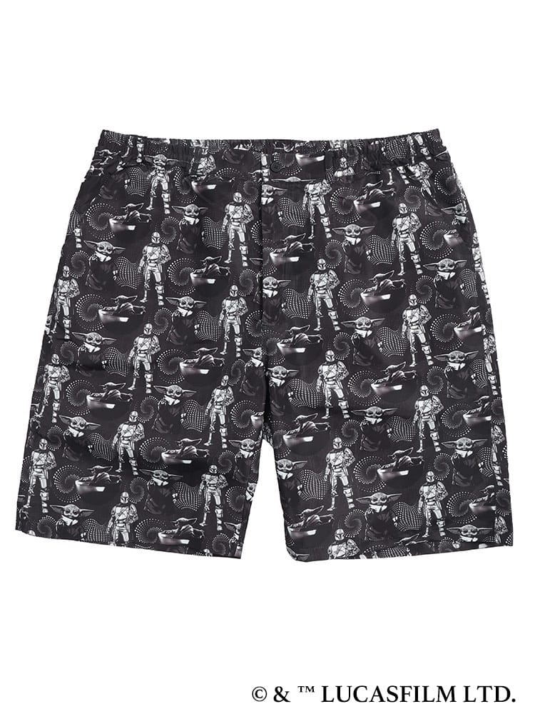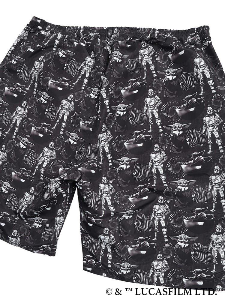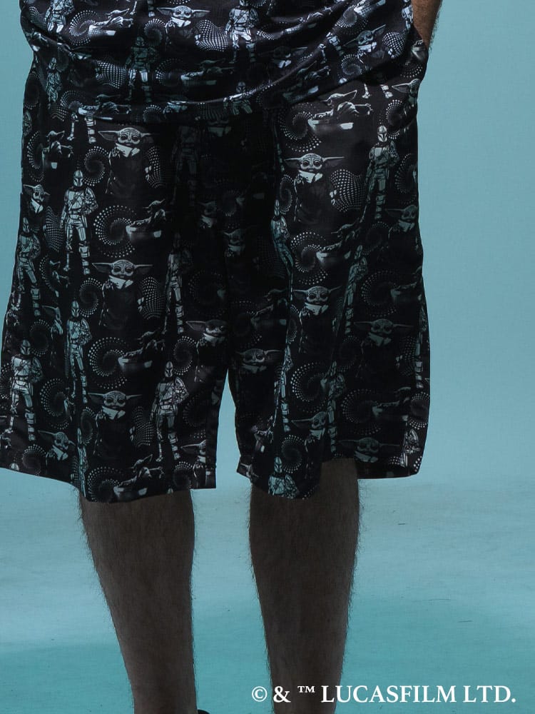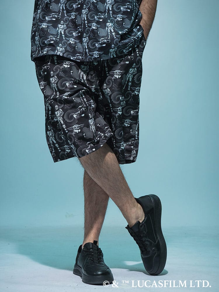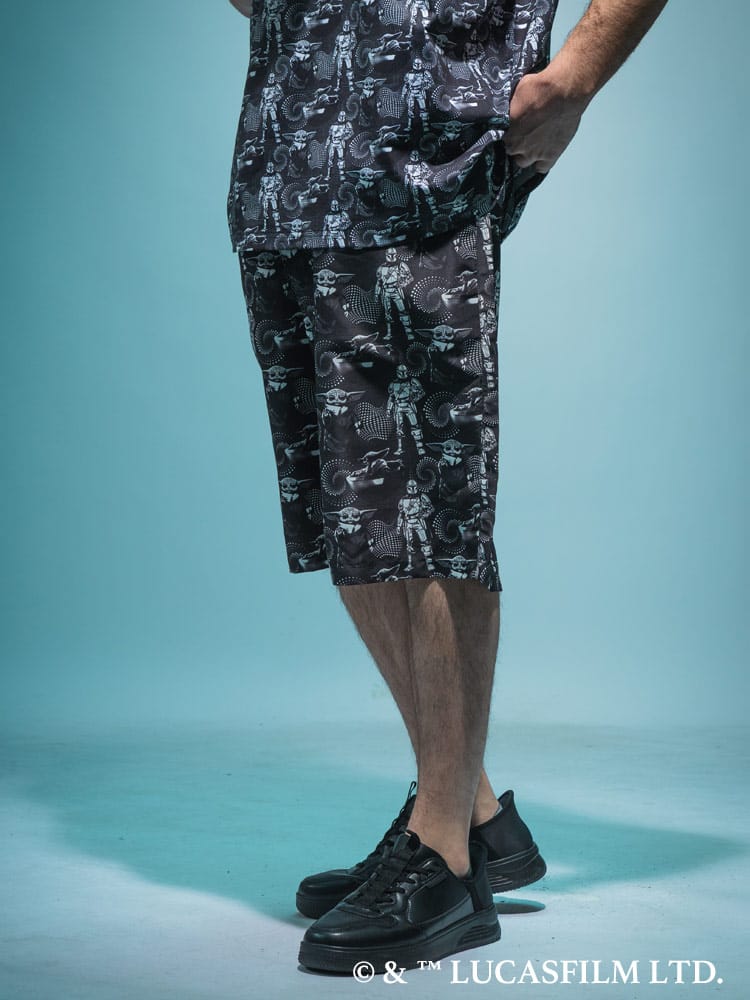 大人気シリーズ「マンダロリアン」のイラストをインパクト抜群にプリントした総柄ショートパンツ。