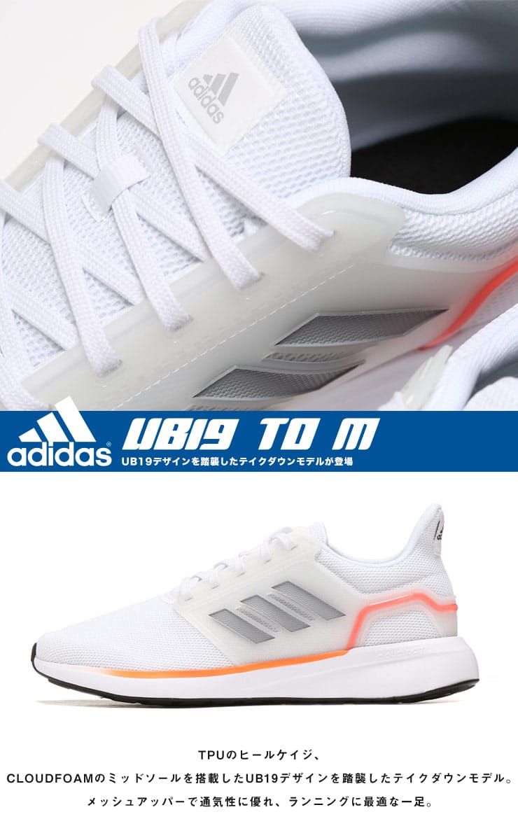 adidasのメッシュ スリーライン スニーカー UB19 TD M。TPUのヒールケイジ、CLOUDFOAMのミッドソールを搭載したUB19デザインを踏襲したテイクダウンモデル。メッシュアッパーで通気性に優れ、ランニングに最適な一足。