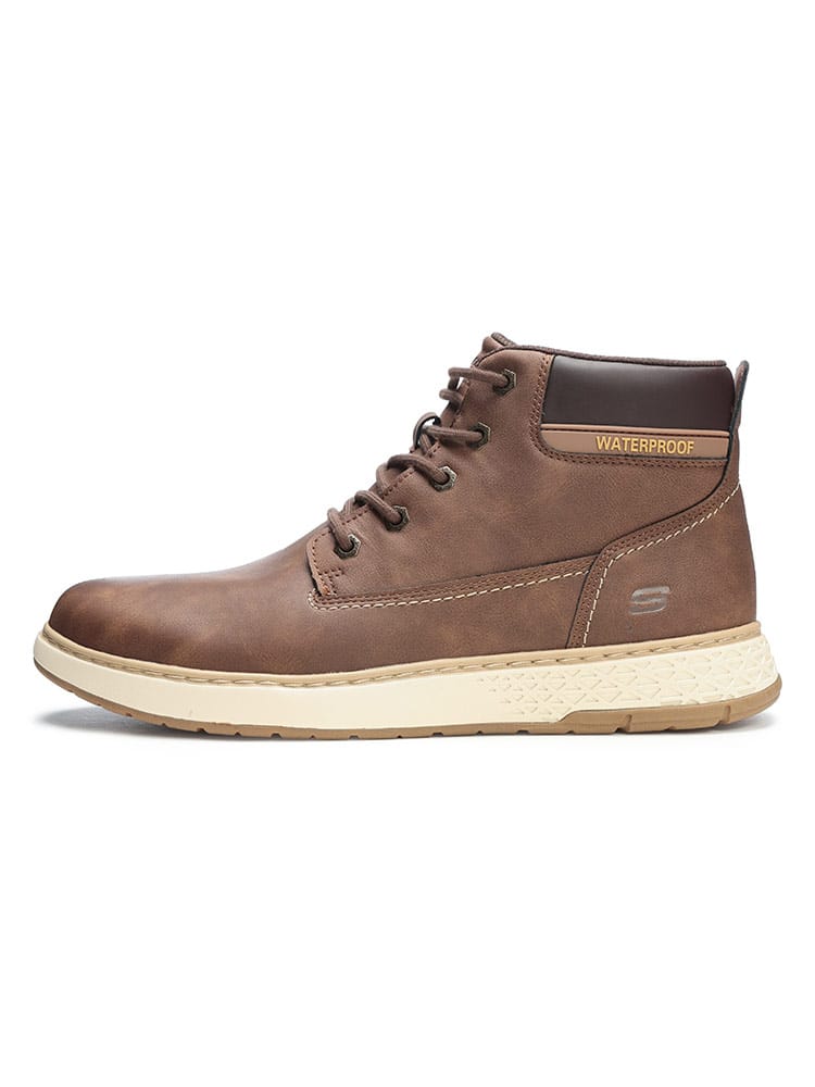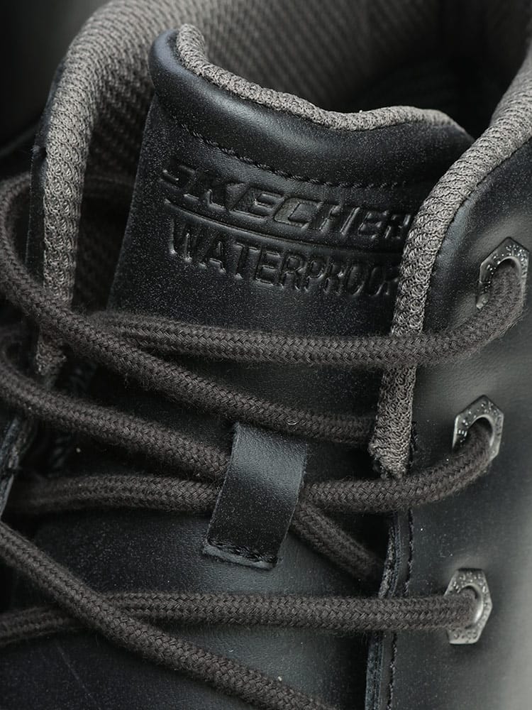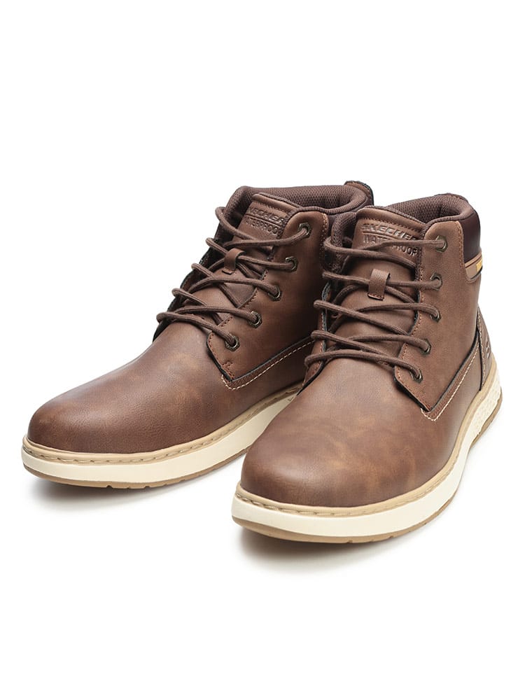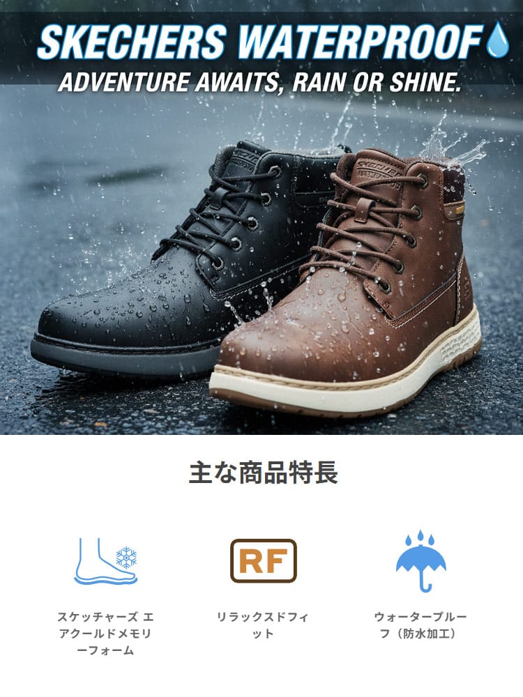 悪天候にも負けないタフな機能性と、スケッチャーズならではの「極上の履き心地」を両立した「GARLAN DENO」。防水加工が施された堅牢なハイカットスタイルは、ブーツの安心感とスニーカーの軽快さを兼ね備えています。最大の魅力は、長時間の歩行を支えるインソール技術です。通気性の高い「Air-Cooled Memory Foam」に加え、土踏まずを確実にサポートする「Goga Mat Arch」を搭載。さらに木炭成分配合により、気になるニオイも抑制します。つま先部分にゆとりを持たせた「リラックスドフィット」設計のため、幅広の方や厚手の靴下を履くシーンでもストレスフリーな着用感を実現しました。動物由来成分を含まないヴィーガン仕様も現代的なポイント。アウトドアからタウンユースまで、全天候で頼れる一足です。