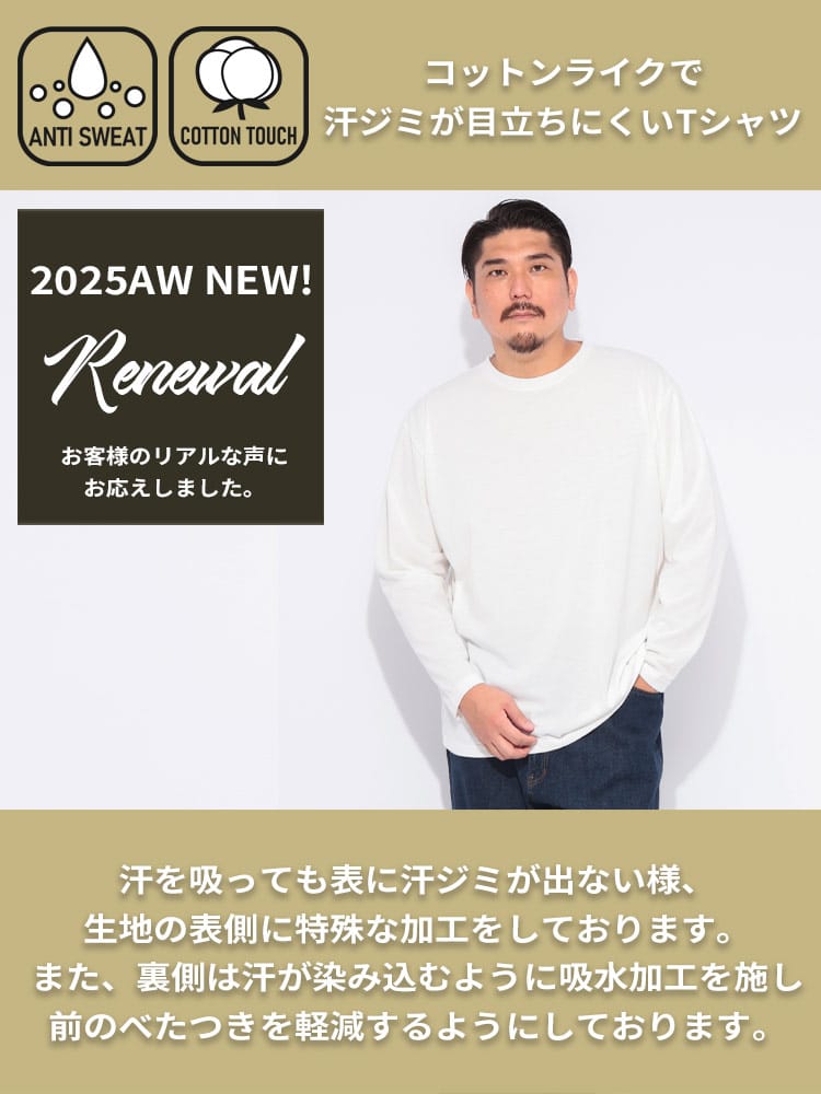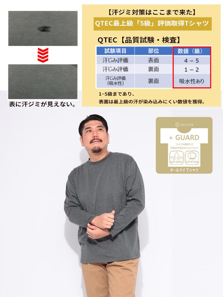 汗染みを気にせず、一日中快適に過ごしたいあなたに。B&T CLUBの「オールマイTシャツ+GUARD」は、頼れる汗染み軽減機能を搭載した高機能長袖Tシャツです。しっかりとした厚手の生地は、繰り返し着用してもへたりにくいタフな作り。やわらかなコットンタッチの風合いで、肌触りも抜群です。クルーネックのシンプルなデザインは、カジュアルからきれいめまで幅広いスタイルにマッチ。一枚で主役としても、レイヤードスタイルにも活躍します。大きいサイズもご用意しました。汗をかいても目立ちにくいから、大切なビジネスシーンからアクティブな休日まで、どんな場面でも自信を持っておしゃれを楽しめます。