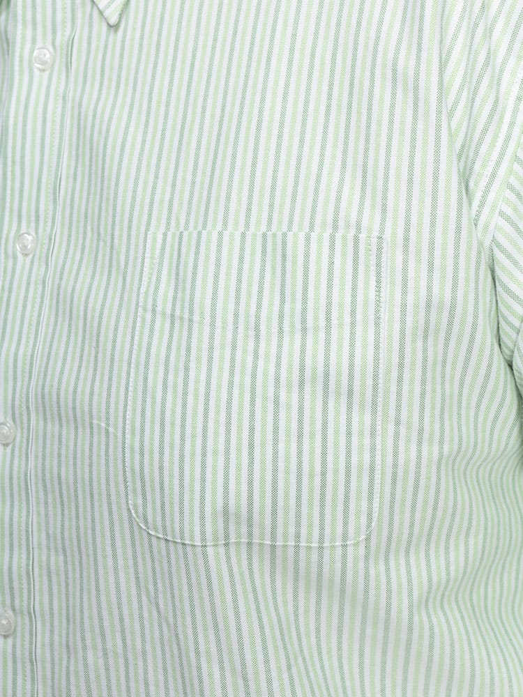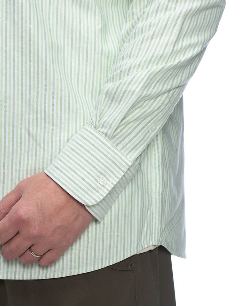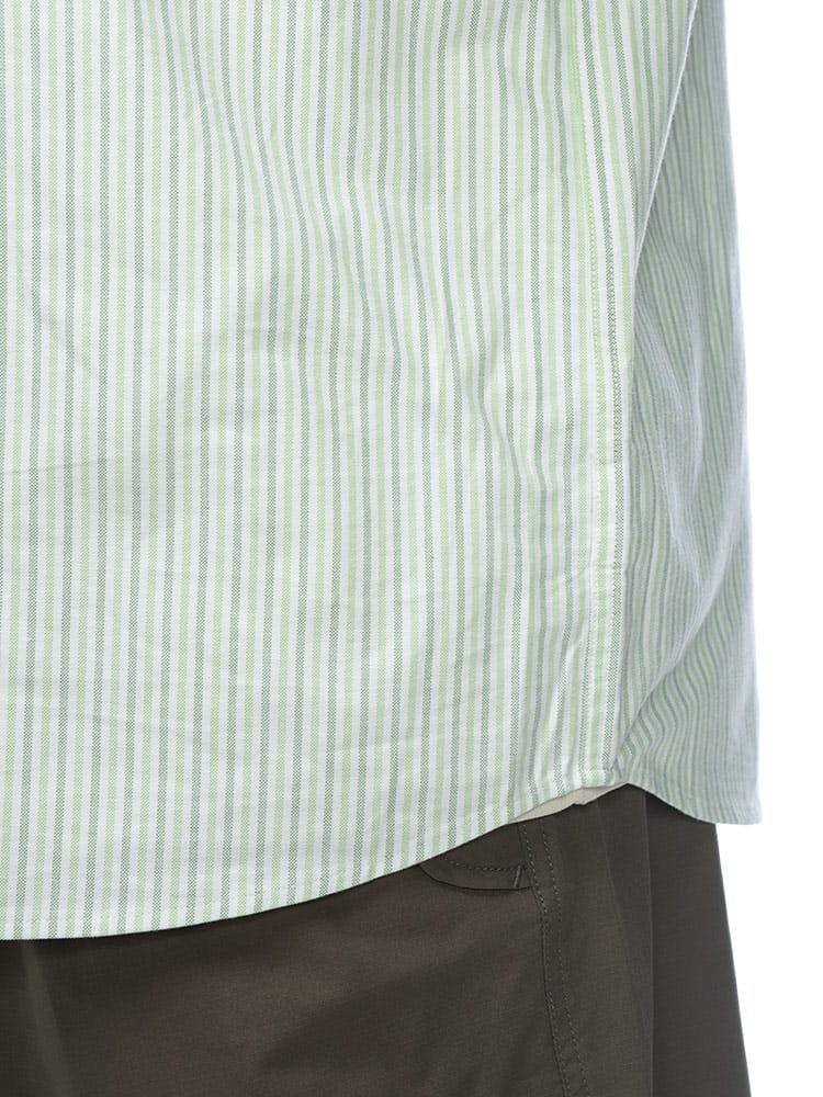 このシャツの魅力は、まず天然素材の綿100%オックスフォード生地を使っている点にあります。