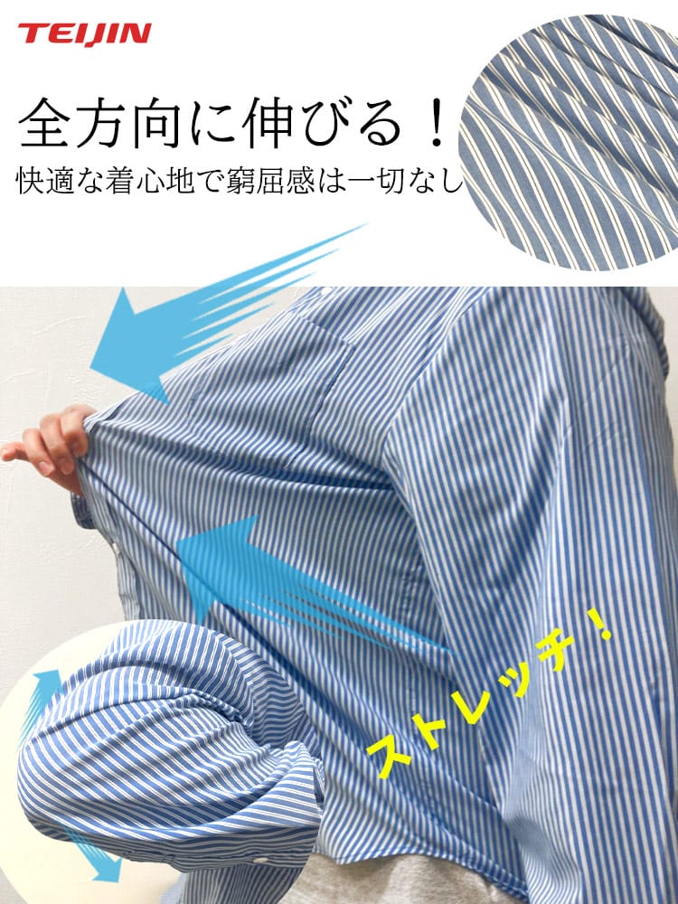 2. 洗濯後もシワになりにくい「形態回復性」 「シャツのアイロンがけが面倒…」そんな悩みも解決。優れた形状記憶性により、洗濯して干すだけでパリッとした風合いが復活。忙しい朝の時短を叶えるノーアイロン仕様です。