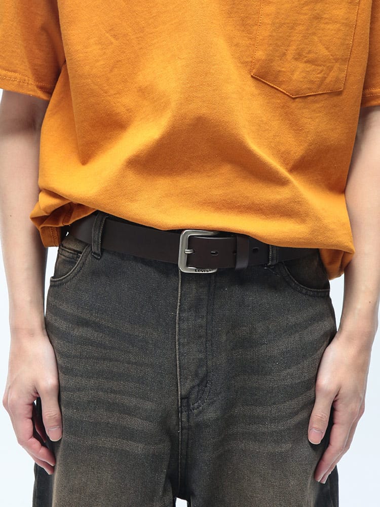 ボトムスのパートナーとして欠かせない、デニムの王道「Levi's」のアイコニックなベーシックベルト。素材には重厚感のある牛床革を使用し、使い込むほどに馴染む質感が魅力です。無駄を削ぎ落としたミニマルなデザインは、カジュアルなデニムスタイルから、チノパンを合わせたビジネスカジュアルまで、幅広いコーディネートを引き締めます。機能面では、バックル部分を外してカットできる「噛み合わせ留めタイプ」を採用。ご自身の体型に合わせてミリ単位での長さ調節が可能なため、サイズ選びの不安がなく、ギフトとしても大変喜ばれる仕様です。程よい幅と厚みのレザーは耐久性も高く、デイリーユースに最適。バックルに刻まれたさりげないロゴが、歴史あるブランドの誇りを感じさせます。トレンドに左右されず、長く愛用できる「大人の定番」として持っておきたい一本です。