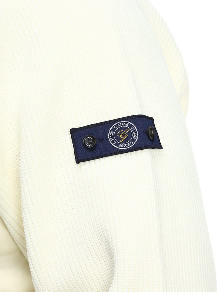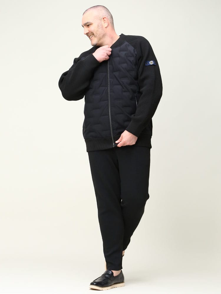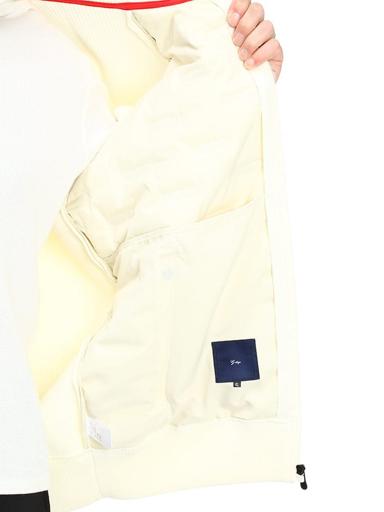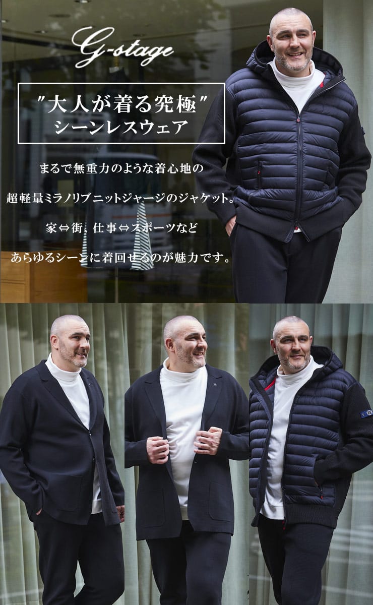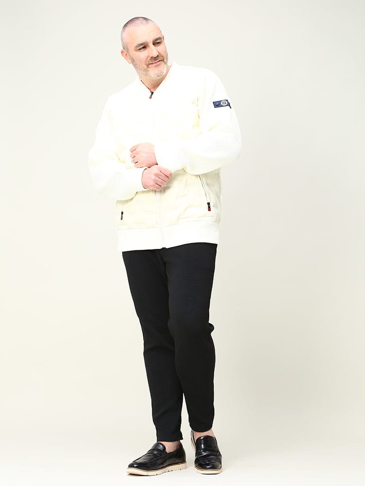 異素材使いのデザインを採用することで、普段のカジュアルシーンからゴルフなどのスポーツシーンにも着回せるMA-1型ブルゾンです。ネック部分、袖・裾口はリブ仕様で、スポーティーでアクティブな雰囲気に仕上げています。羽織るだけで大人のミリタリーテイストを演出できます。前身頃には700フィルパワーのダウン入りポリエステル素材を使用しています。ダウン部分はシームレス加工を施しています。袖と後身頃は、7ゲージのニット素材で切り替えています。身体のラインを拾わない余裕のあるシルエットです。リラックス感がありながら、ショート丈ですっきりと着ていただけます。
