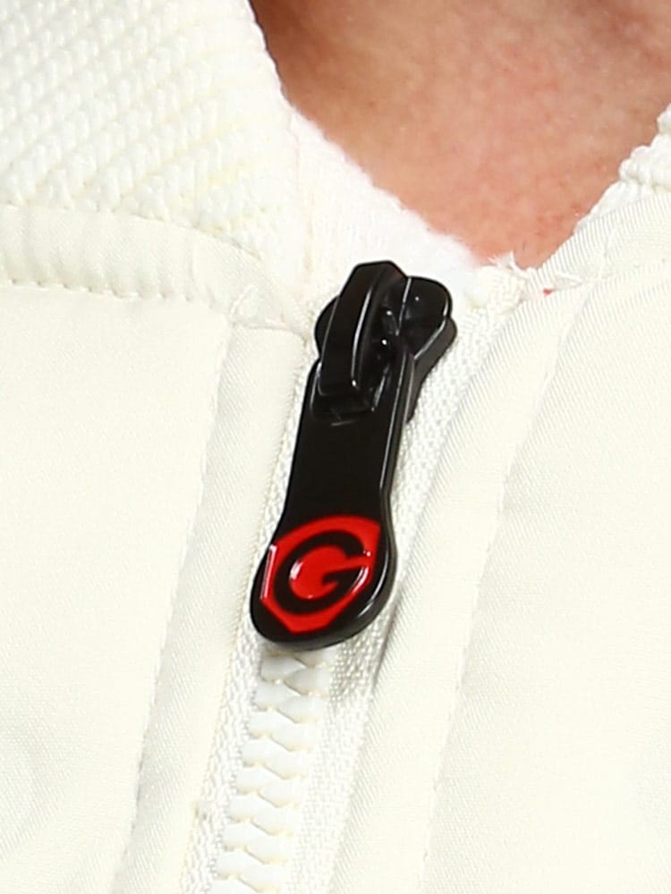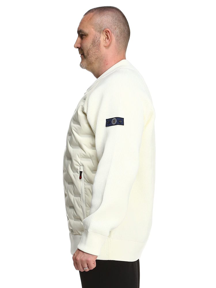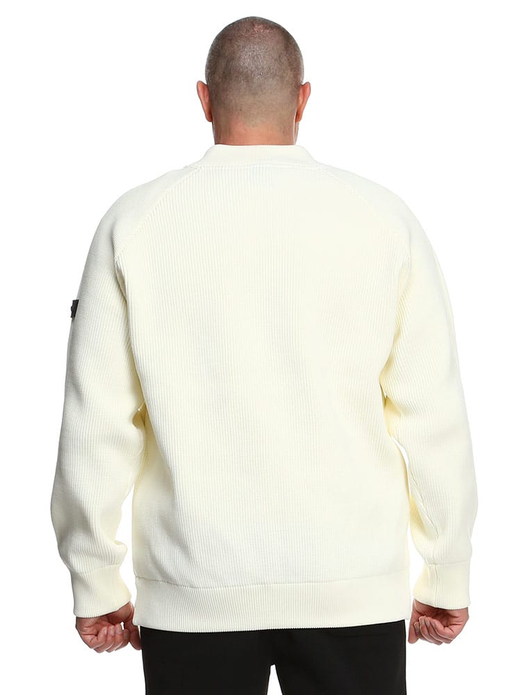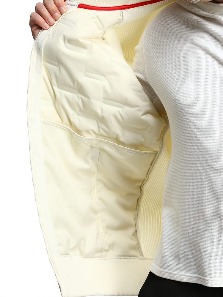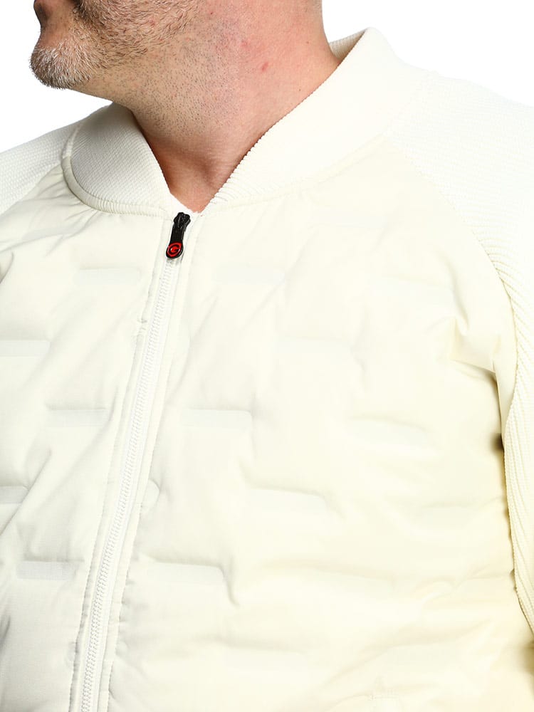 異素材使いのデザインを採用することで、普段のカジュアルシーンからゴルフなどのスポーツシーンにも着回せるMA-1型ブルゾンです。ネック部分、袖・裾口はリブ仕様で、スポーティーでアクティブな雰囲気に仕上げています。羽織るだけで大人のミリタリーテイストを演出できます。前身頃には700フィルパワーのダウン入りポリエステル素材を使用しています。ダウン部分はシームレス加工を施しています。袖と後身頃は、7ゲージのニット素材で切り替えています。身体のラインを拾わない余裕のあるシルエットです。リラックス感がありながら、ショート丈ですっきりと着ていただけます。