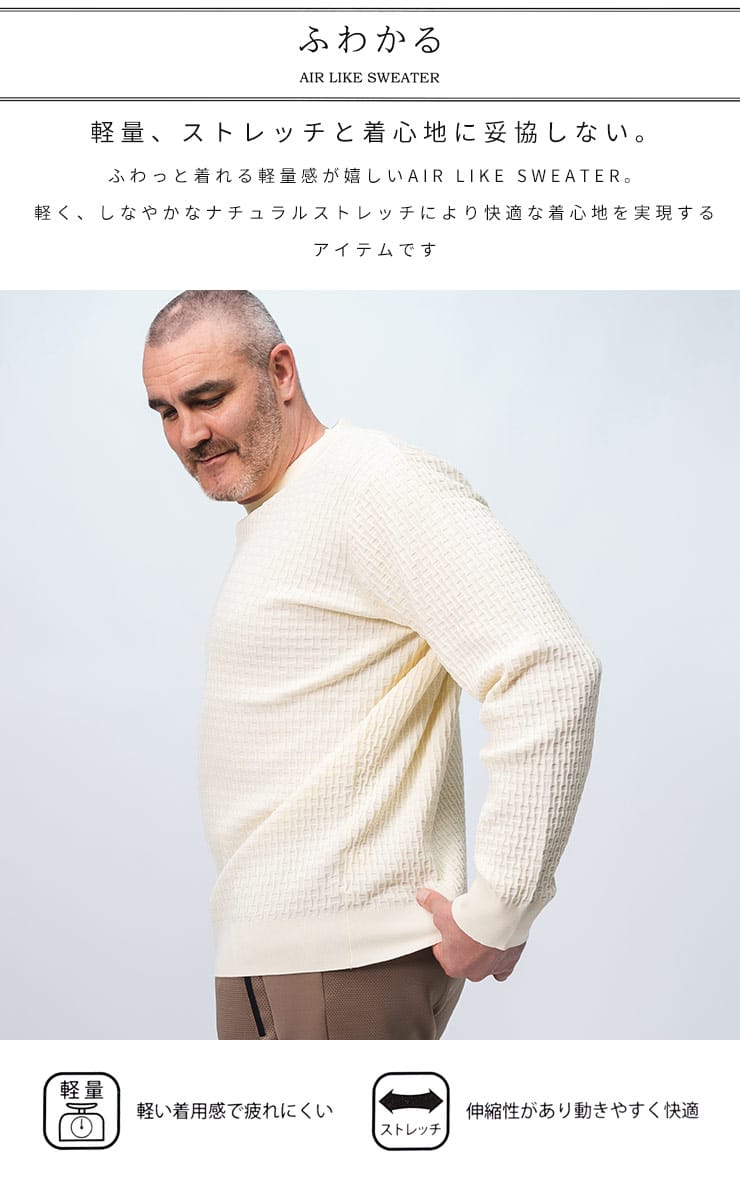 ストレッチ軽量ブリスター ニットセーターは、快適さと機能性を兼ね備えた一枚です。ストレッチ素材で動きやすく、軽量設計により長時間の着用でも疲れません。ブリスター加工が施されたニット生地は、独特の立体感と柔らかい肌触りを提供。シンプルなデザインで、カジュアルからきれいめスタイルまで幅広く対応可能。