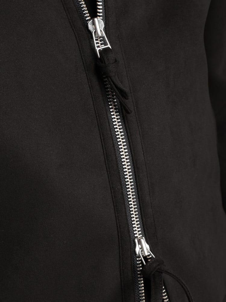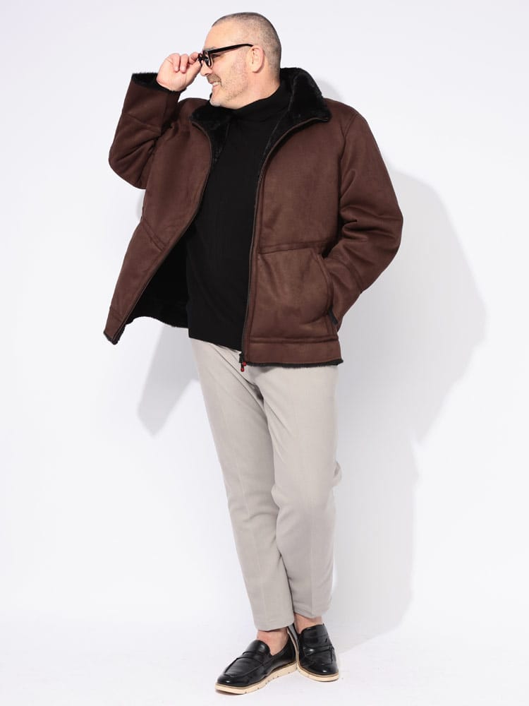 スウェード調素材を使用し、エレガントな質感が特徴のフェイクムートンジャケットです。衿にはベルトが付いており、スタイリッシュさと防寒性を兼ね備えたデザイン。軽量ながら暖かく、快適な着心地を提供します。落ち着いたカジュアルスタイルを演出する一着で、冬のコーディネートにぴったりのジャケットです。
