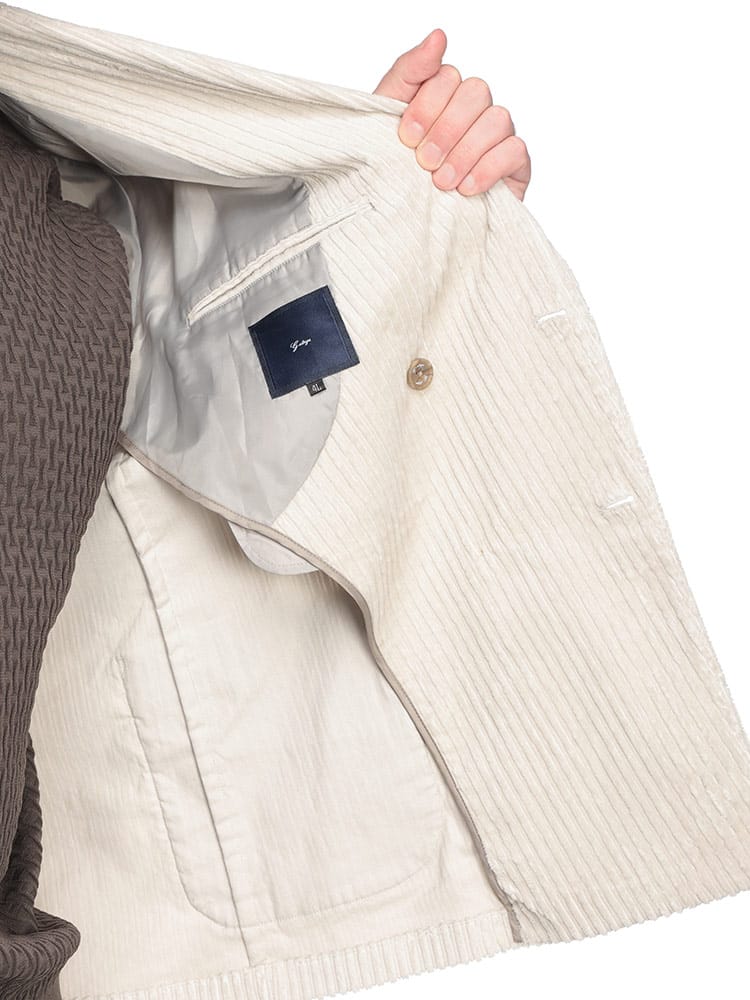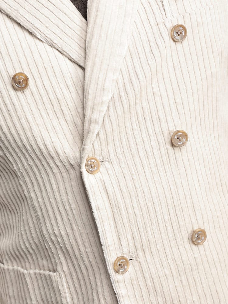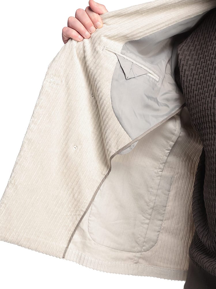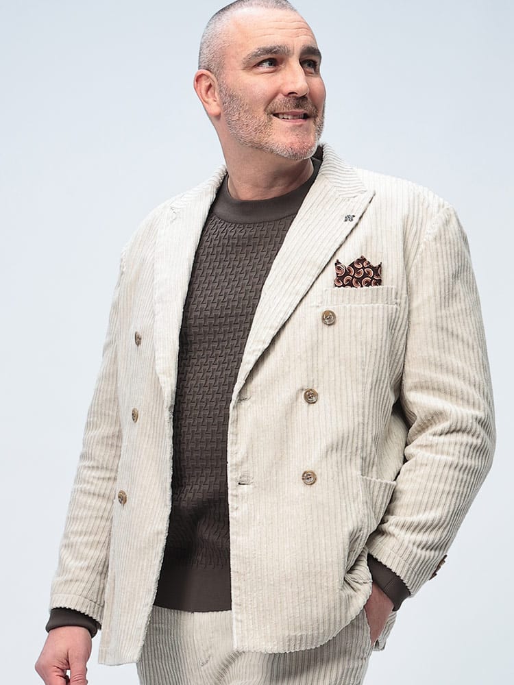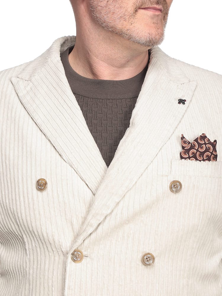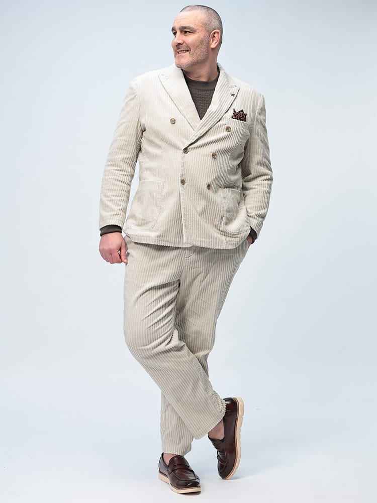 G-STAGEより、上質なコーデュロイ素材を使用した、着心地抜群のダブルジャケットが登場。ストレッチ性のある綿混素材が、身体の動きに優しくフィットし、快適な着心地を実現。裏地はポリエステルと綿100%の2種類を使用し、耐久性と通気性を両立させました。上質なコーデュロイで温かみのある風合いと、上品な光沢感。ストレッチ性で抜群の着心地と動きやすさ。ダブルブレストでフォーマルな印象と大人の風格。チーフ付きでワンランク上のスタイリング。多機能ポケットは外ポケット3つ、内ポケット2つ。ブランド名刻印されたボタンで高級感を演出。