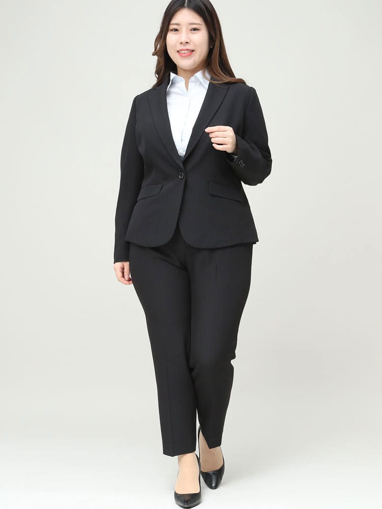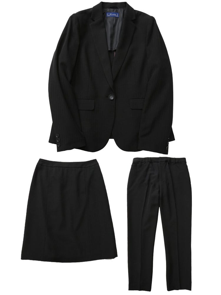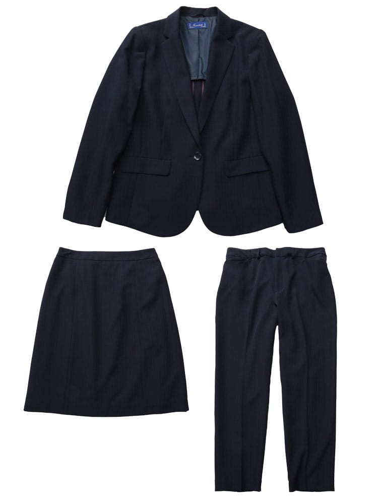 ジャケット、スラックス、スカートのスーツ3点セットです。ベーシックなノッチラペルタイプのジャケットをメインに、その日の気分によってスラックススタイル、スカートスタイルを切り替えて使える便利なスーツセットです。落ち着いたシャドーストライプはビジネススタイルの定番シルエット。ウォッシャブルタイプなのでご家庭で洗濯できる簡単ケアが魅力。