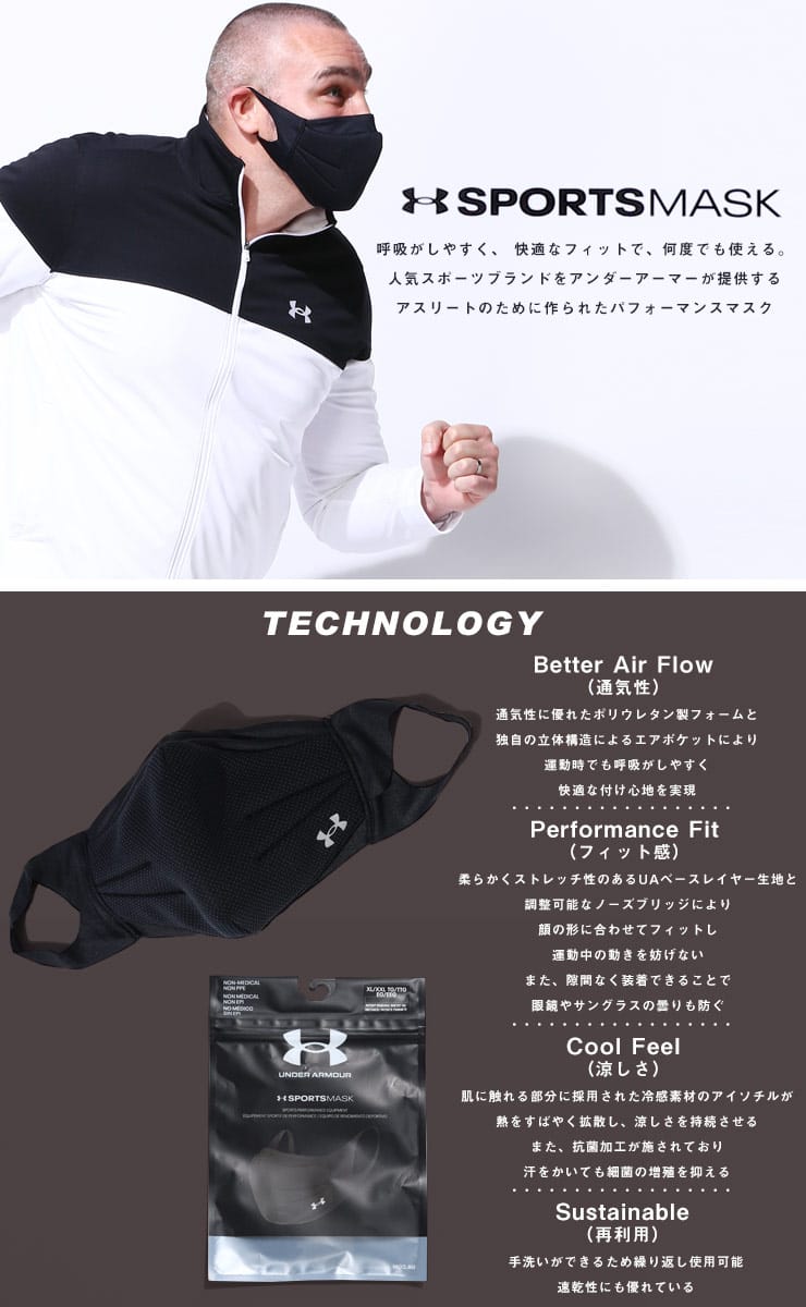 UNDER ARMOURのドライ 洗える 冷感 スポーツ マスクです。アスリートのために作られたパフォーマンスマスク。呼吸がしやすく、快適なフィットで、スポーツに最適。通気性に優れたポリウレタン製フォームと独自の立体構造によるエアポケットにより、運動時でも呼吸がしやすく快適な付け心地を実現。柔らかくストレッチ性のあるUAベースレイヤー生地と調整可能なノーズブリッジにより、顔の形にフィットし運動中の動きを妨げません。また、隙間なく装着できることで眼鏡やサングラスの曇りも防ぎます。肌に触れる部分に採用された冷感素材のアイソチルが熱をすばやく拡散し、涼しさを持続させる。また、抗菌加工が施されてるので汗をかいても細菌の増殖を抑えます。手洗いが出来るので繰り返し使用できます。速乾性にも優れています。収納ポーチ付き。