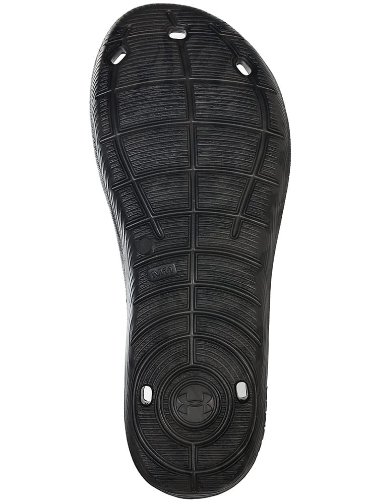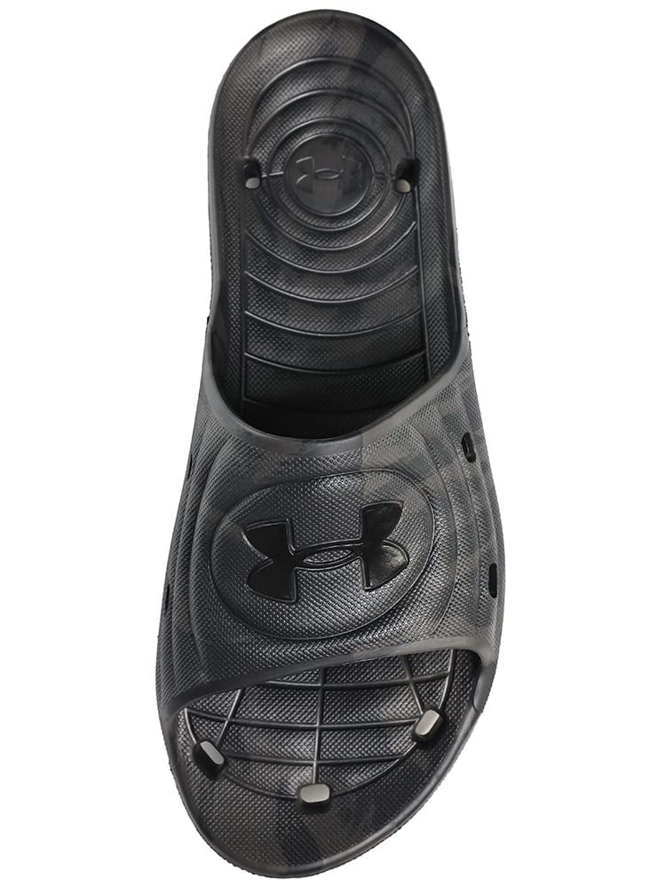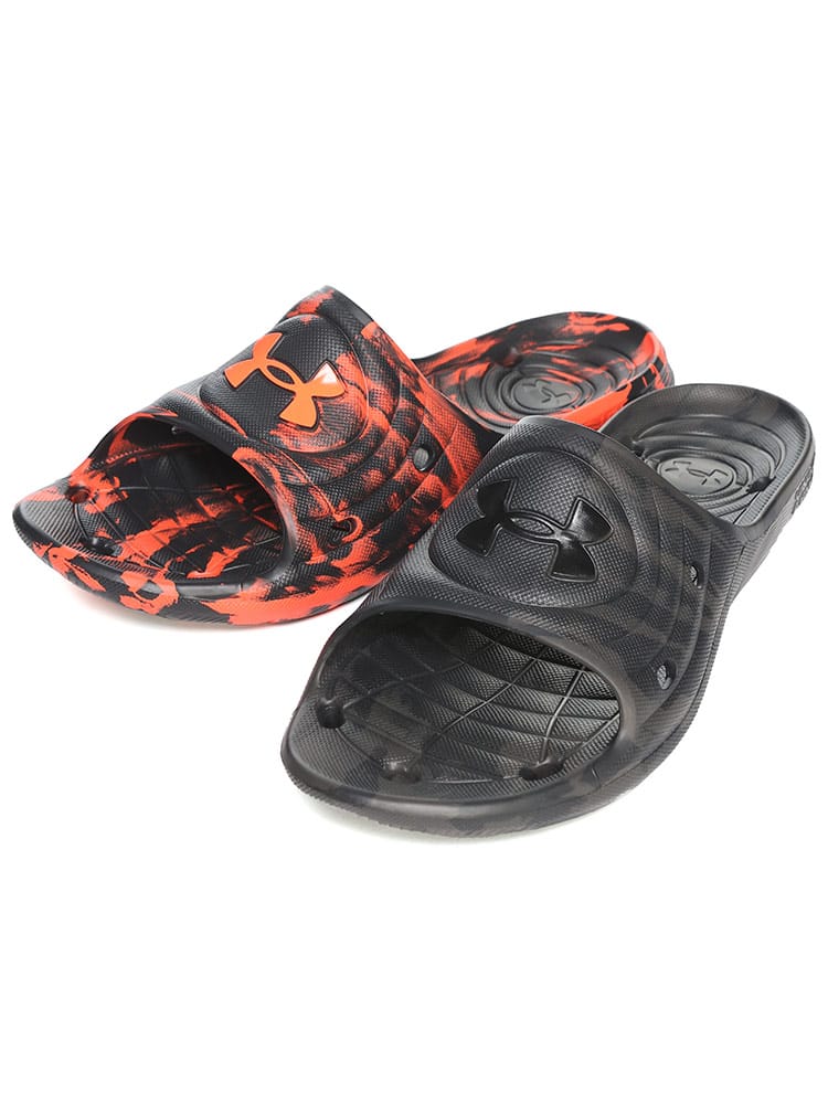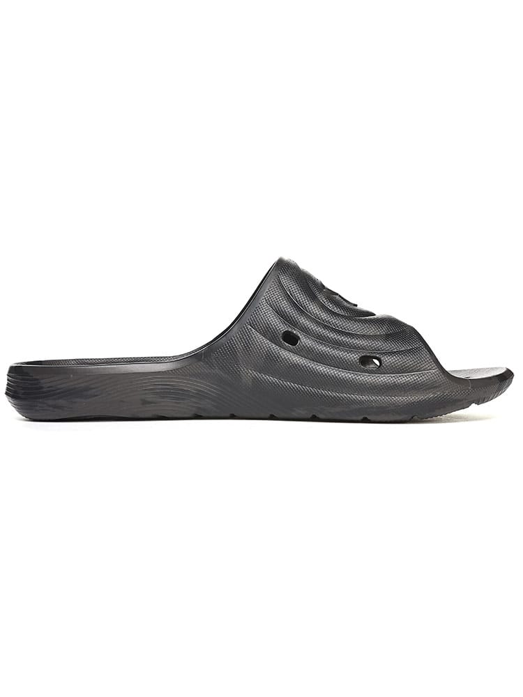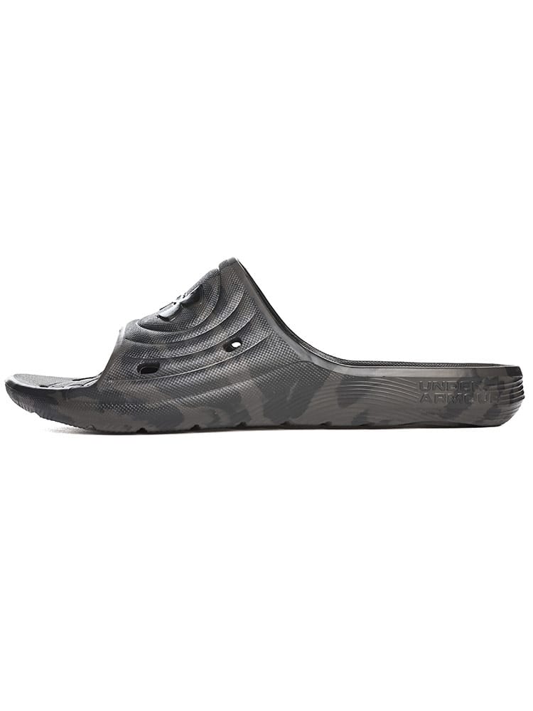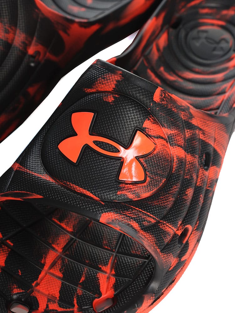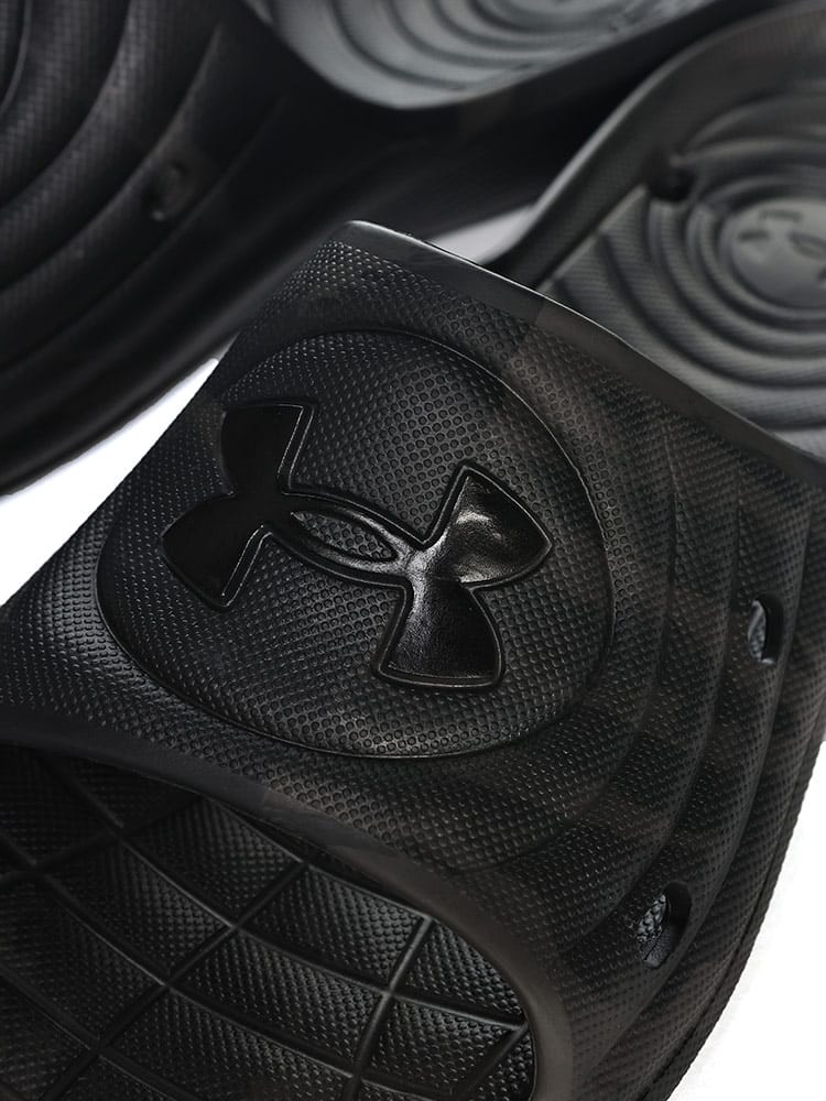 ロッカールームはもちろん、高い排水性を考慮した設計で、プールサイドでの使用にも最適なUAロッカースライド。EVAで一体成型された速乾性パフォーマンススライド。高い排水性を考慮した設計。ロッカールームやプールサイドで特に性能を発揮。レギュラーFIT。