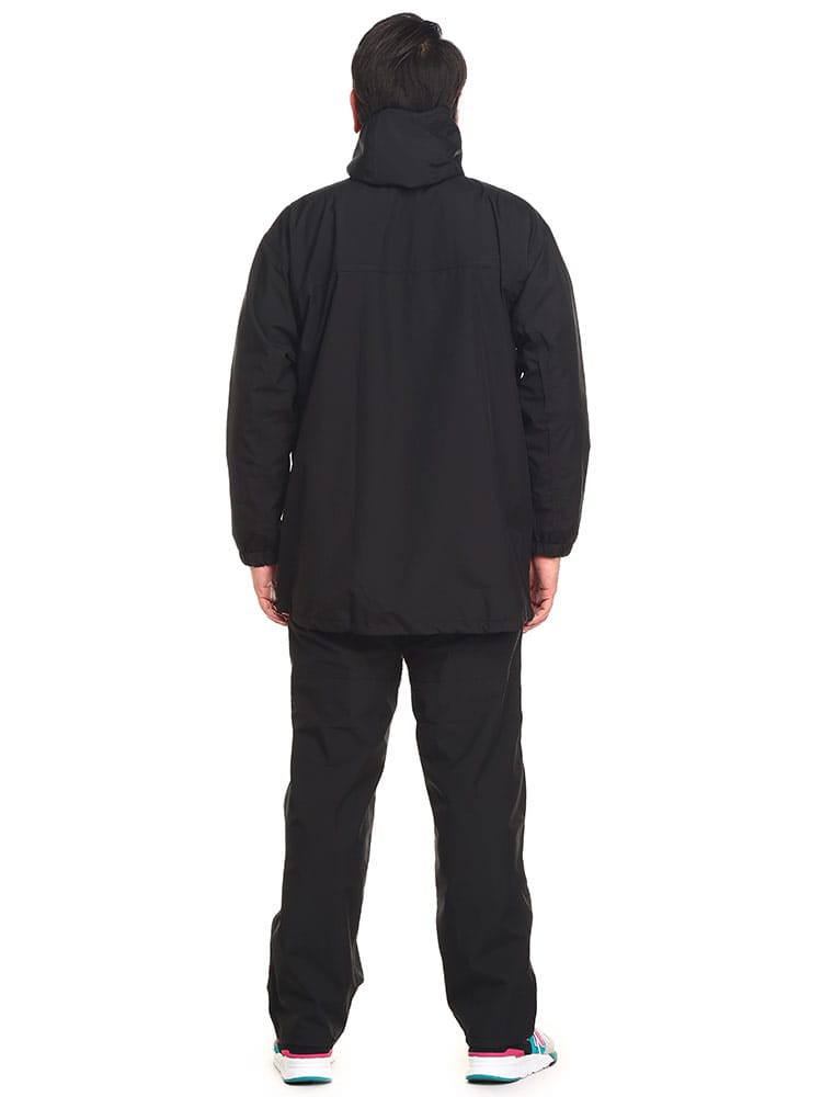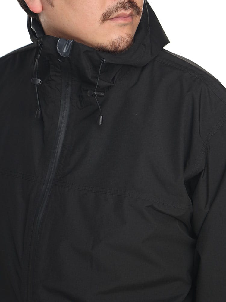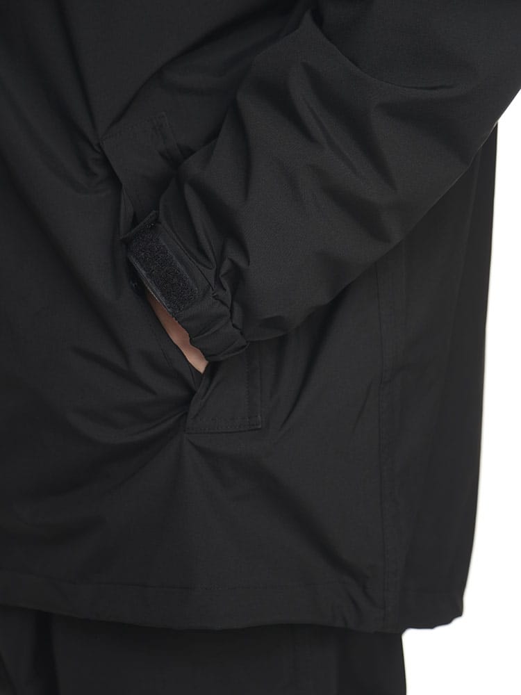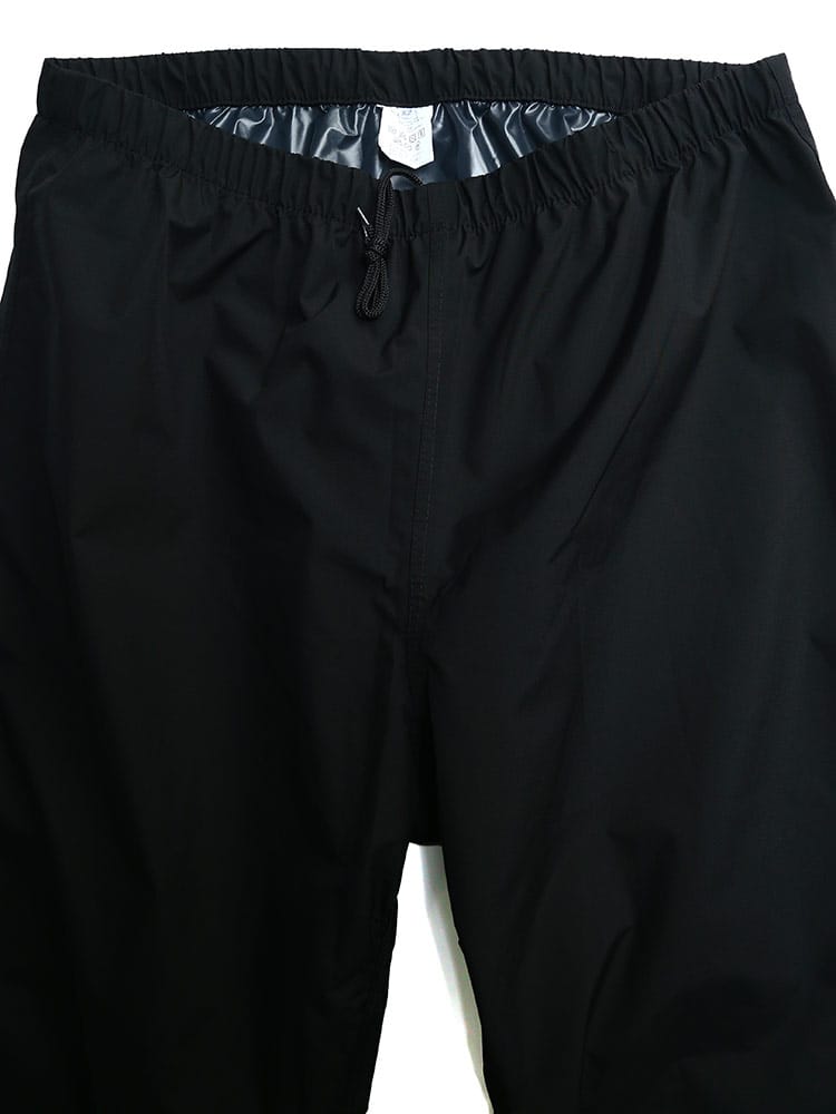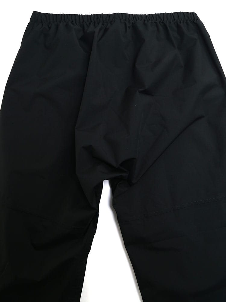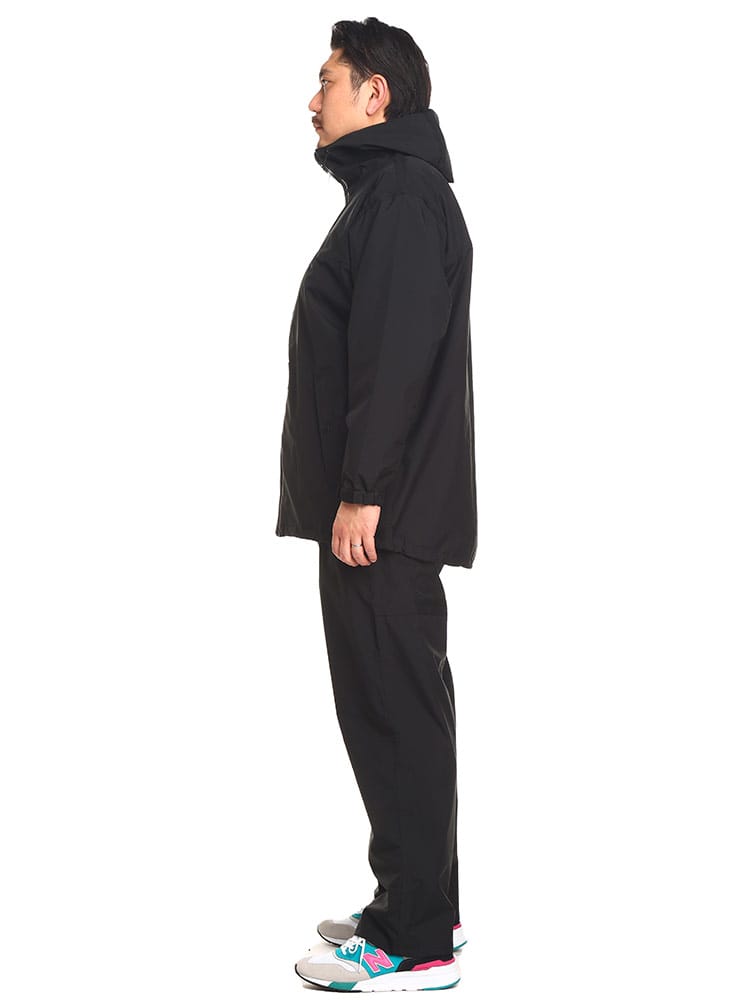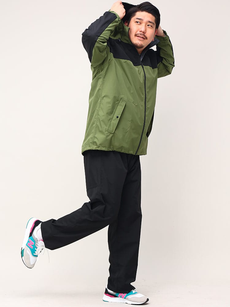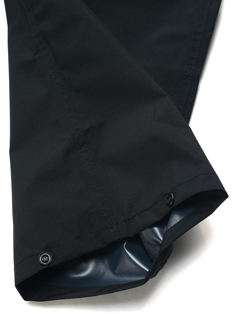 ストレッチレインスーツです。透湿・防水素材を使用したレインスーツ。上着の裾にはドローコードがついているのでフィットした着用感に調節することができます。またパンツはウエストゴムとドローコードによる腰周り調整。くわえて裾にはボタンが配され、幅を絞ることができるつくりとなっています。
