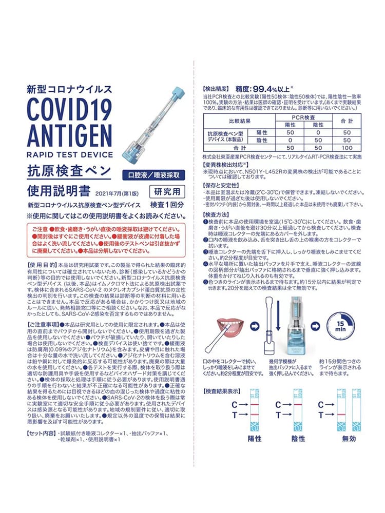 【注意事項】※本品は研究用試薬です。この製品で得られた結果の臨床的有用性については確率されていないため診断(感染しているかどうかの判断)等の目的では使用しないでください。●本品は使用の直前までパウチから開封しないでください。●使用期限を過ぎた製品を使用しないでください。●パウチが破損していたり、開いていたりした場合は使用しないでください。●検査デバイスは使い捨てです。●緩衝液は防腐剤(0.09%のアジ化ナトリウム)を含みます。皮膚や目に触れた場合は十分な量の水で洗い流してください。●アジ化ナトリウムを含む溶液は鉛や銅に対して爆発的に反応する可能性があります。破棄の際は大量の水を使用してください。●各テストを実行する際、検体を取り扱う際は適切防護用具や手袋を使用するなどバイオハザード対策を講じてください。●検体の採取と処理は手順に従う必要があります。使用説明書通りの手順を行わないと結果が不正確になる可能性があります。●性格な結果を得るためには目視できるほどの血の混じった検体や過度に粘性のある検体を使用しないでください。●SARA-CoV-2の検体を扱う際は常に実験室にて適切な安全手順に従う必要があります。使用されたデバイスは感染源となる可能性があります。地域の規制要件に従い、適切に取り扱い、破棄をお願いいたします。※この商品に関するお問い合わせ先<製造販売元>株式会社 東亜産業〒101-0021 東京都千代田区外神田2‐5‐12URL:https://toamit.jp/<お客様相談室>TEL:0120-910-951受付時間/年中無休24時間※陽性だった場合は東亜産業のPCR検査センターにて無料で検査を受けられます。詳しくは商品に記載されているQRコードからご確認ください。または詳しくは東亜産業ホームページをご確認ください。