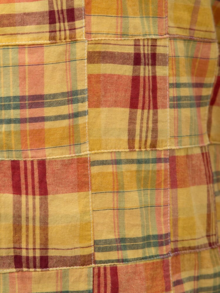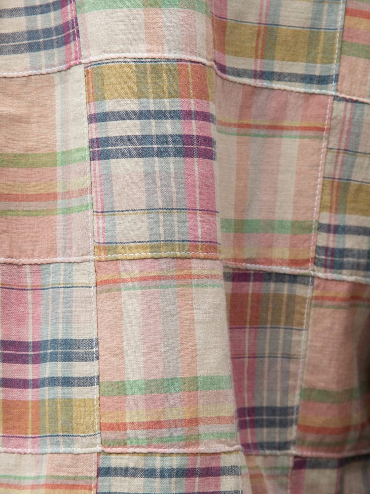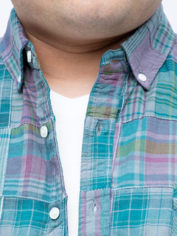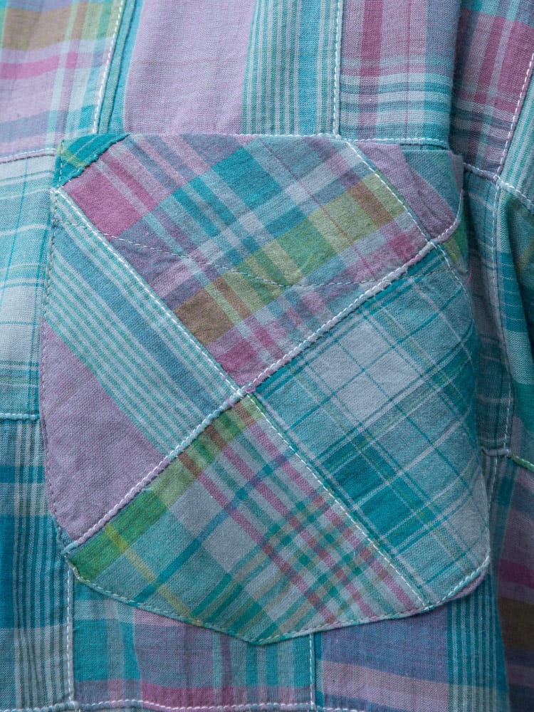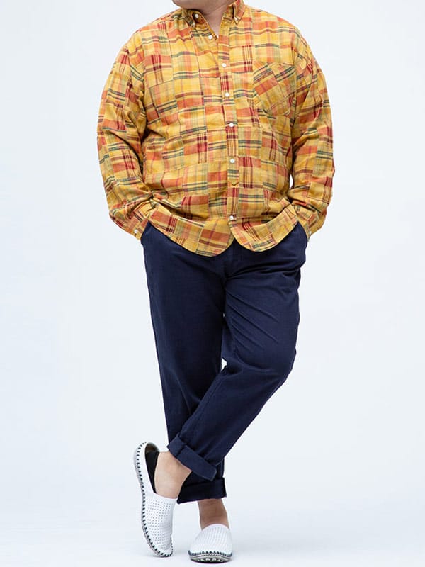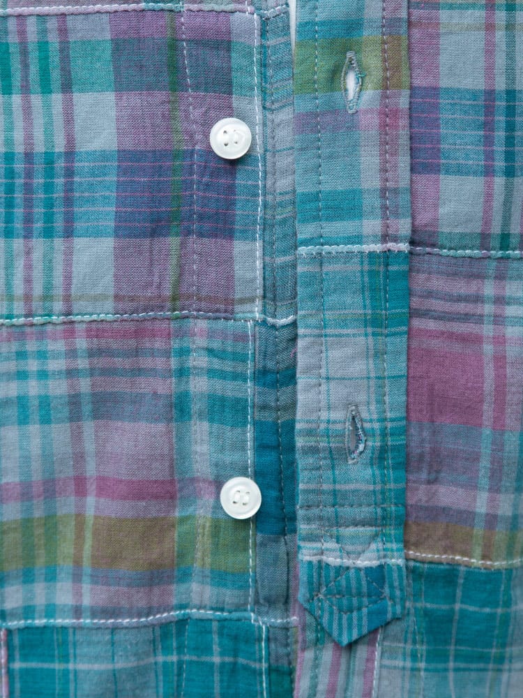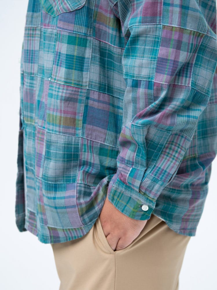 インド綿を使用したパッチワークチェック ボタンダウン 長袖 シャツ。パッチワークチェックがお洒落なアイテム。首元はスッキリとした印象のボタンダウンデザイン。柔らかく、さらさらとした感触のインド綿を使用しているので着心地抜群のシャツです。カジュアルスタイルにおすすめの一着。