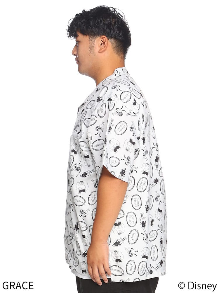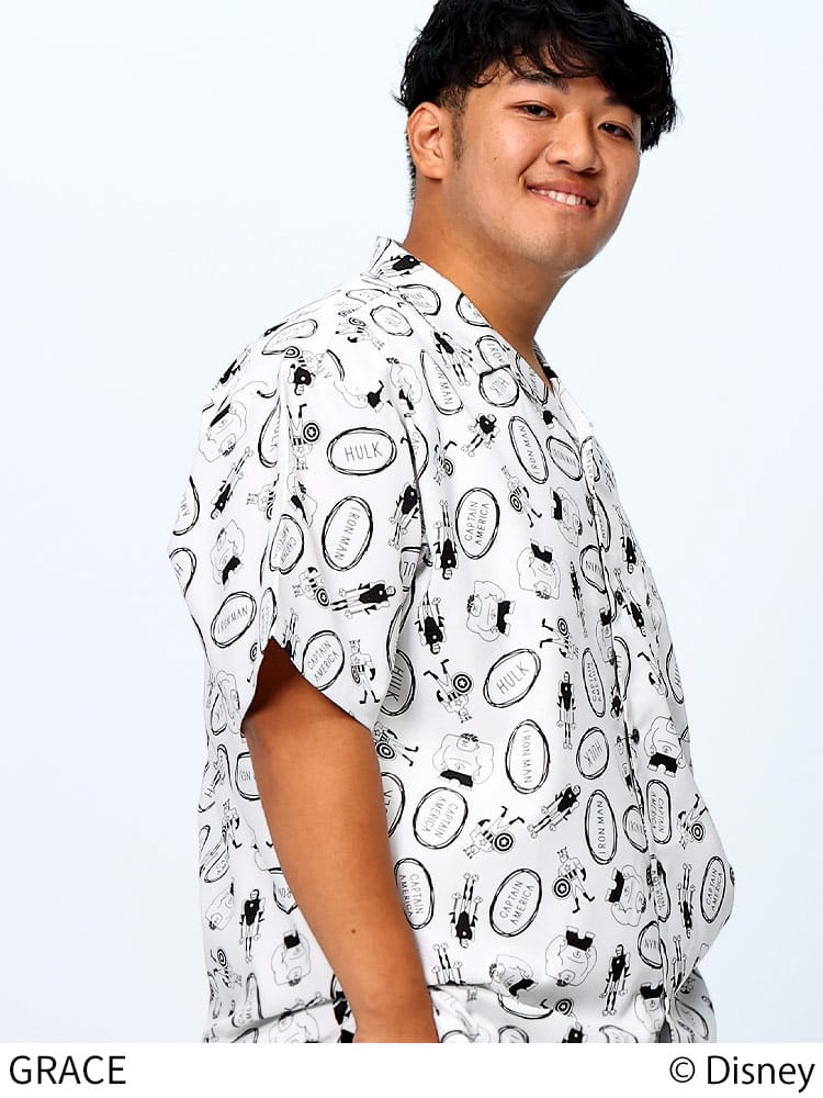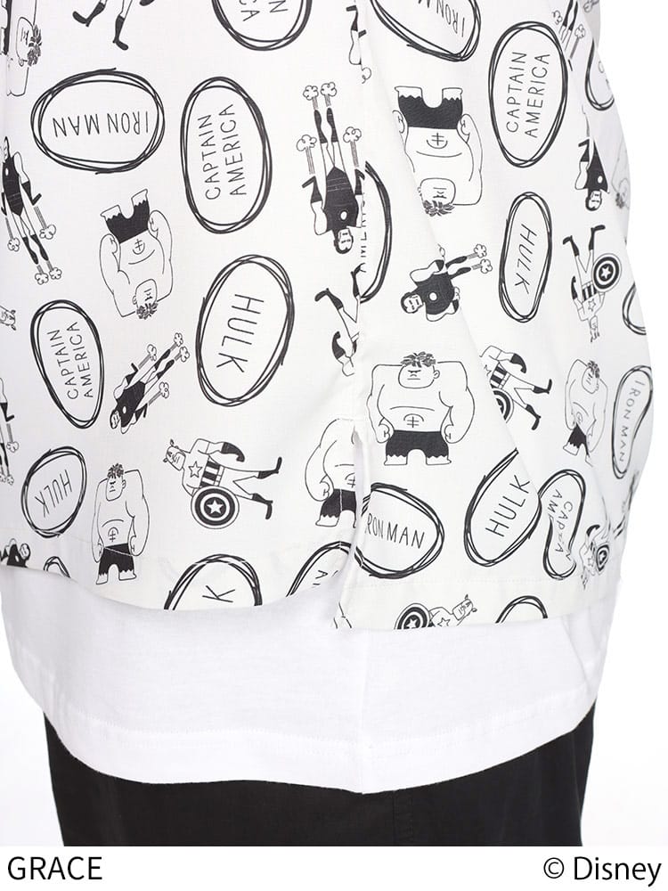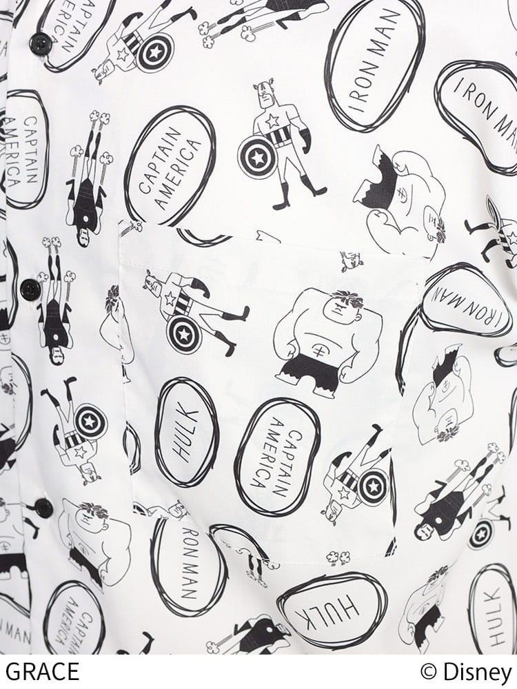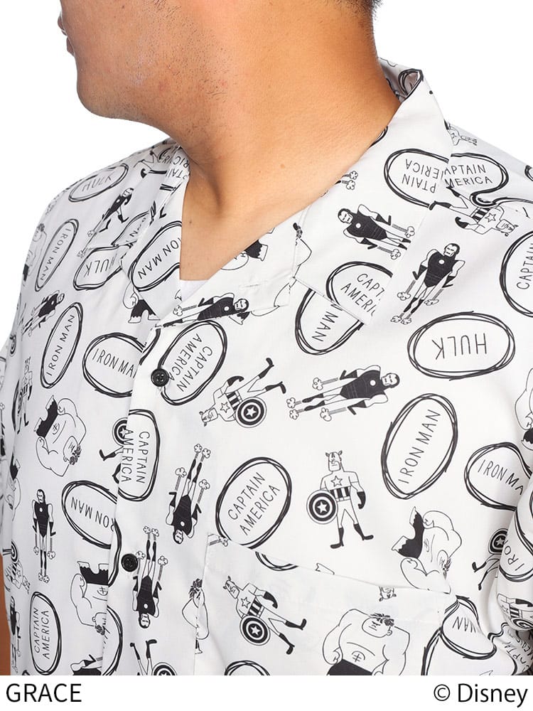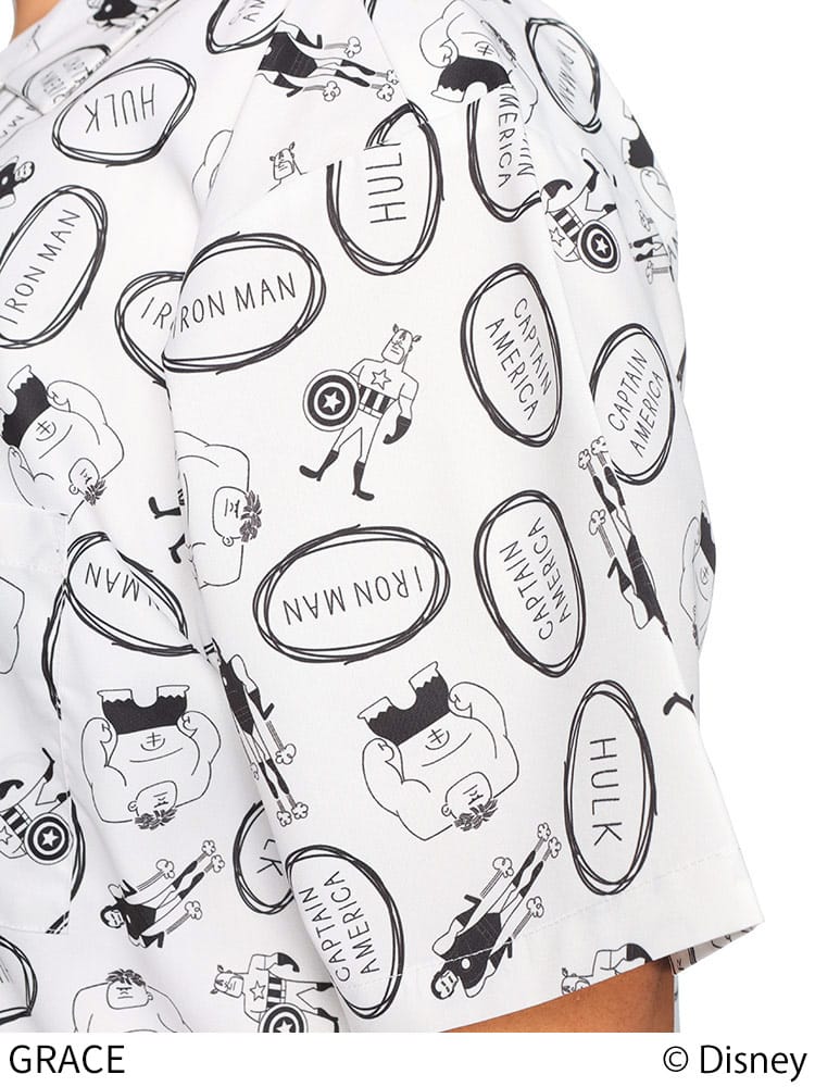 レトロポップなイラストMARVELのヒーロー、キャプテンアメリカ、ハルク、アイアンマンがデザインされた総柄が特徴です。