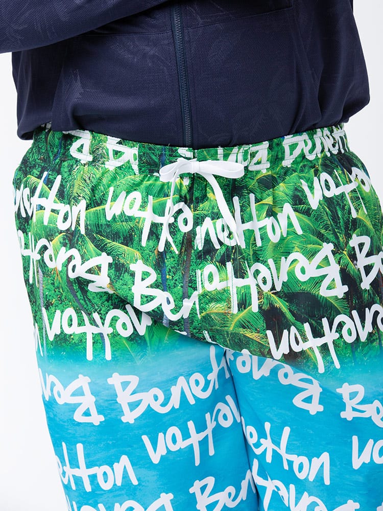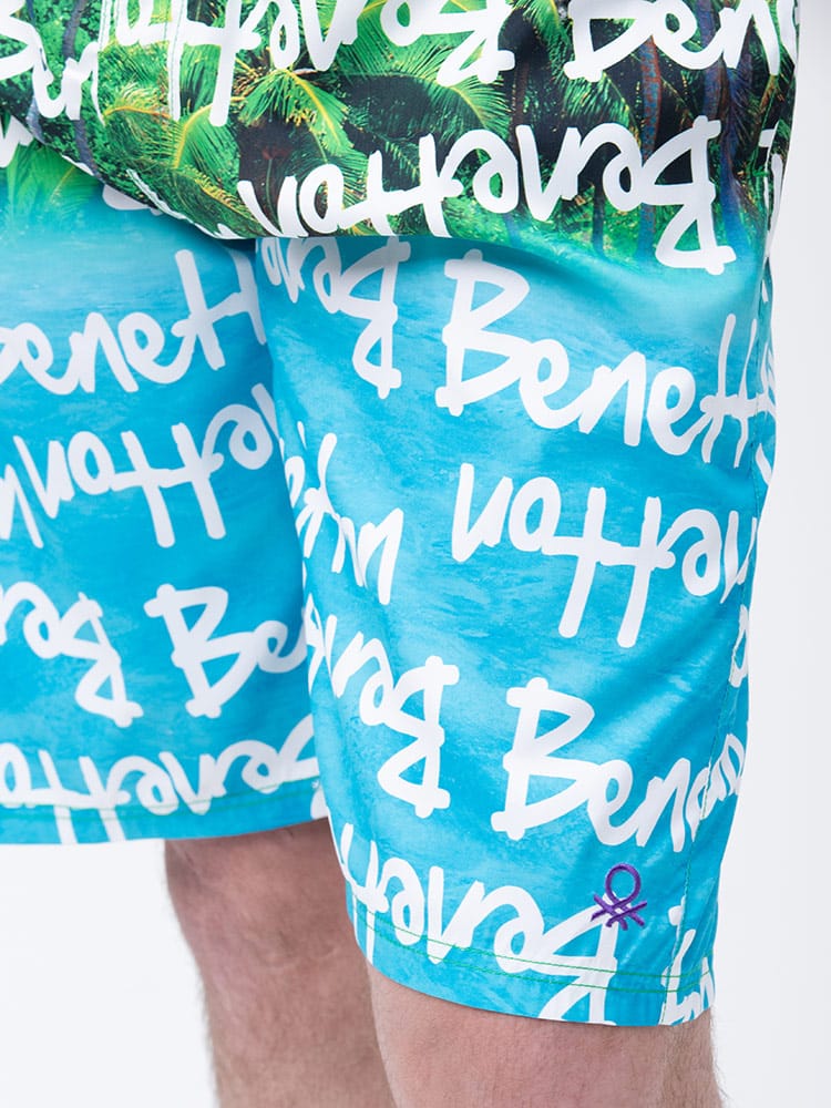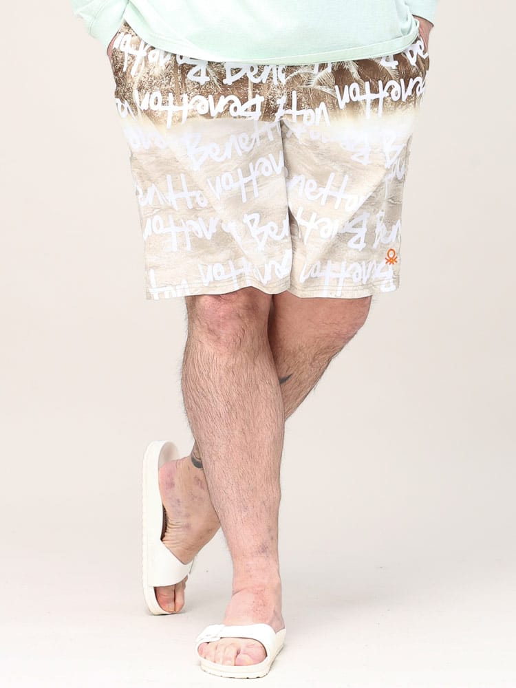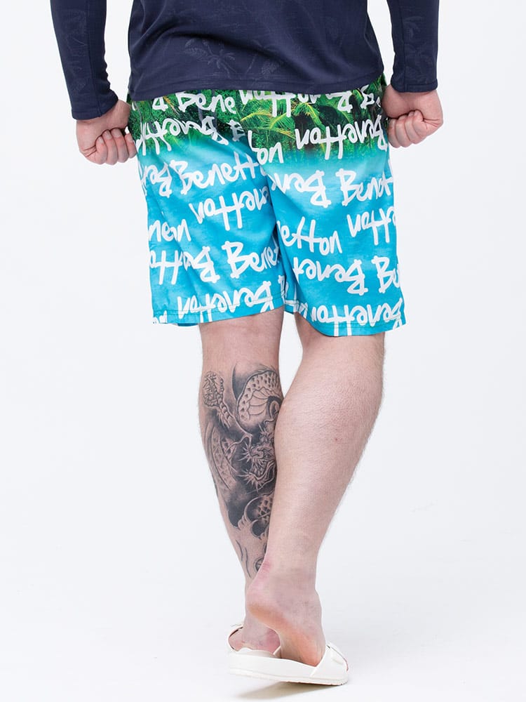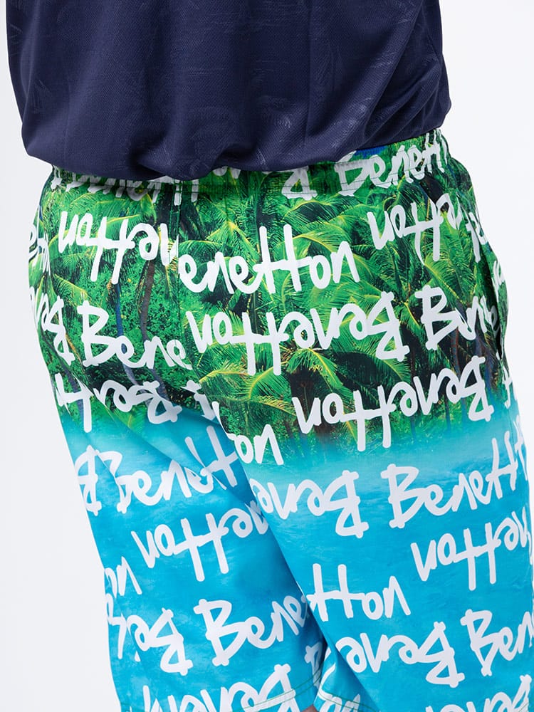 ウエストコード付きでイージーな履き心地のUNITED COLORS OF BENETTON.の総柄 スイムトランクスです。総柄デザインでインパクト抜群。ウエストはゴムとドローコード付きでサイズ調整出来ます。左裾にロゴ刺繍。メッシュインナー付き。マリンレジャーやマリンアクティビティにおすすめのアイテムです。