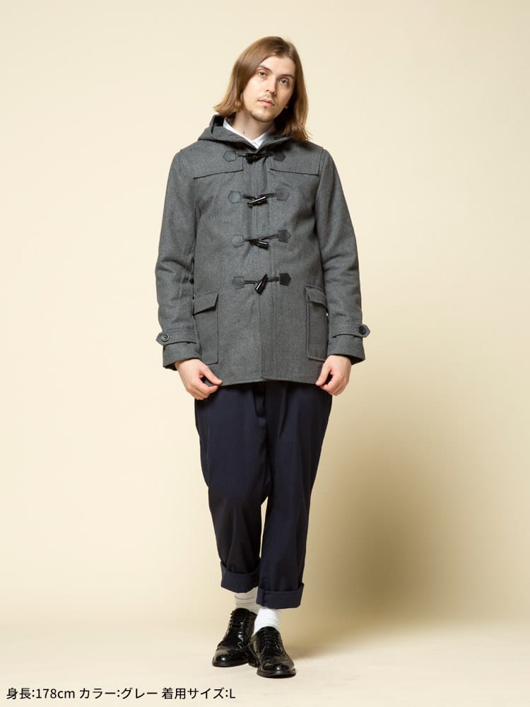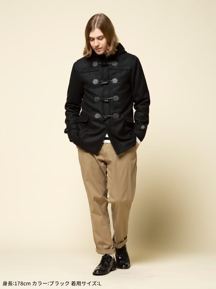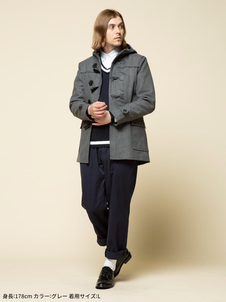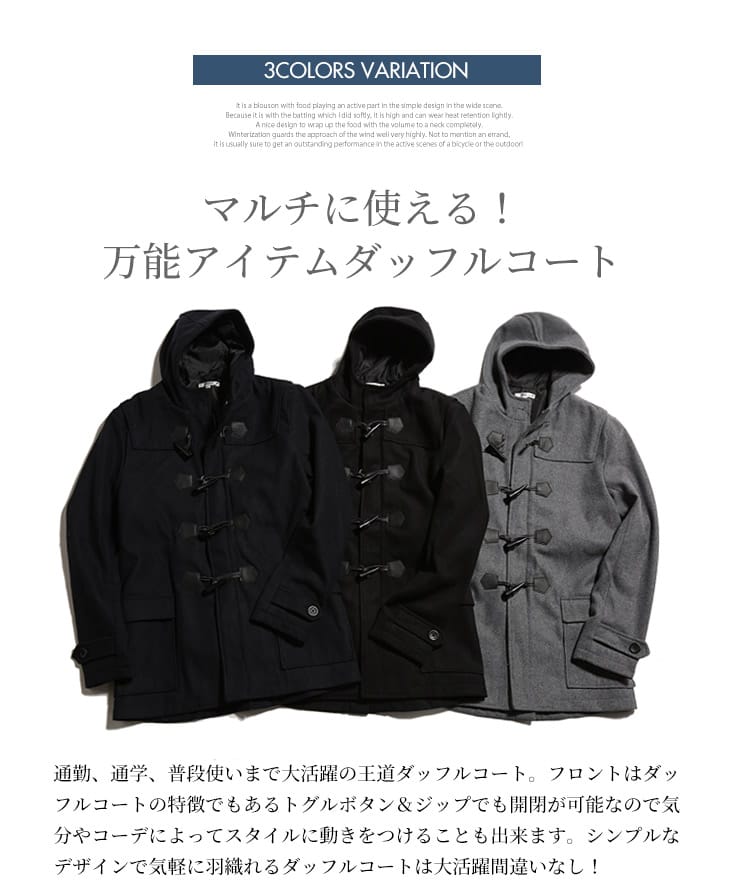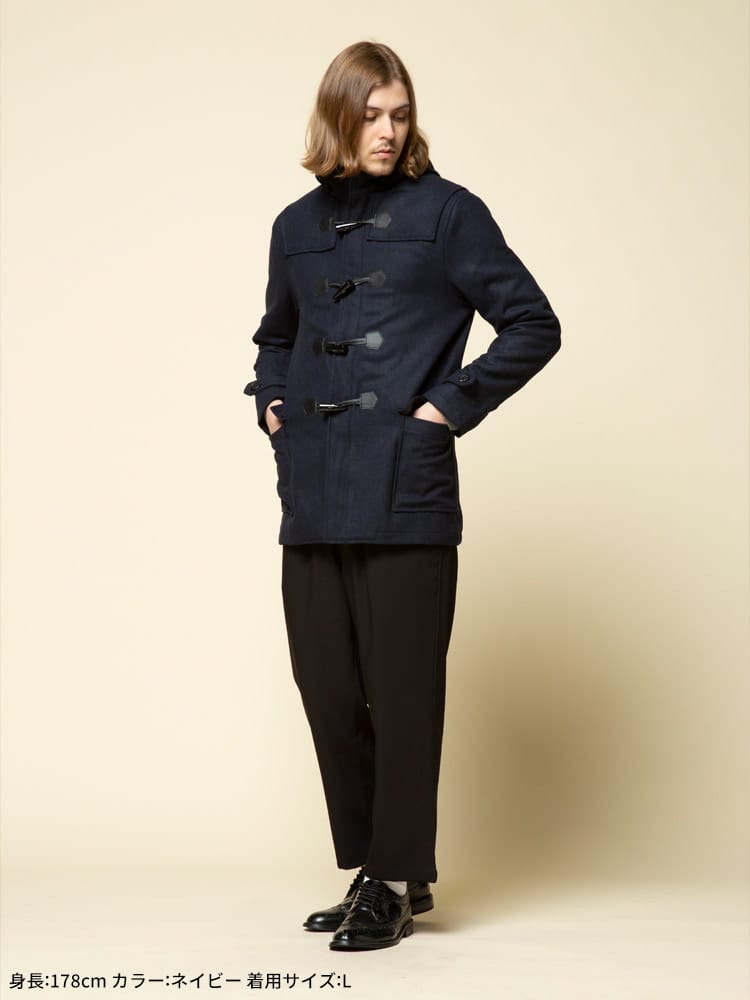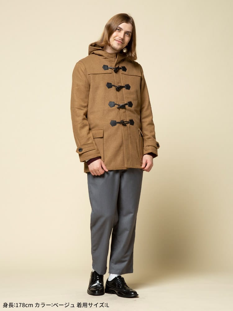 アウターの定番のダッッフルコートです。無地でキレイなシルエットでお洒落に決まります。シンプルなカラー展開なのでどんなコーデでも合わせやすいのも魅力です。これからの季節のアウターとしていかがでしょうか。
