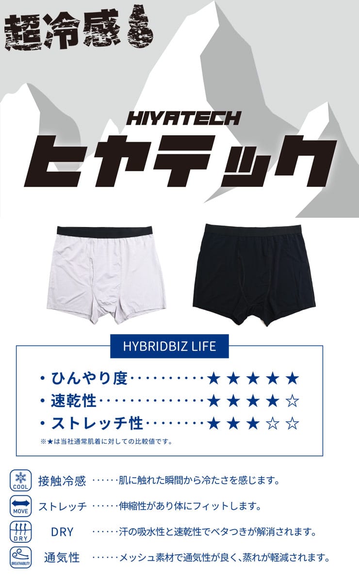 涼しく快適な着用感のヒヤテック 超冷感 ドライ 前開き ボクサーパンツです。接触冷感素材が、肌に触れた瞬間から冷たさを感じさせてくれます。また、高いストレッチ性が動きやすさとフィット感のあるはき心地をつくり出します。もちろん吸汗速乾機能と通気性によりべたつきなどの不快さと蒸れを軽減します。