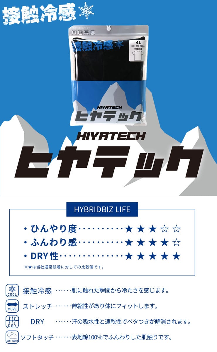 涼しく快適な着心地のヒヤテック 接触冷感 ドライ クルーネック 半袖 Tシャツです。接触冷感素材が、肌に触れた瞬間から冷たさを感じさせてくれます。また、高いストレッチ性が動きやすさとフィット感のある着心地をつくり出します。もちろん吸汗速乾機能によりべたつきなどの不快さも軽減。表地に使用している綿素材がふんわりとしたソフトタッチなのが嬉しいポイント。ビジネスから普段使いまで活躍する、快適さを追究したアンダーウェアとなっています。
