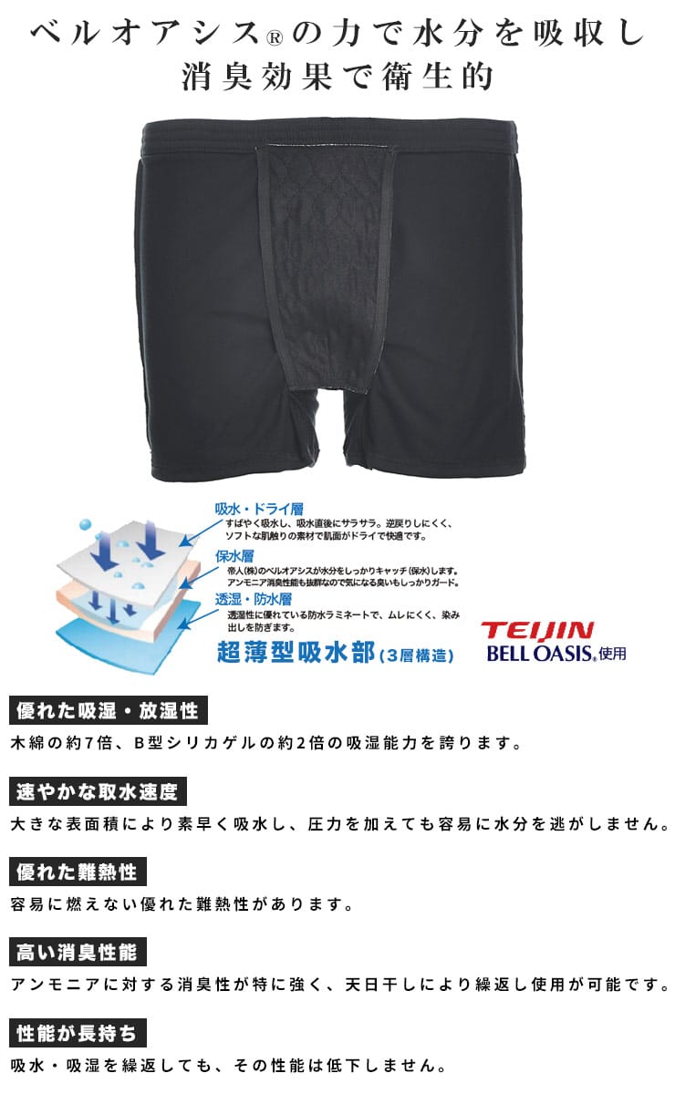 サカゼンオリジナルブランドB&T CLUBからちょいモレ対応安心肌着登場。驚異の吸水・吸湿パワーを秘めた繊維、BELL OASISベルオアシスを採用。吸水性能は自重の80倍、吸湿性能としては150%を有し、その他にも難燃性能、消臭性能を持つ画期的な高吸水・高吸湿繊維です。シンプルで使いやすく、普段使いでも、介護肌着としてもぴったりなアイテムです。