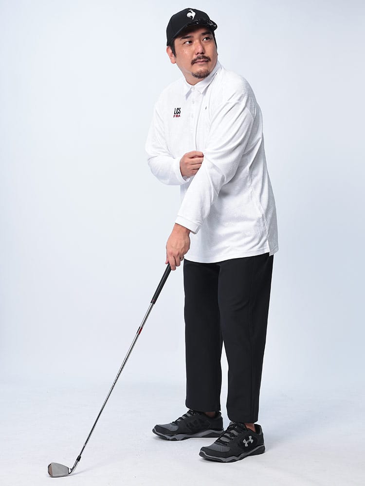 ゴルフ特化型設計で快適さと機能性を兼ね備えたドライストレッチジャガード長袖ポロシャツ。UVカット機能や吸汗速乾素材により、日差しの強い日でも快適なプレーが可能。パワーストレッチ素材を使用し、スイング時の動きを妨げないデザインが特徴。