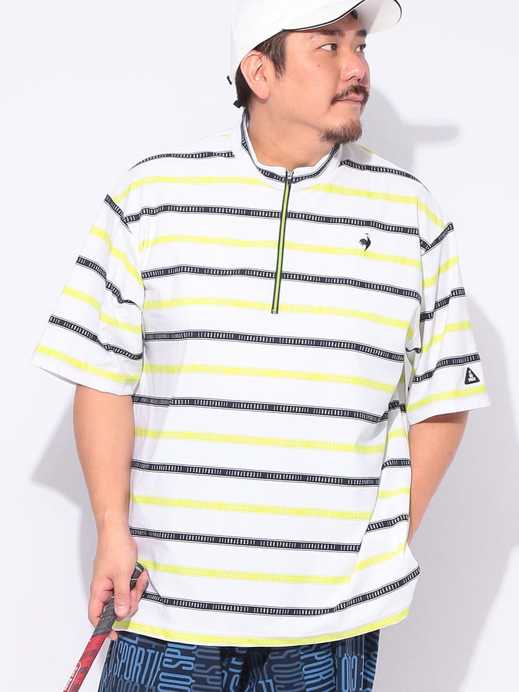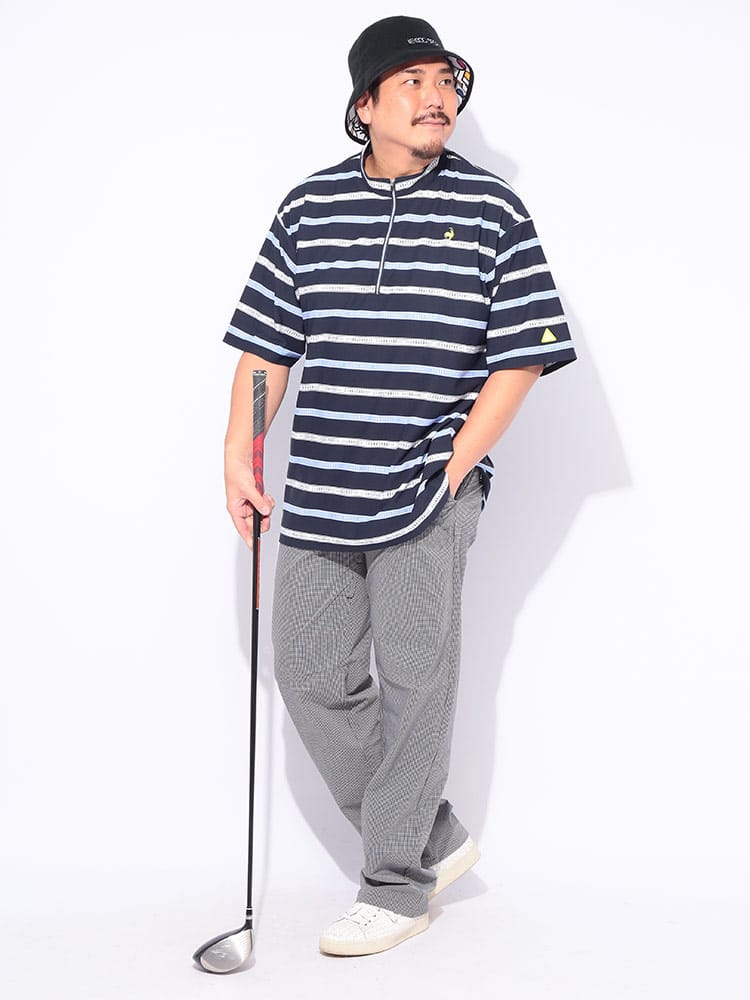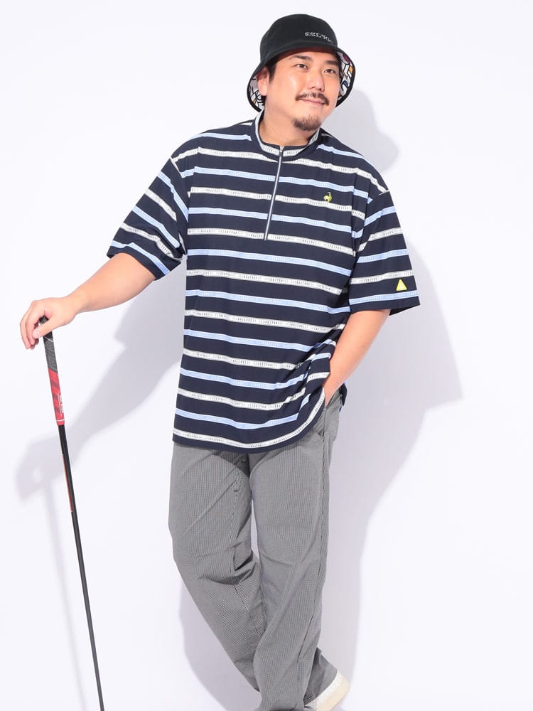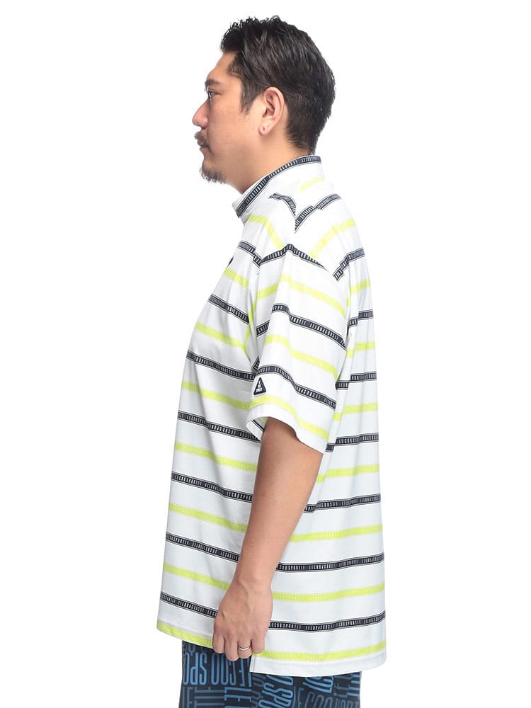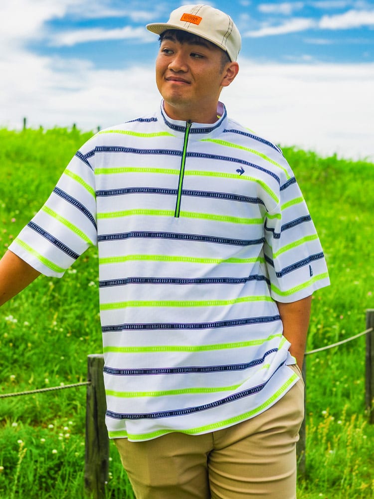 スポーティーなボーダー柄が目を引くハーフジップ半袖シャツが登場。ゴルフや様々なスポーツシーンに映える、洗練されたデザインが魅力です。吸汗速乾性に優れ、汗を素早く吸収・発散し、ドライな着心地をキープ。ストレッチ性も高く、ダイナミックな動きにもスムーズに対応します。気になる紫外線から肌を守るUVカット機能に加え、部分的に接触冷感素材を使用し、暑い季節も快適に過ごせる工夫が施されています。スタンドカラーのハーフジップデザインは、スタイリッシュな印象を与えるだけでなく、温度調節にも便利。大きいサイズのメンズにもおすすめです。機能性とデザイン性を兼ね備えた、春夏のスポーツシーンにぴったりの一枚です。