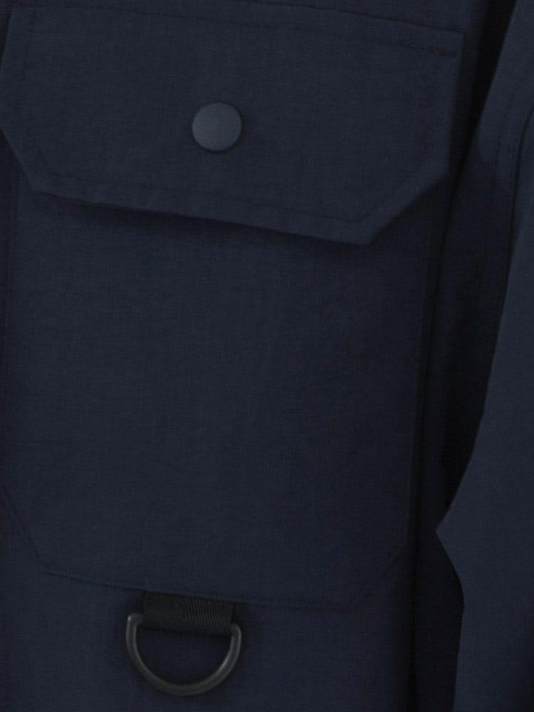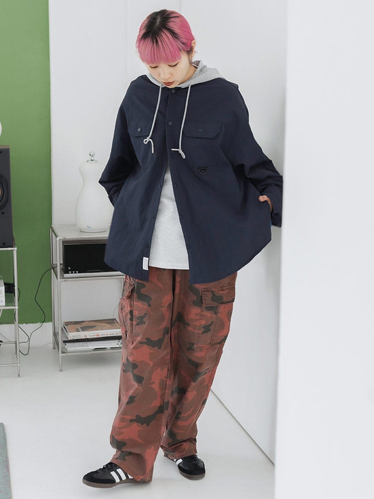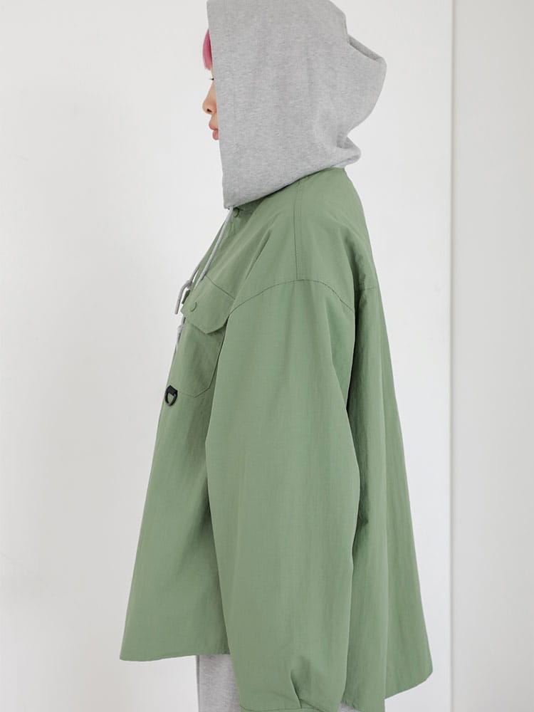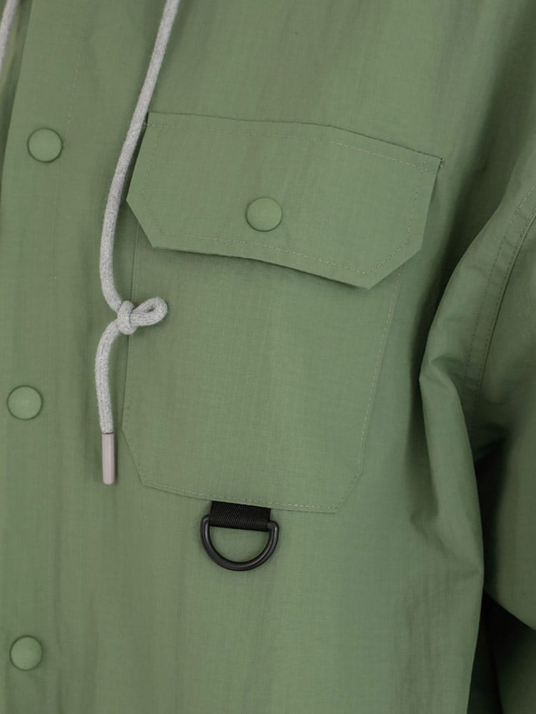このナイロンフーディットアーバンシャツブルゾンは、機能性とスタイルを融合させたアウターウェアです。外側には便利なポケットを4つ装備し、小物の収納に対応。Dカンのディテールがアクセントになり、実用性とデザイン性を兼ね備えています。フロントはスナップボタンで開閉しやすく、袖と胸にもボタンを配してデザインの一貫性を保ちつつ、アクセスの利便性を高めています。裏地には通気性の良いネットを採用し、快適な着心地を実現。フード付きで、突然の天候変化にも柔軟に対応します。アーバンライフに最適な一着です。