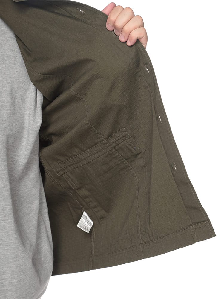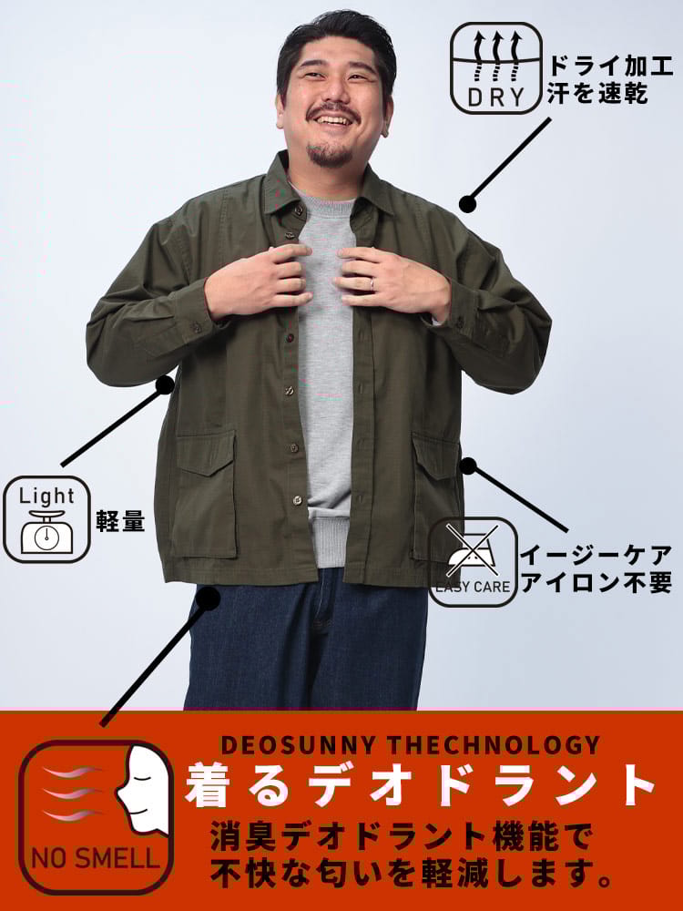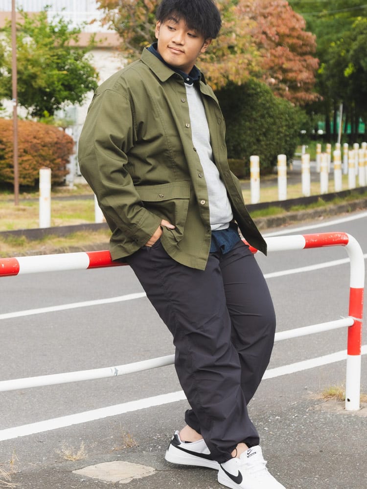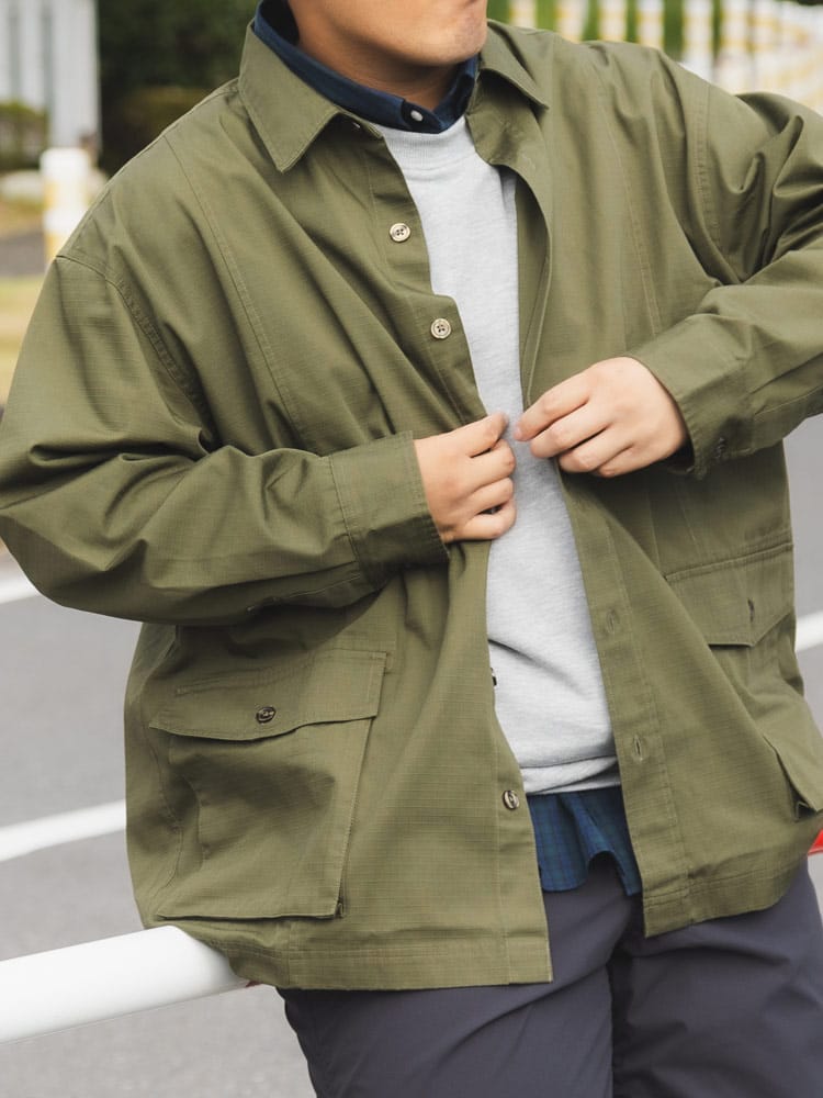 複数のポケットを備えたカーゴデザインで、収納力も抜群です。シャツとジャケットの中間的なデザインで、カジュアルなスタイルにぴったり。アウトドアやタウンユースで幅広く活躍する実用的なアイテムです。
