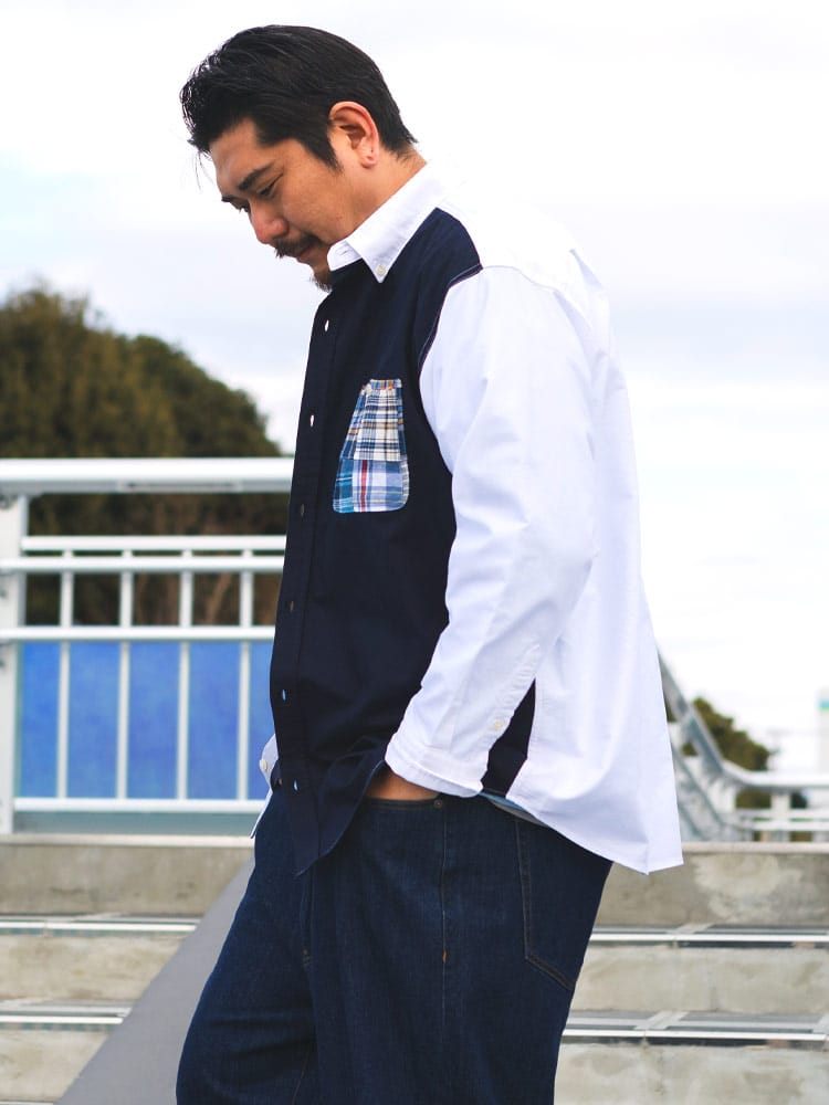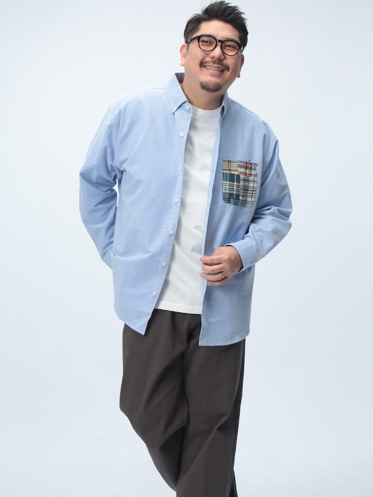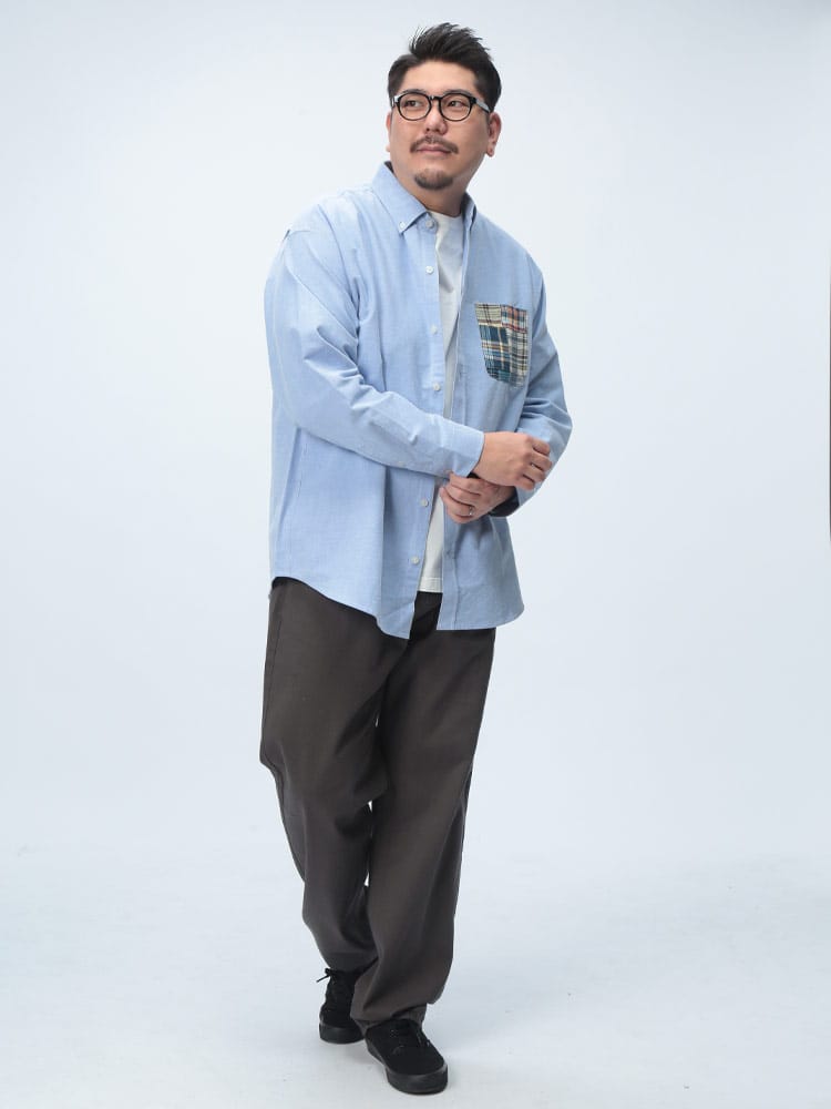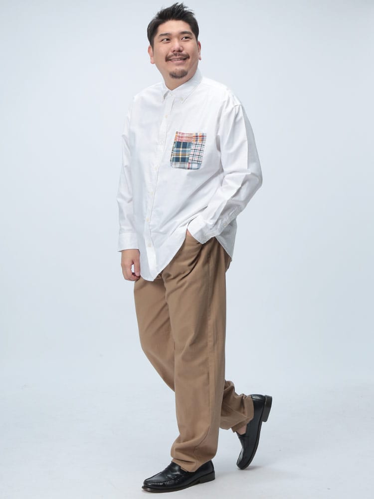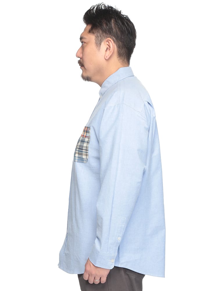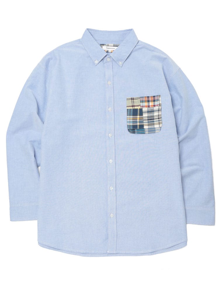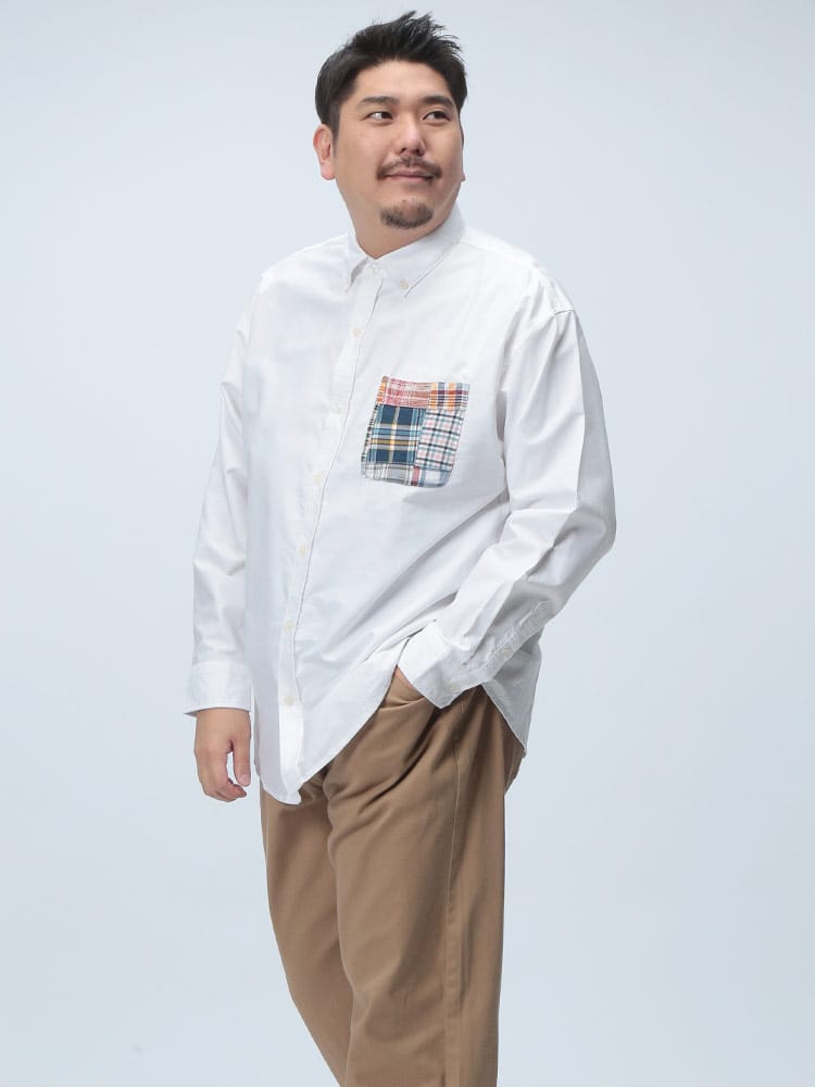 Hampton wearのパッチワークポケット ボタンダウン 長袖オックスシャツは、カジュアルなデザインが魅力です。パッチワークポケットがアクセントになり、一枚でコーディネートの主役になります。丈夫なオックスフォード生地を使用し、長く愛用できます。ボタンダウンカラーで、きれいめな着こなしも可能です。