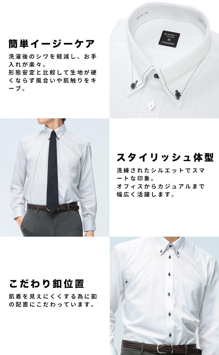 忙しい紳士の味方、イージーケアワイシャツ。ポリエステル75%・綿25%の絶妙なブレンド素材を採用し、天然素材の肌触りを保ちながら、洗濯後のシワを抑える高い実用性を実現しました。忙しい朝に嬉しいイージーケア仕様で、アイロンがけの時間を大幅に短縮。いつでもパリッと清潔感のある印象をキープできます。さらに、ソフトタッチな生地感が、長時間の着用でもストレスを感じさせません。細部にこだわったデザインボタンダウンの衿元は、ネクタイを締めても、ノータイでもスマートに決まる洗練されたスタイル。胸元のポケットが実用性を高めます。オールシーズン活躍する、紳士のための頼れる定番。ビジネスの即戦力として、快適さと清潔感を両立した一着です。