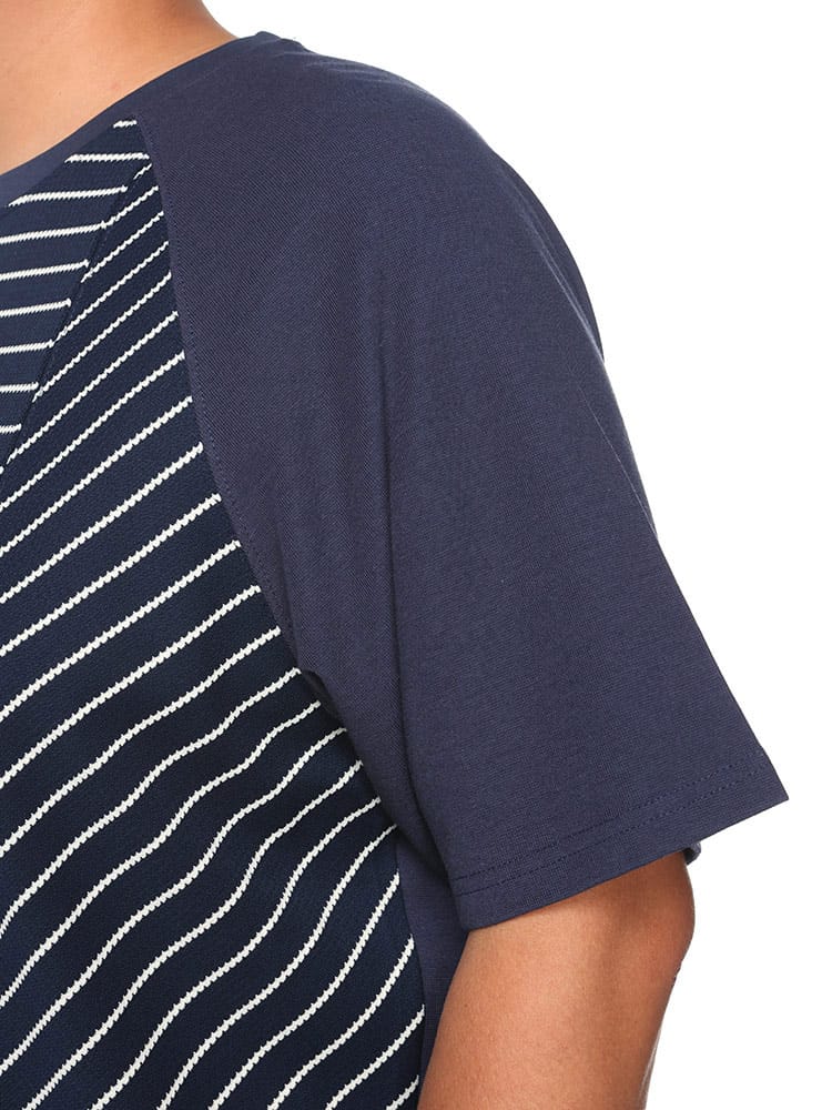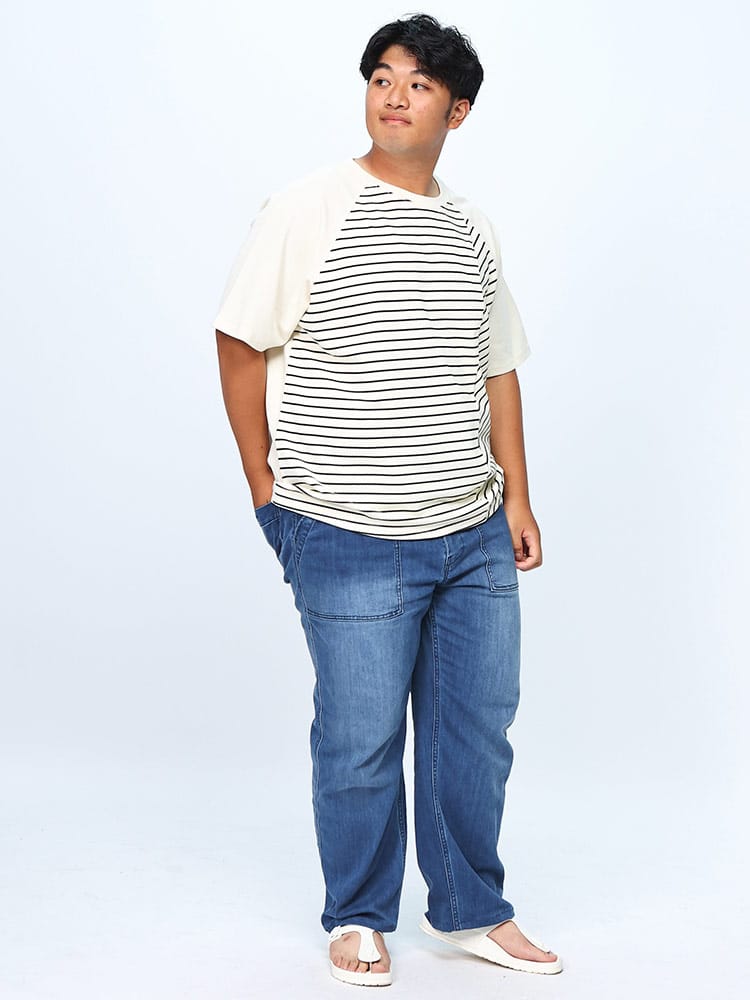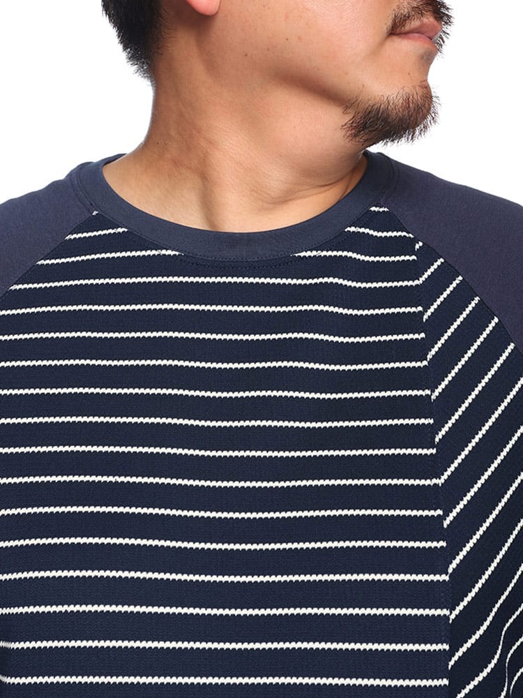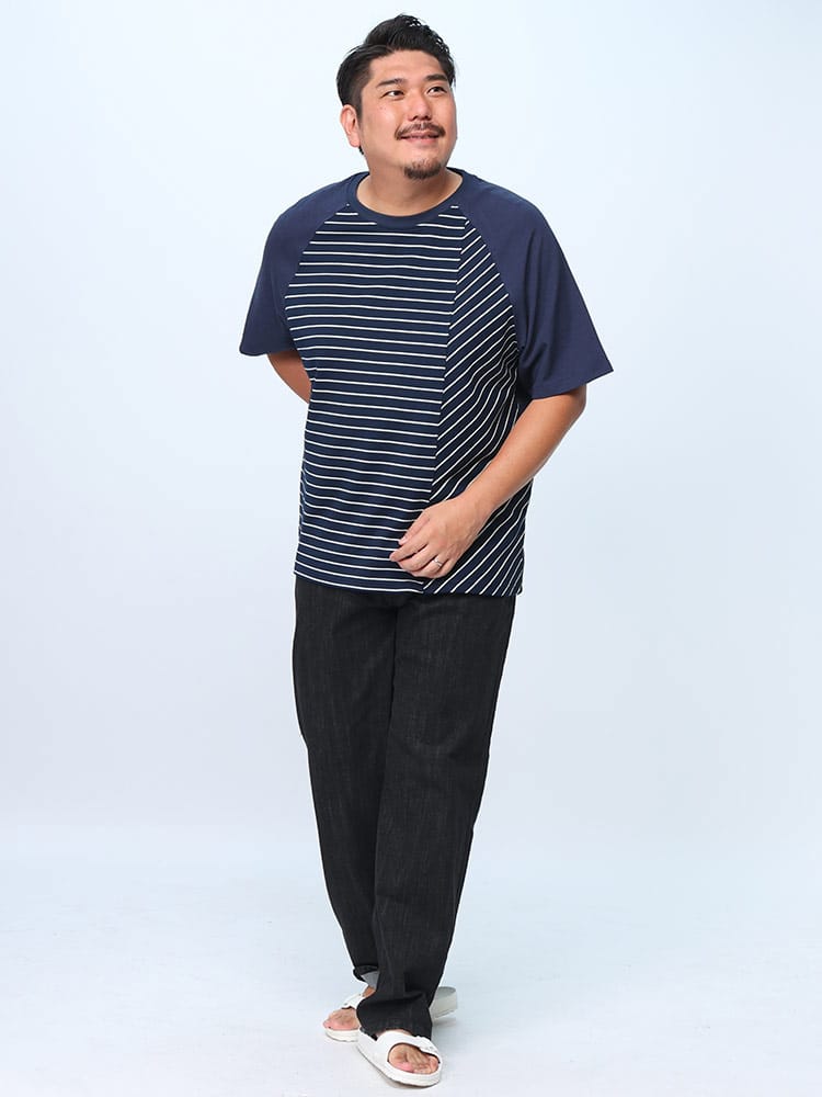 ボーダー切替のラグラン5分袖Tシャツは、カジュアルながらもスタイリッシュな一枚です。ラグランスリーブのデザインが動きやすさを提供し、快適な着心地を実現。袖と身頃のボーダー切替がアクセントとなり、シンプルながらも個性的な印象を与えます。