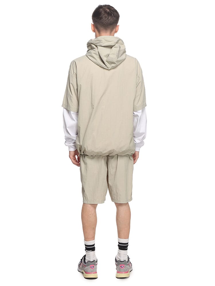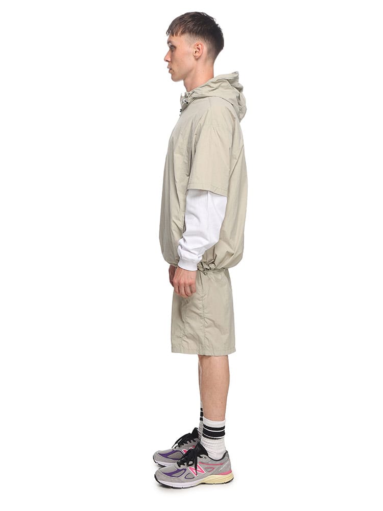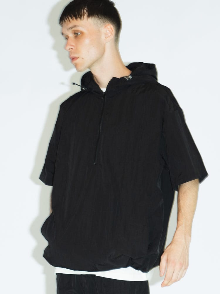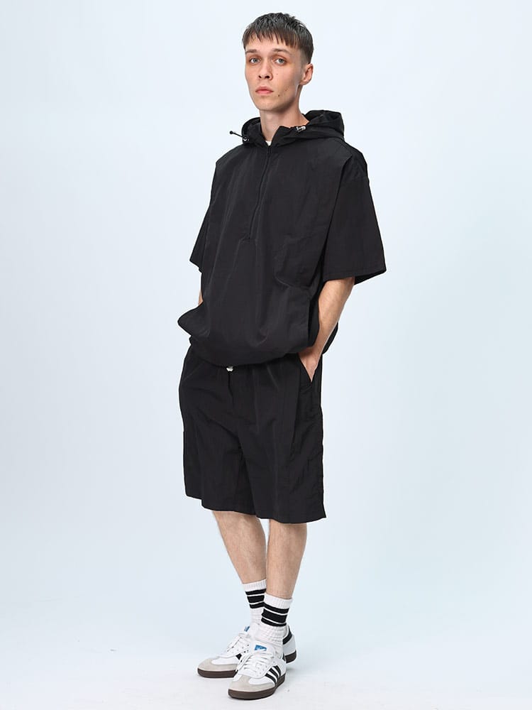 ナイロンハーフジップ半袖パーカーとナイロンショートパンツのセットアップは、スポーツシーンやアクティブな場面に最適なユニセックスデザインです。高品質なナイロン素材を使用しており、軽量かつ耐久性に優れ、快適な着心地を提供します。半袖パーカーはハーフジップ仕様で、簡単に着脱ができ、通気性も抜群です。ショートパンツはウエストにゴムが入っており、フィット感を調整可能。男女問わずおしゃれに着こなせるデザインで、ランニングやジム、アウトドア活動など、さまざまなアクティブシーンで活躍します。