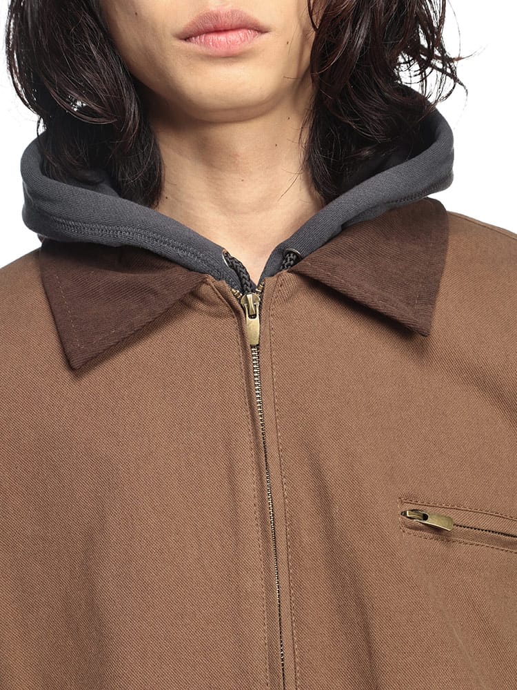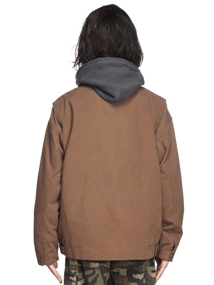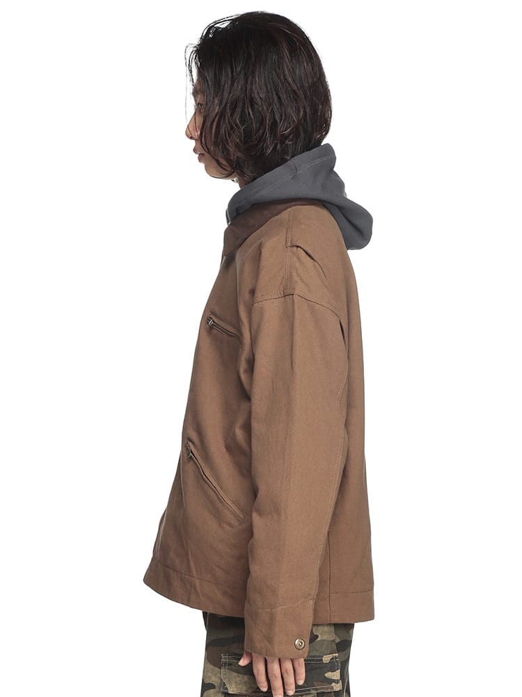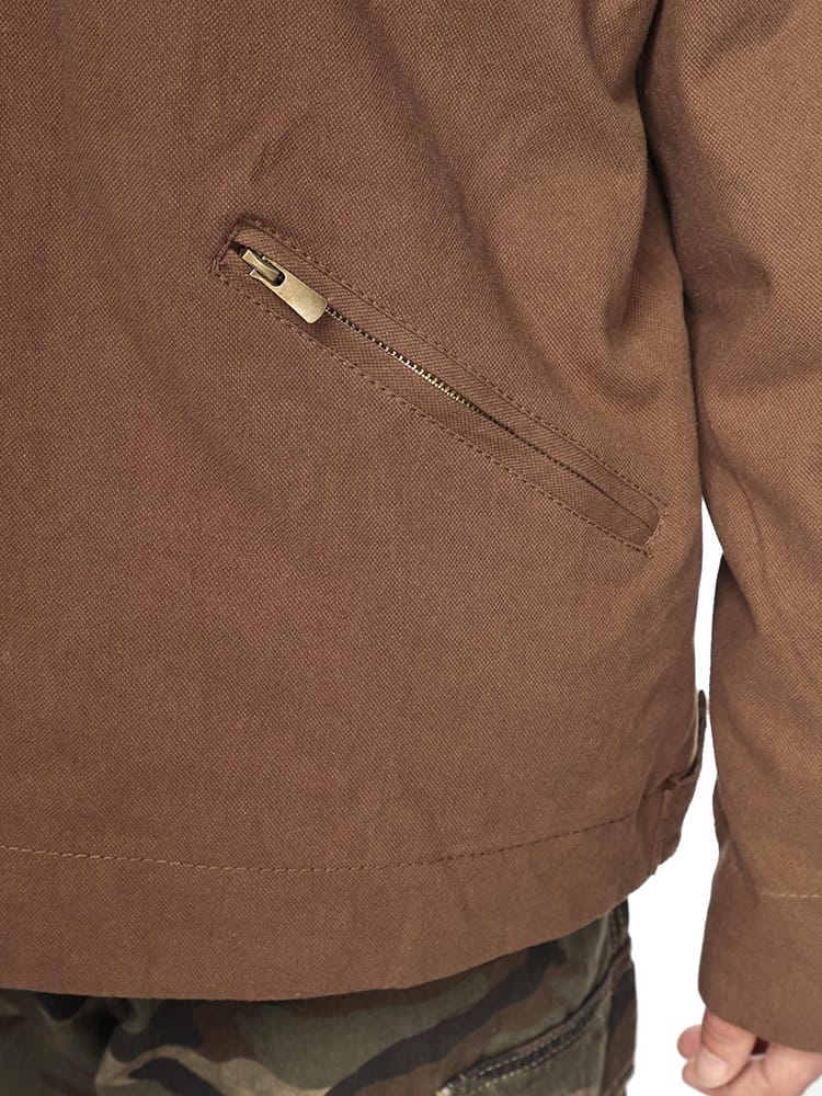 タフでスタイリッシュなメンズワークジャケット。WOODENDOLLのダック地ワークジャケットは、丈夫な素材と機能的なデザインが魅力のアイテムです。表地は綿とポリエステルの混紡で、耐久性が高く、適度な厚みがあります。裏地はポリエステル100%で、さらっとした肌触りです。ワークジャケットならではのデザインで、タフな印象を与えます。襟裏のチェック柄がアクセントになり、カジュアルな中にも遊び心をプラス。襟部分にはコーデュロイ素材を使用し、温かみのある雰囲気です。袖口と裾部分にはアンティーク調のスナップボタンが施されており、細部までこだわったデザインです。外側に3つ、内側に1つのポケットを備えており、収納力も抜群。シングルジップ仕様で、着脱もスムーズです。
