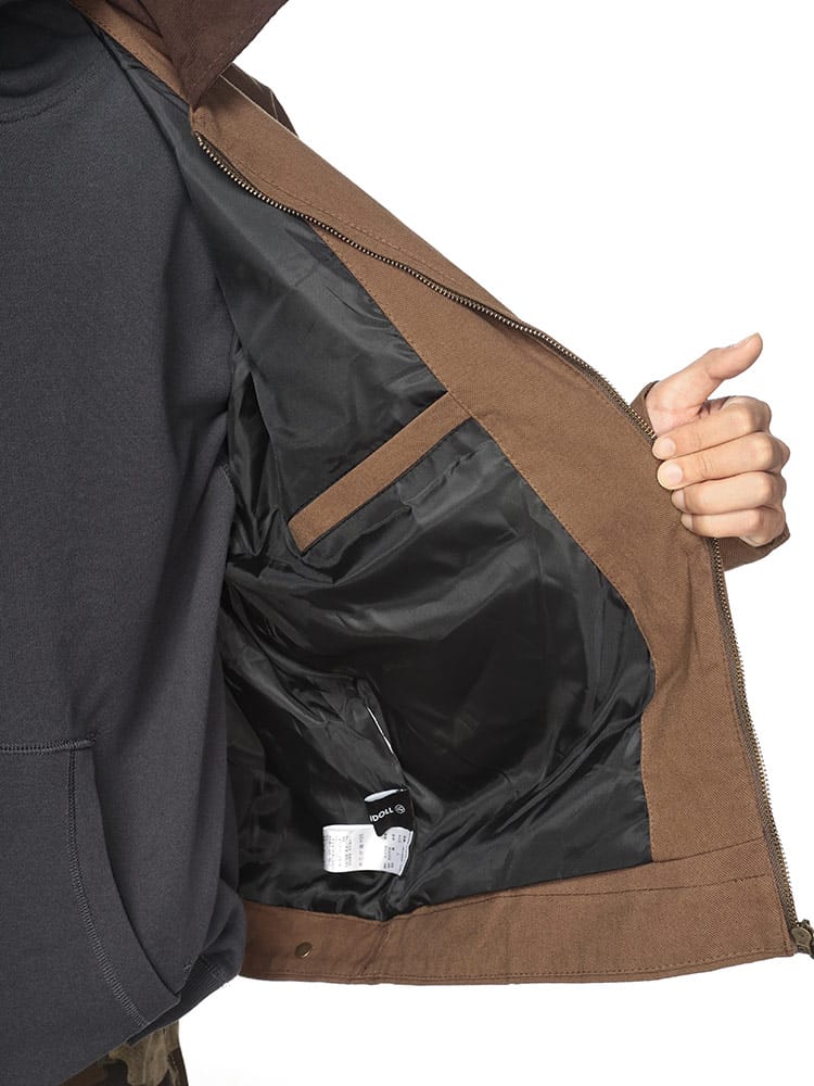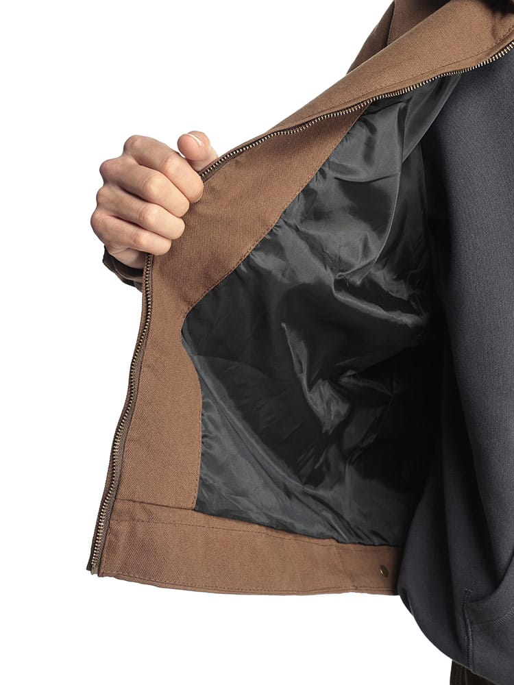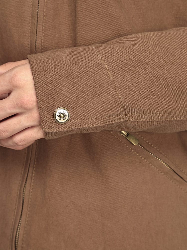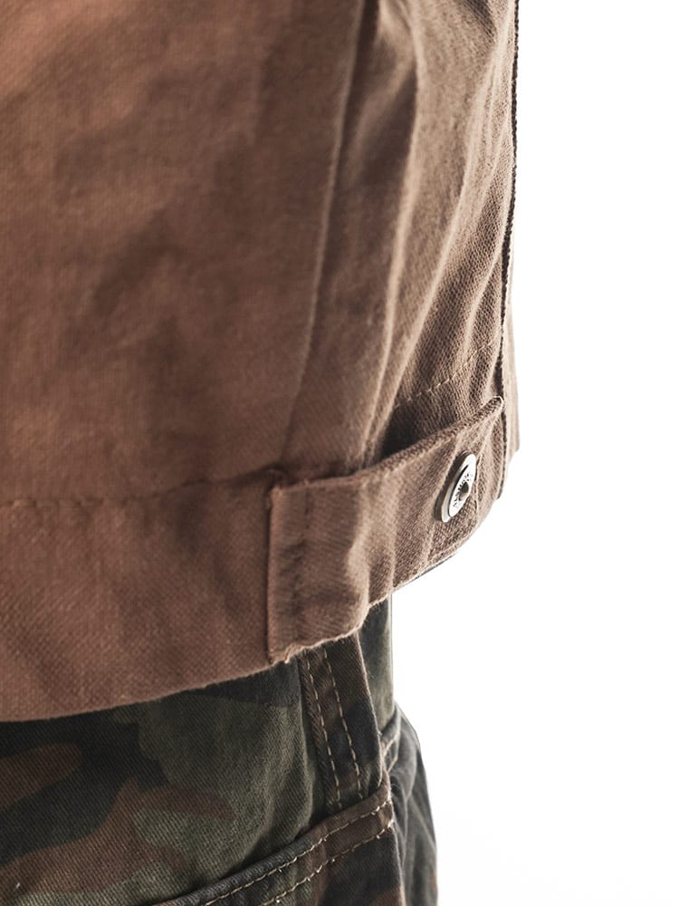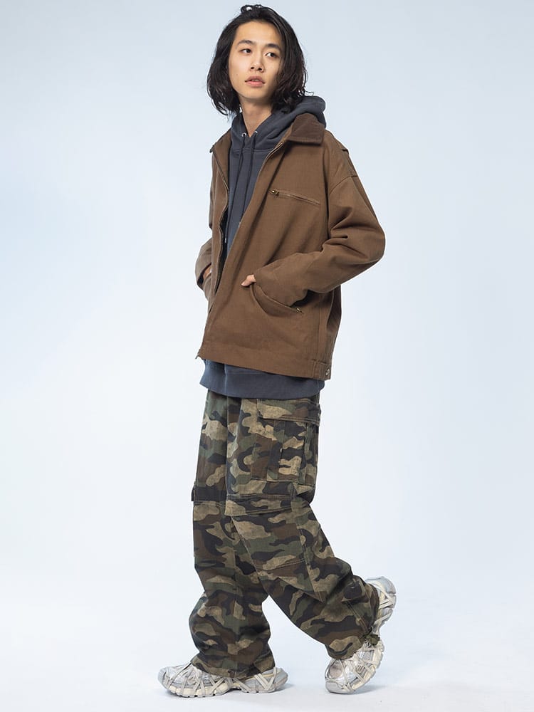 タフでスタイリッシュなメンズワークジャケット。WOODENDOLLのダック地ワークジャケットは、丈夫な素材と機能的なデザインが魅力のアイテムです。表地は綿とポリエステルの混紡で、耐久性が高く、適度な厚みがあります。裏地はポリエステル100%で、さらっとした肌触りです。ワークジャケットならではのデザインで、タフな印象を与えます。襟裏のチェック柄がアクセントになり、カジュアルな中にも遊び心をプラス。襟部分にはコーデュロイ素材を使用し、温かみのある雰囲気です。袖口と裾部分にはアンティーク調のスナップボタンが施されており、細部までこだわったデザインです。外側に3つ、内側に1つのポケットを備えており、収納力も抜群。シングルジップ仕様で、着脱もスムーズです。