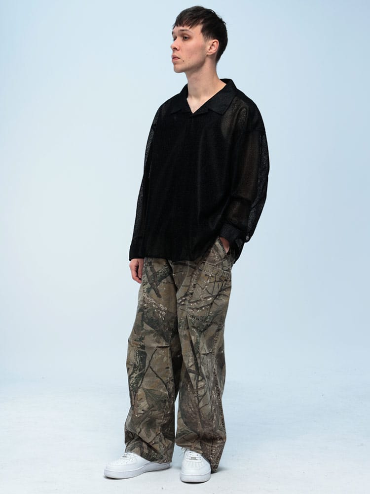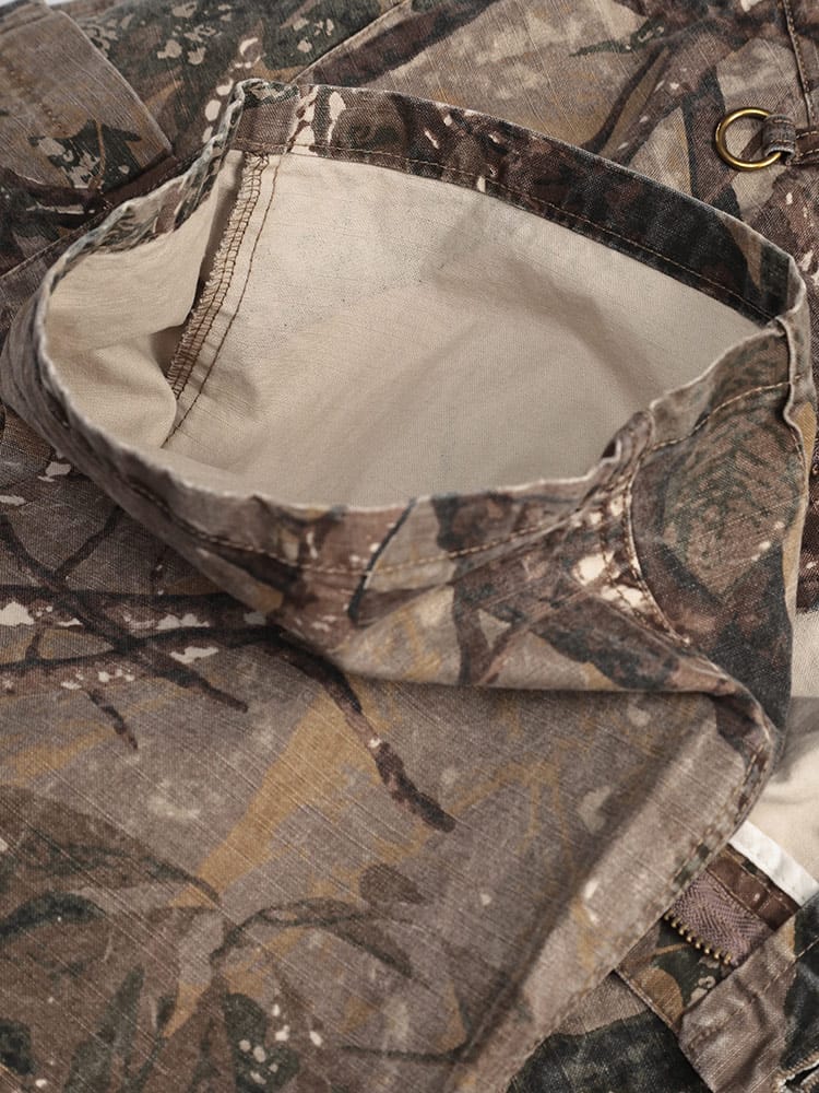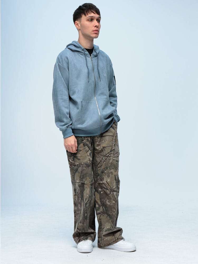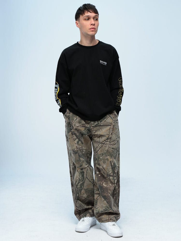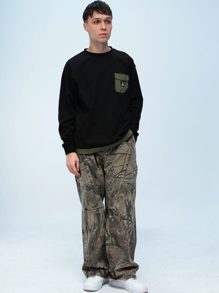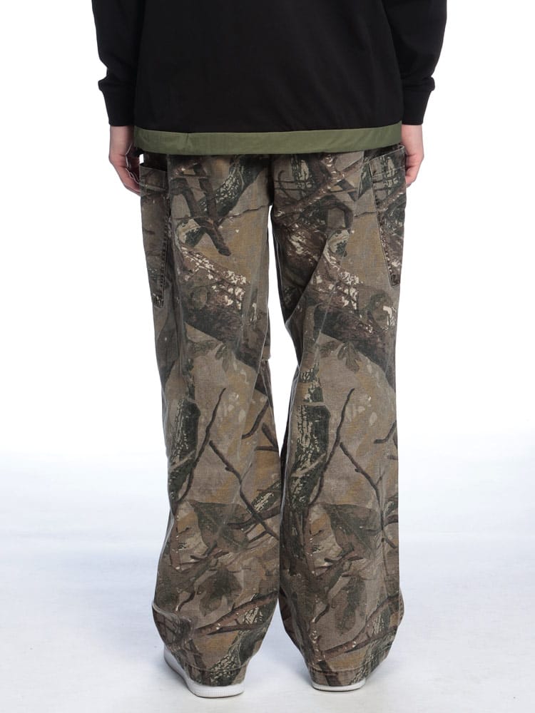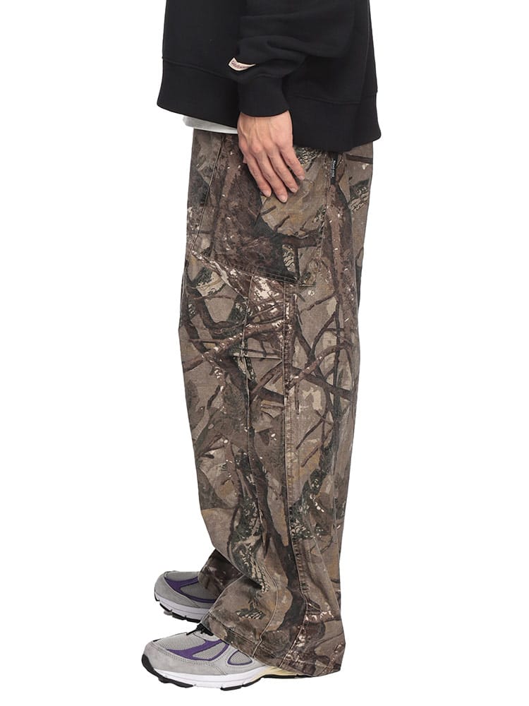 WOODENDOLLのリアルツリー柄パンツは、切り替えデザインが特徴的な一着。ウエスト後部はゴム仕様で楽ちんな履き心地。ベルトループも付いており、スタイルに合わせてアレンジ可能。ワイドシルエットでリラックス感を演出。綿100%のしっかりした素材感が魅力です。