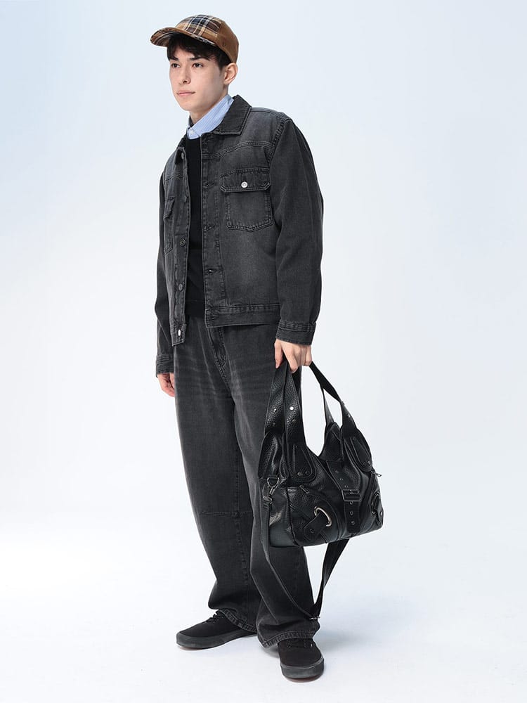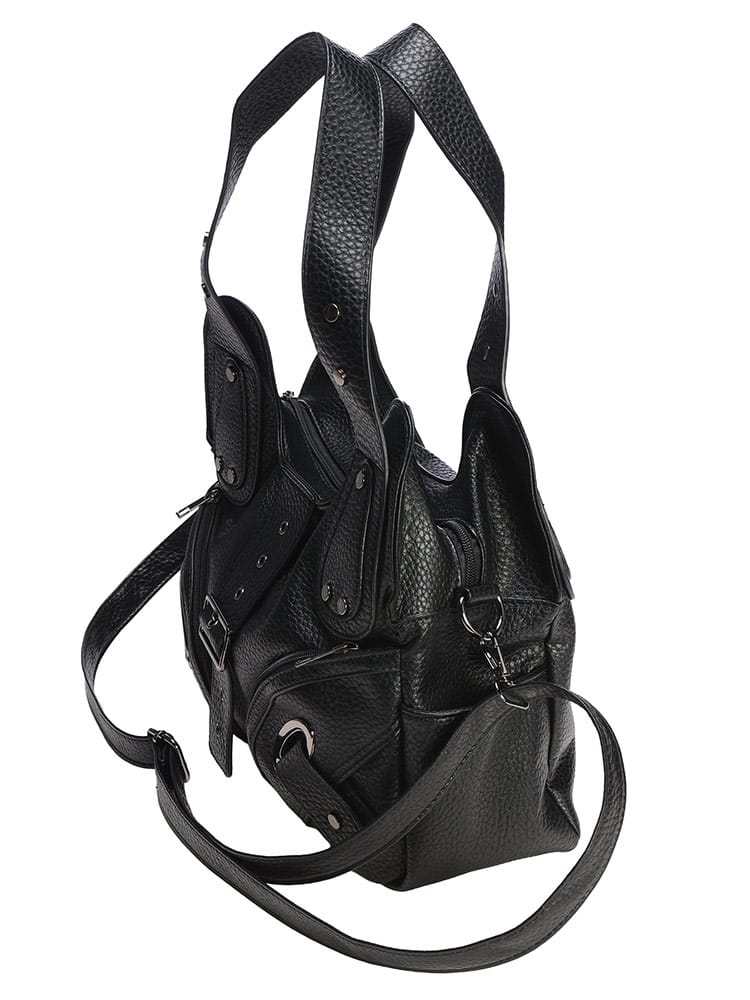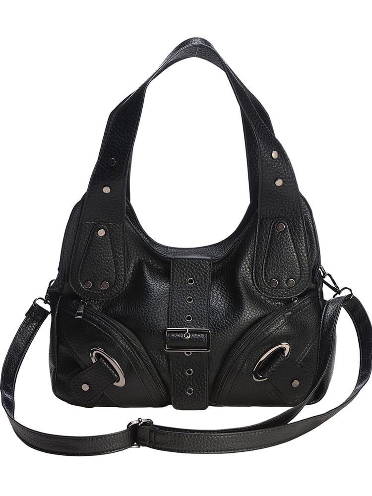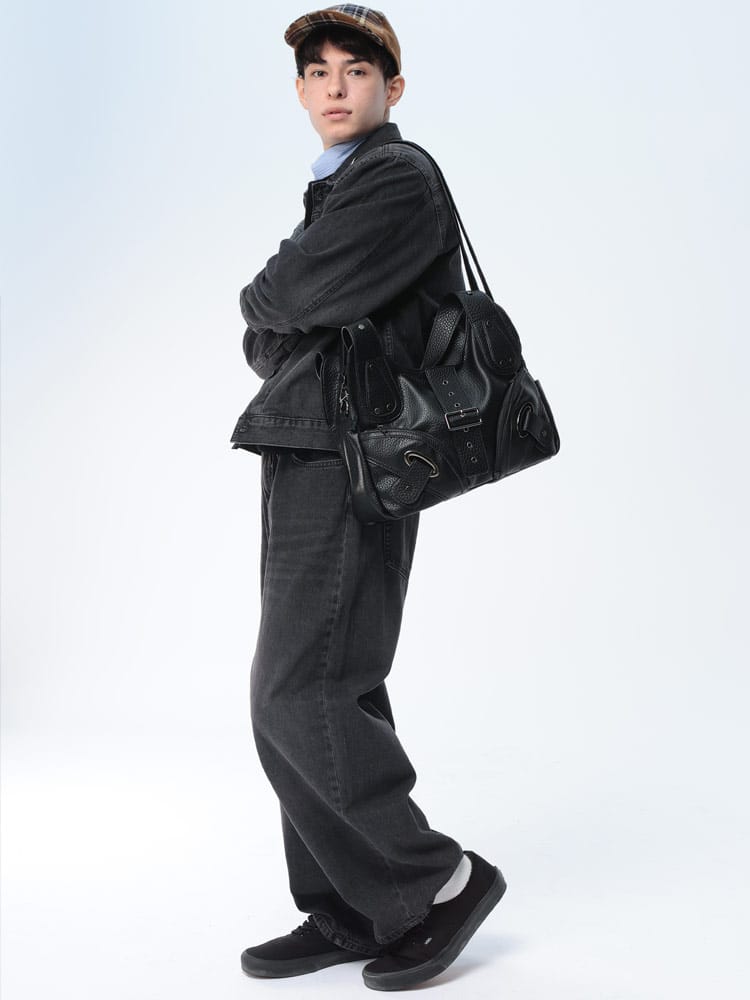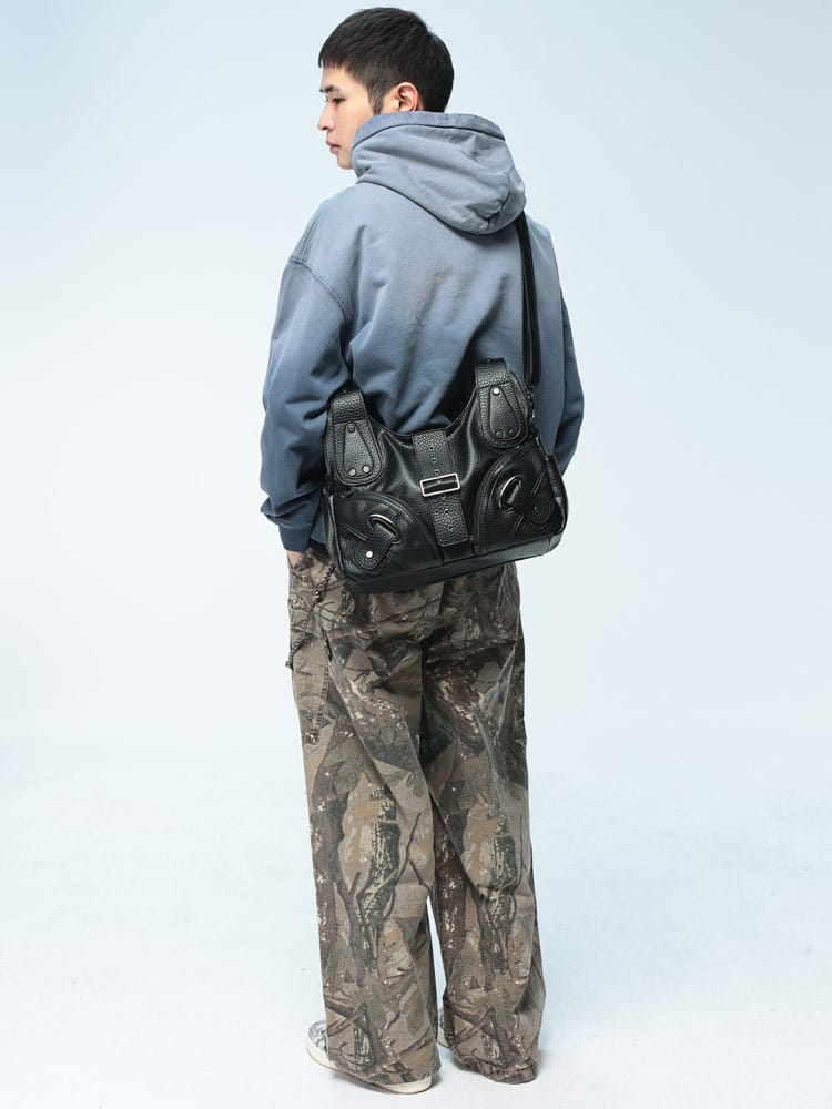 上質な合成皮革にエンボス加工を施し、立体的な表情とモードな雰囲気をプラスしたショルダーバッグ。ワンハンドルのスタイリッシュなデザインが、手持ちでサッと持つだけで洗練された印象を与えます。付属のショルダーストラップは取り外し可能。斜め掛けや肩掛けでカジュアルにも対応する2WAY仕様です。メイン収納口はジップで安心。さらに外側ジップポケット×2、オープンポケット×1、内側ジップポケット×1と、充実した収納力で小物をスマートに整理できます。ユニセックスで使えるデザインが魅力の、デイリーユースに最適な一品です。