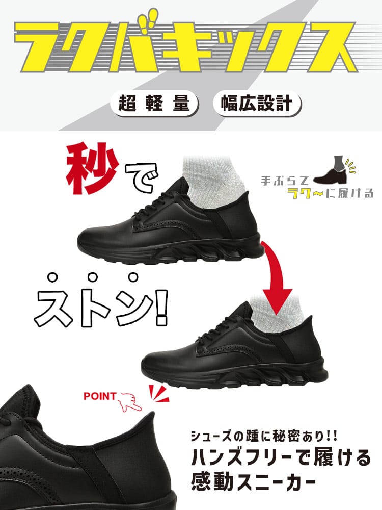「ラクバキックス」は、靴を履く煩わしさから解放される革新的なカジュアルシューズです。靴べら不要のハンズフリー仕様で、スムーズに脱ぎ履きが可能。急いでいる時でもストレスフリーです。約265gの驚きの軽さと、屈伸性に優れたソールが、長時間の歩行でも疲れにくい快適な履き心地を実現。幅広設計で足への負担も軽減します。さらに消臭・抗菌機能付きで、いつでも清潔感をキープ。ビジカジスタイルにもマッチするデザインで、見た目と機能性を両立した一足です。