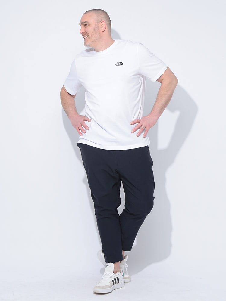 きれいにテーパードが効いたシルエットは、ジャケットを羽織ればオフィス仕様に、