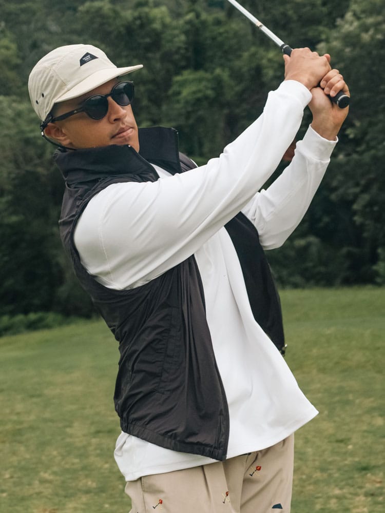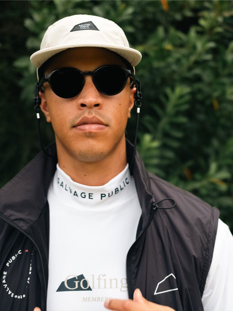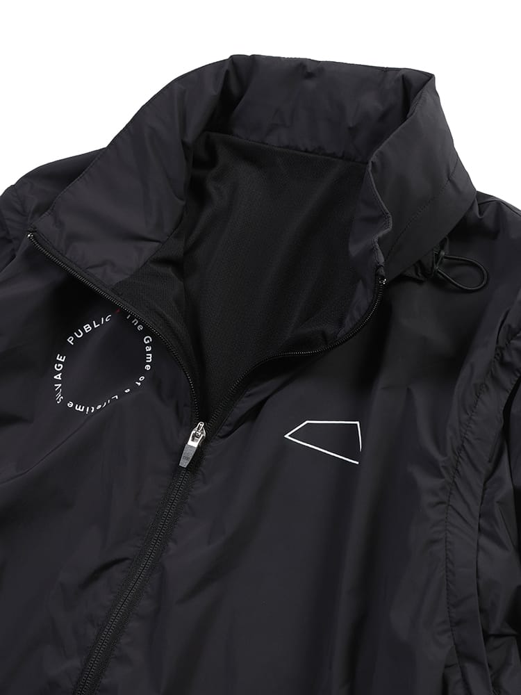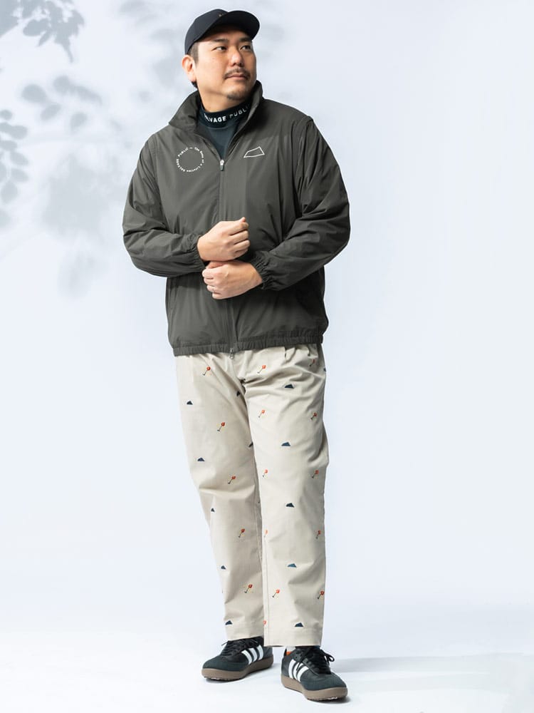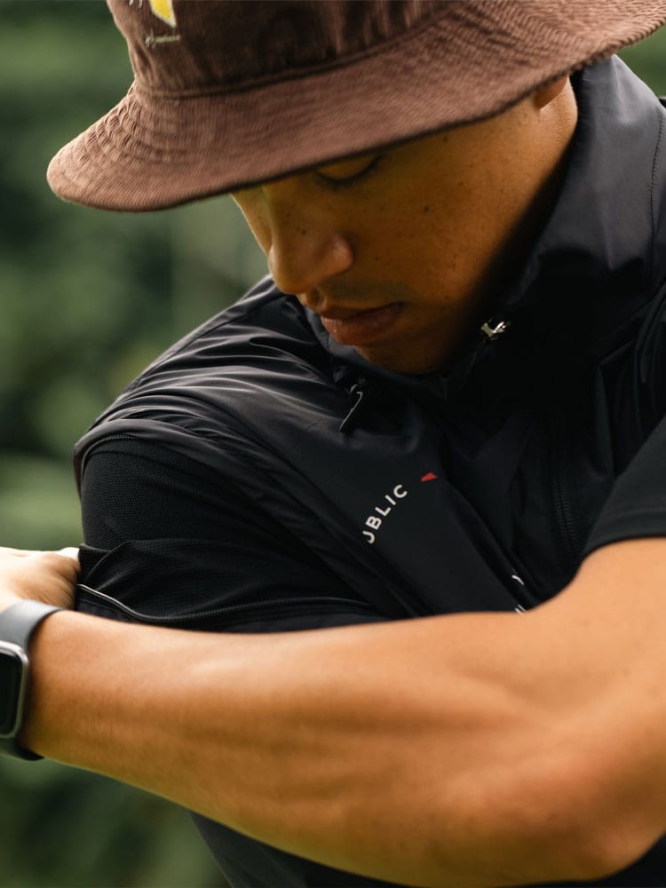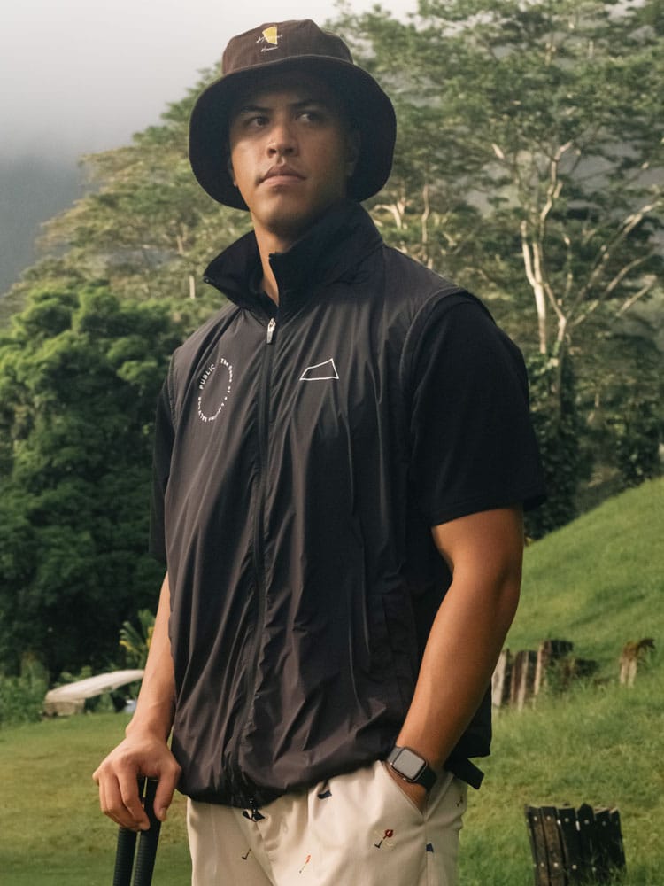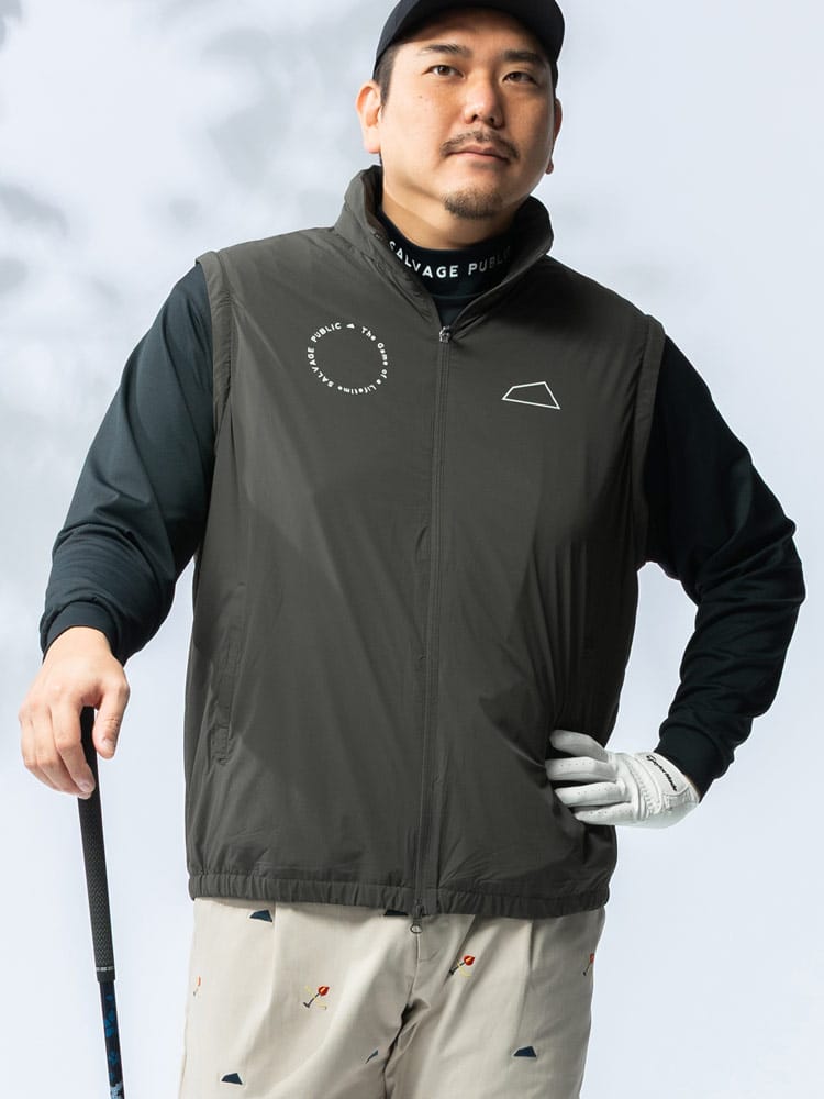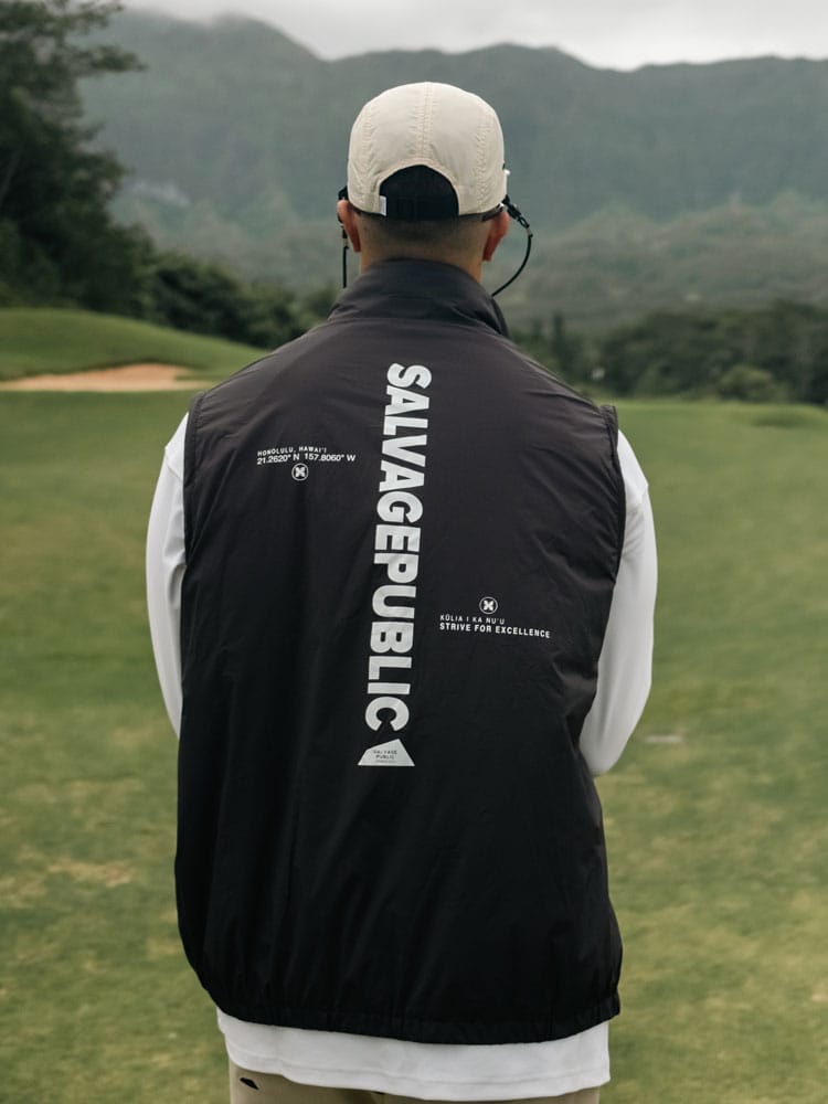 ハワイ発SALVAGE PUBLIC Kolepaのゴルフブルゾンは、天候や気温に応じて袖が着脱でき、ベストとしても使える2WAY仕様。急な雨にも対応できるフード収納型です。撥水性・防風性・ストレッチ性を備えた高機能素材を採用し、ゴルフの動きを妨げません。リゾート感と機能性を両立した、大きいサイズ展開も魅力の一着です。