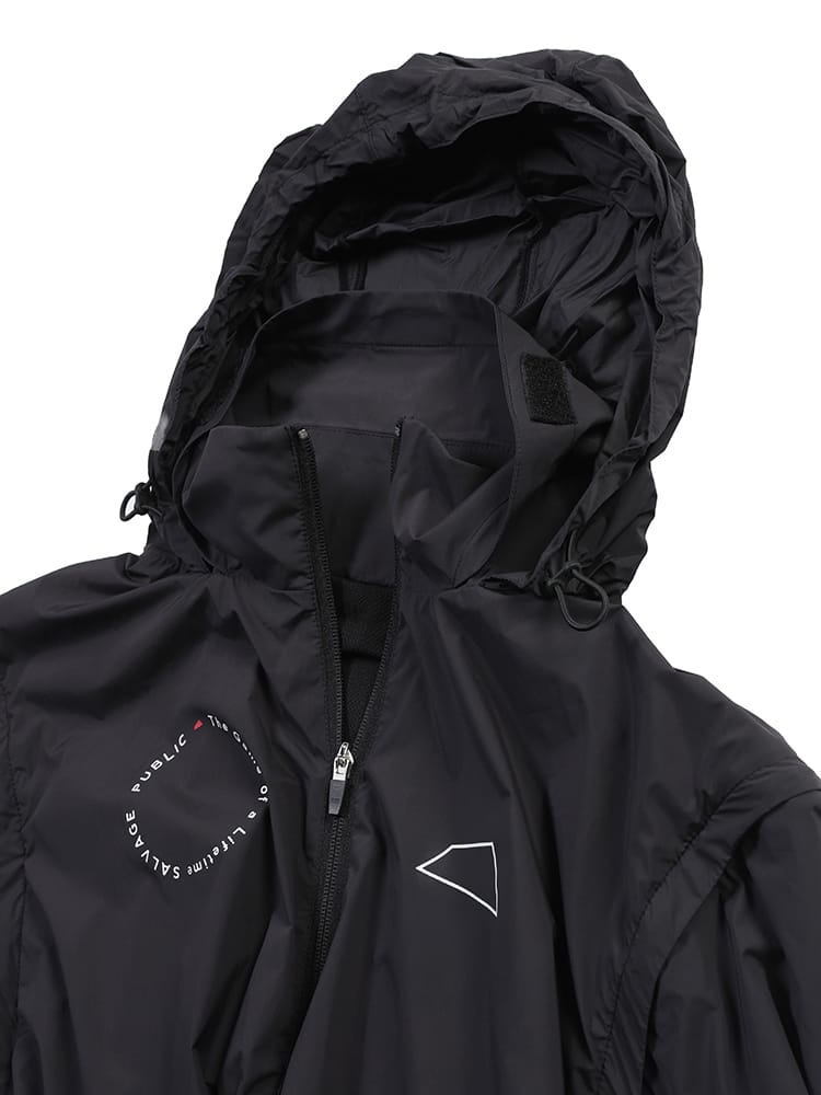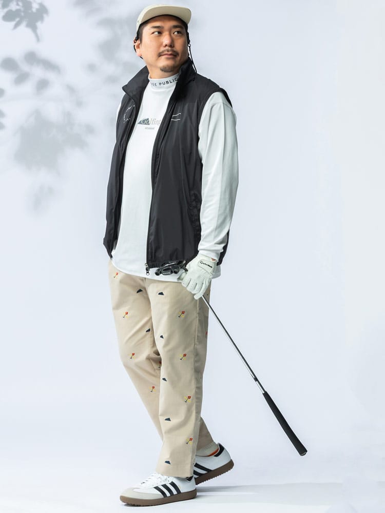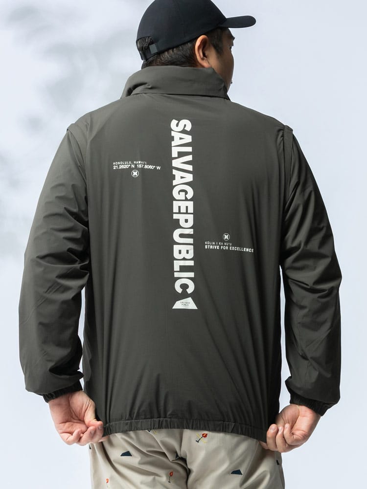 ハワイ発SALVAGE PUBLIC Kolepaのゴルフブルゾンは、天候や気温に応じて袖が着脱でき、ベストとしても使える2WAY仕様。急な雨にも対応できるフード収納型です。撥水性・防風性・ストレッチ性を備えた高機能素材を採用し、ゴルフの動きを妨げません。リゾート感と機能性を両立した、大きいサイズ展開も魅力の一着です。