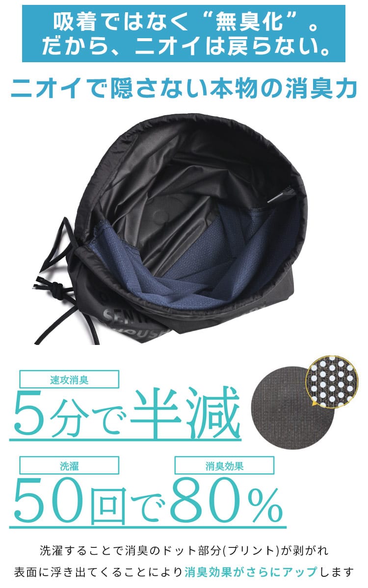 強力な消臭機能と吸汗速乾性を備えた、実用的なマルチ消臭ナップサックです。汗などの気になるニオイを抑える「Nai Odor」を採用しており、スポーツ後の衣類入れやジムサックとして快適に活用できます。サカゼン80周年記念ロゴがアクセントのシンプルなデザインで、性別を問わず使用可能です。バッグ内の整理に便利な巾着タイプで、日常の外出からアクティブなシーンまで清潔に持ち運べる便利なアイテムです。