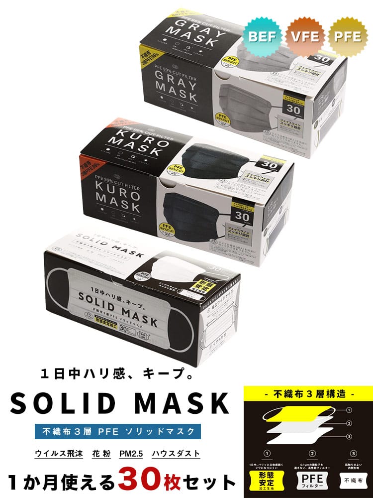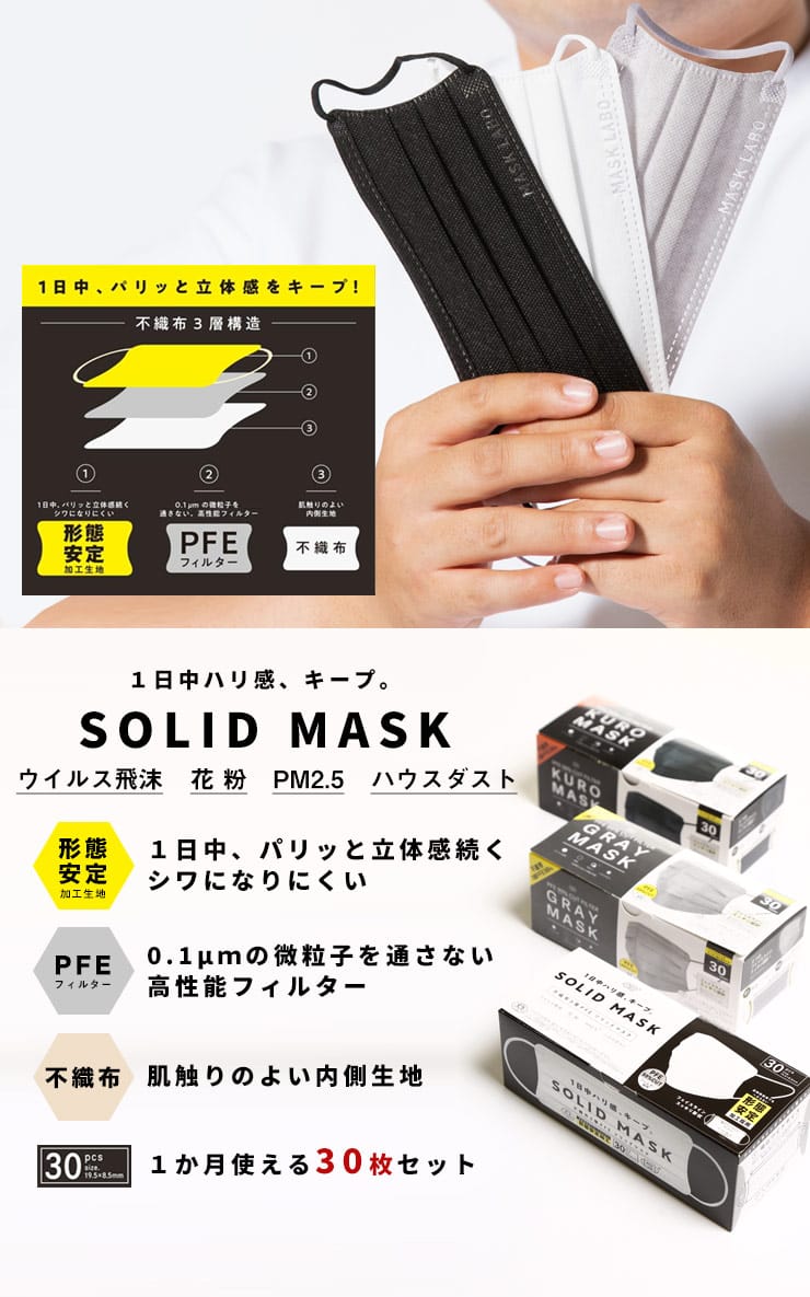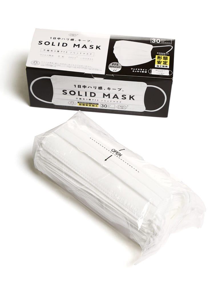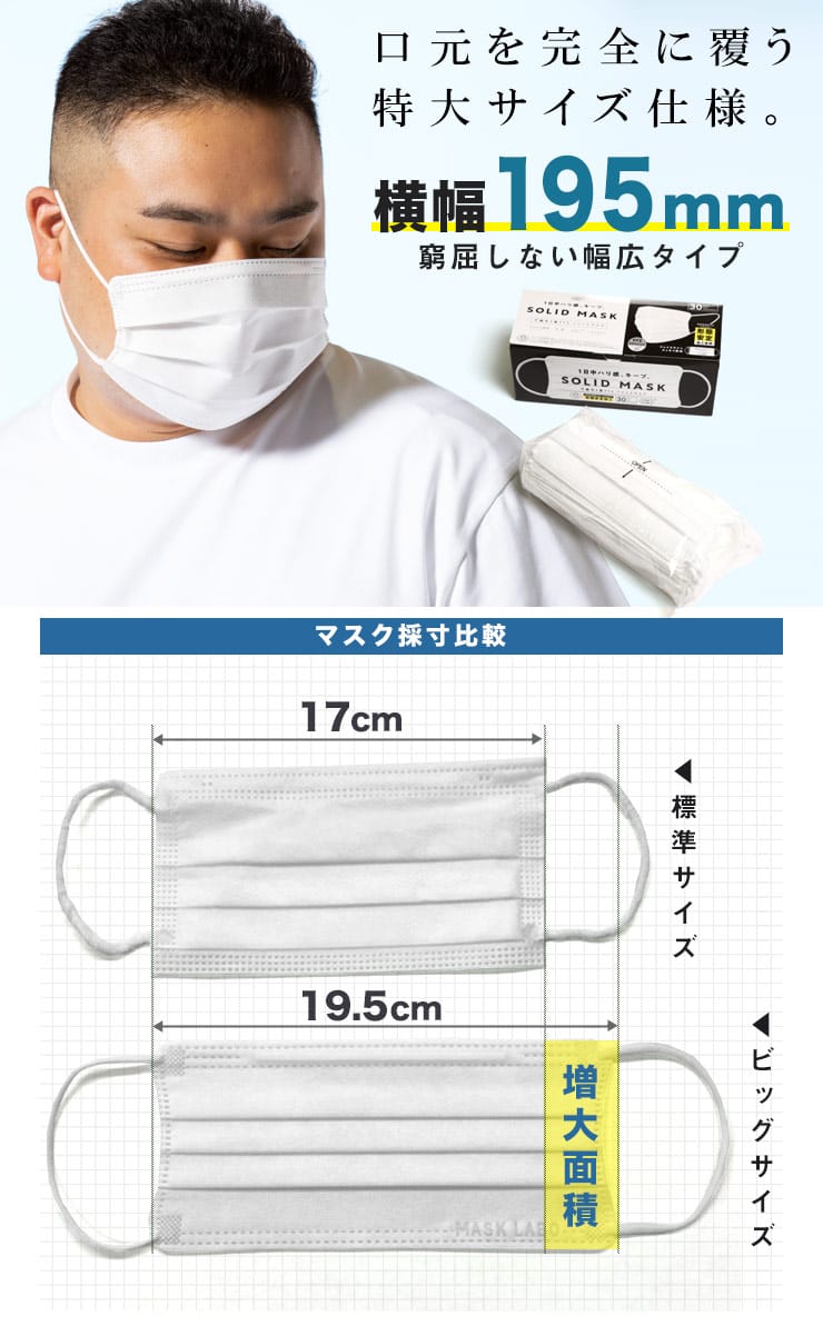 大きいサイズ メンズ SAKAZEN (サカゼン) SOLID MASK 形態安定 ワイドサイズ 不織布 マスク 30枚 花粉症対策 超大きめ 耳痛くない 3層構造 使い捨てpfe認証 不織布 男性用 女性用 防花粉 ウイルス防止 飛沫防止