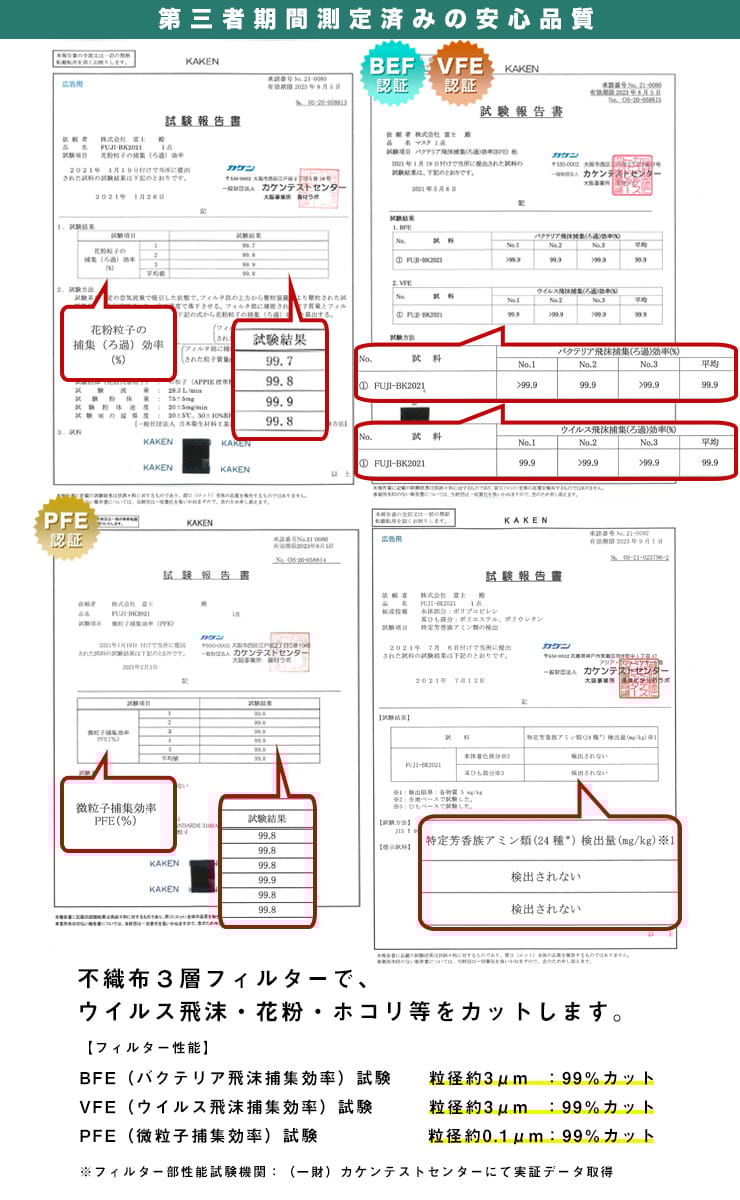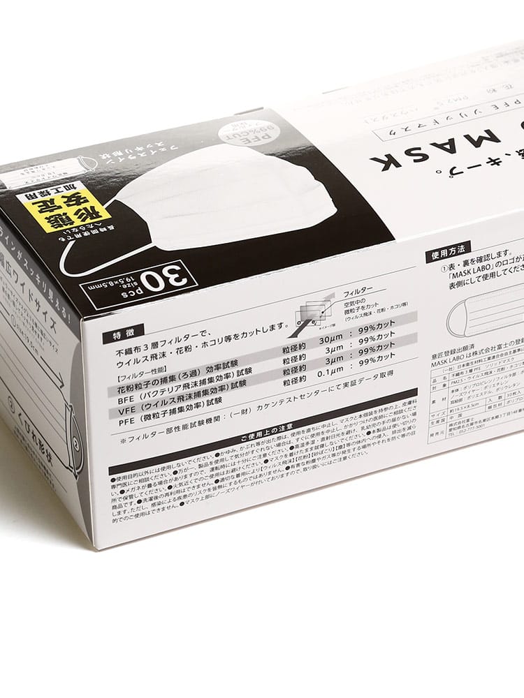 仕様 :PFEフィルターで0.1?以上の微粒子を99%カット / ウイルス飛沫・花粉・PM2.5・ハウスダストをカット / フェイスラインスッキリ設計