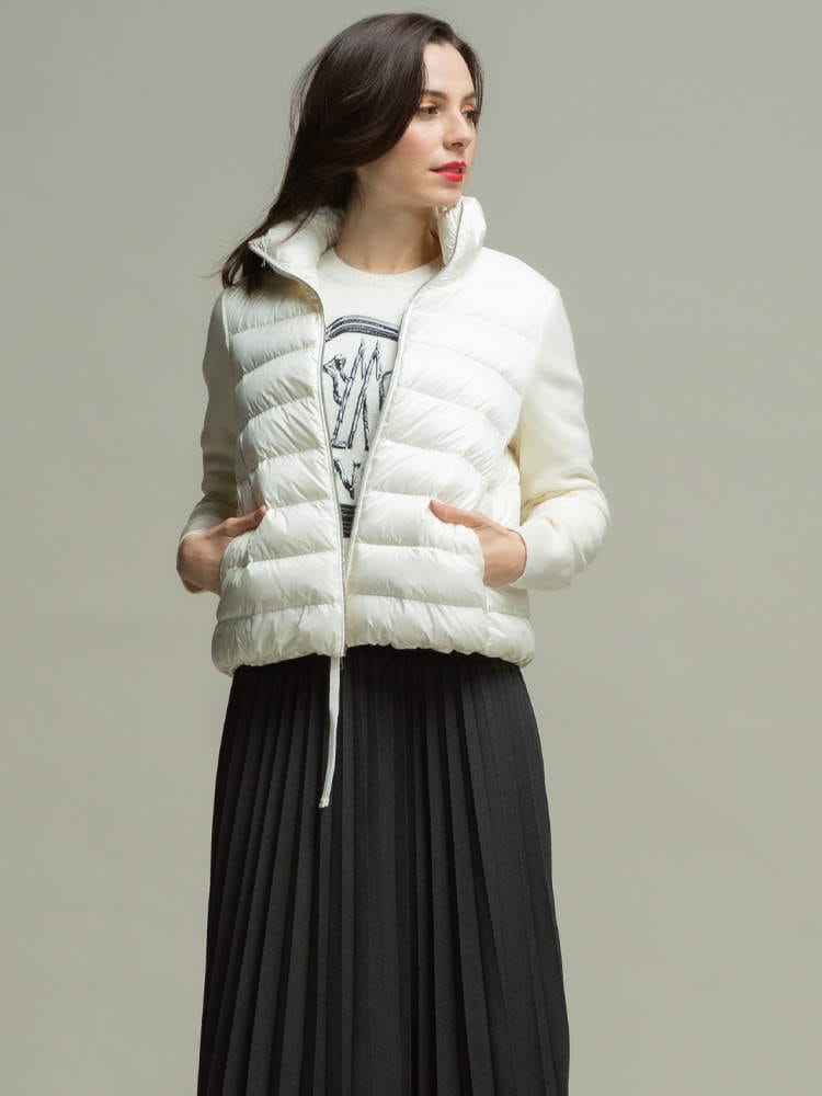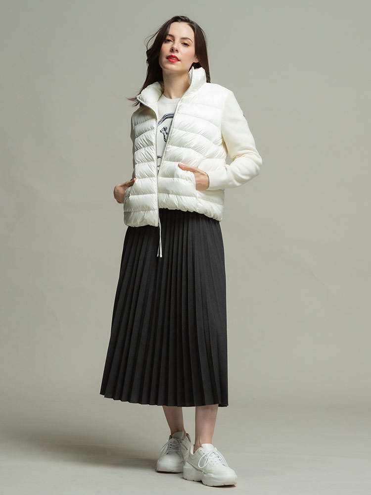 ・切り替えデザインのニット切り替え フルジップ スタンド ダウンジャケットbr>・袖をニットで切り替え