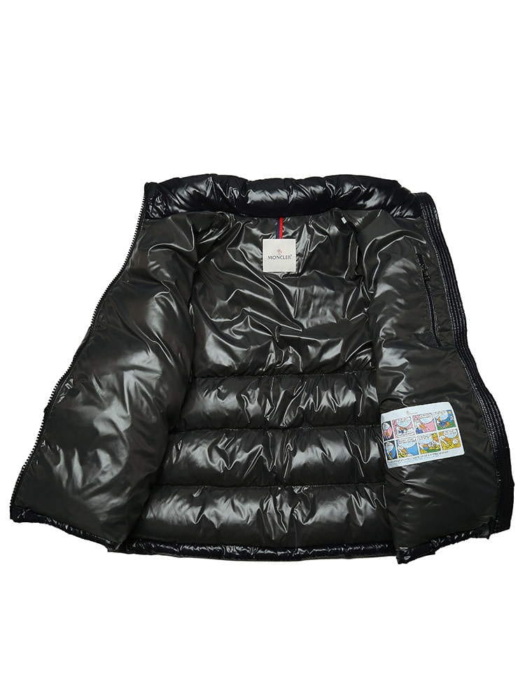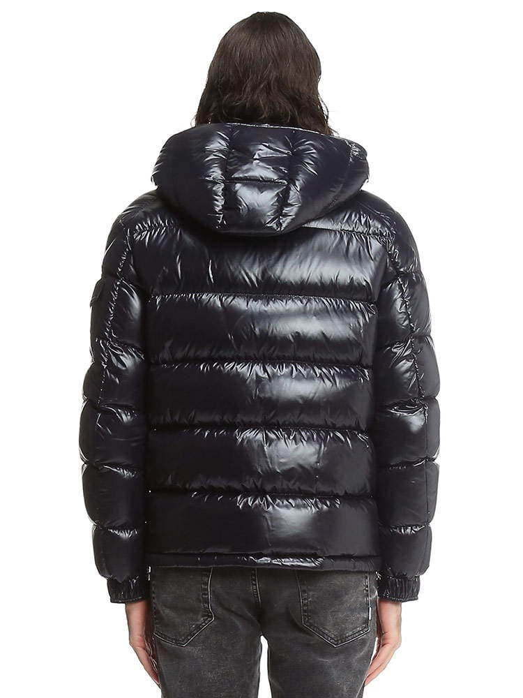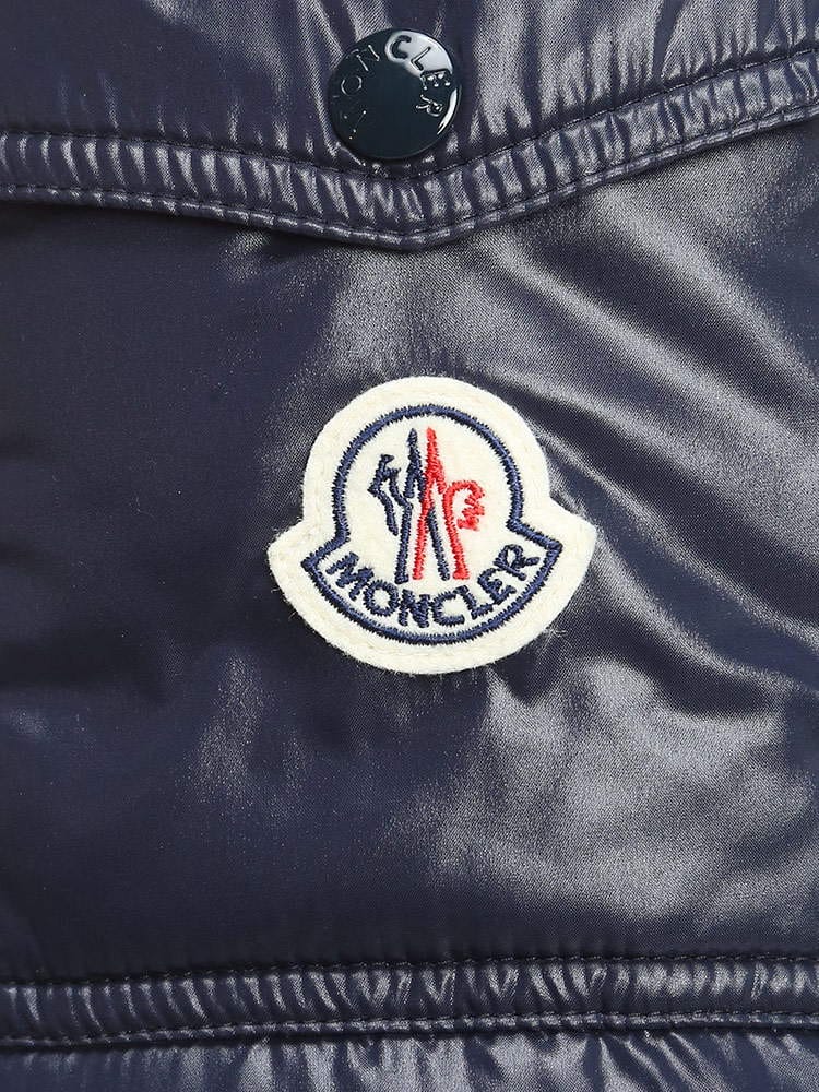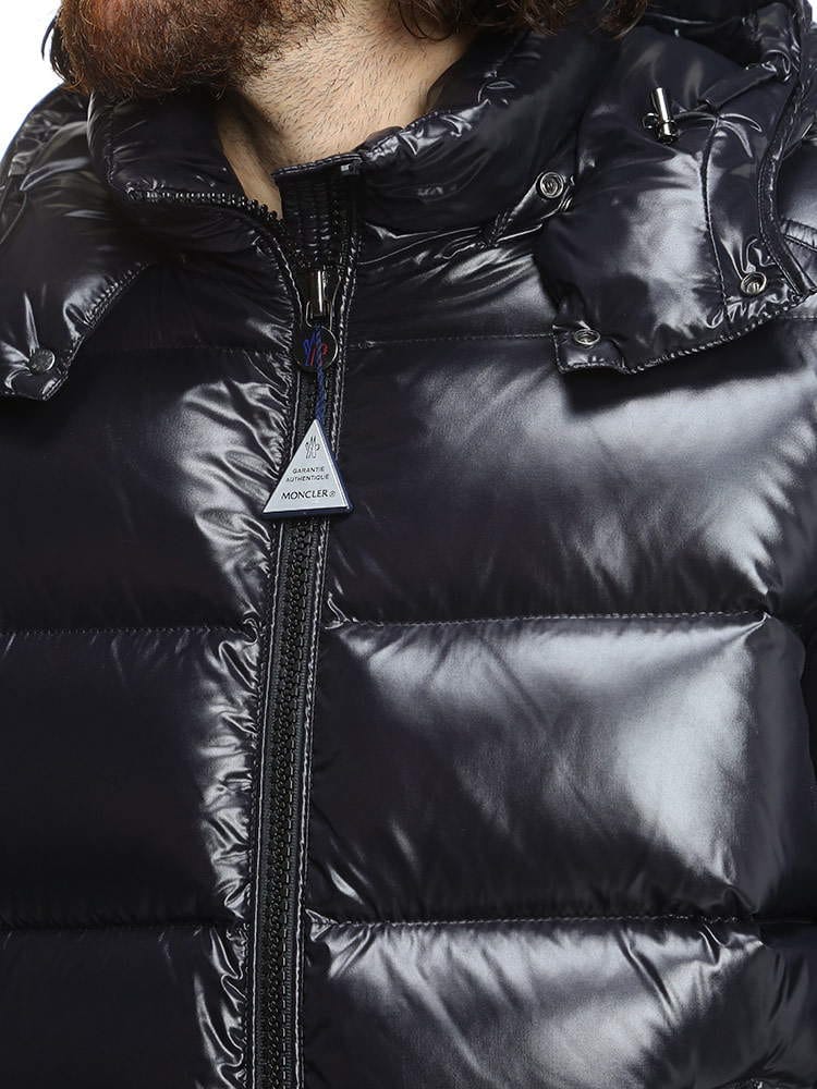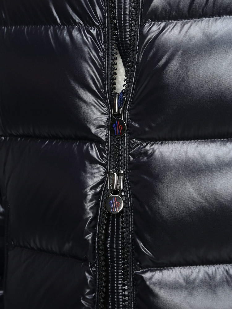 ・ナイロンラケ素材を使用・ナイロンラケ素材の裏地・ダウンパディング入りでボーダー状キルティング仕上げ・取り外せるフードはスナップボタン付で、ドローストリングで調節可能・ツーウェイジッパーでクローズ・表側にジッパーと内側にポケット付・エラスティックな袖口はスナップボタン付・裾はドローストリング使い・袖にフラップ付パッチポケット・袖にMonclerフェルトロゴ