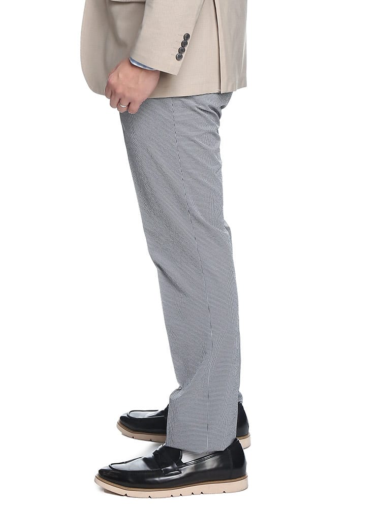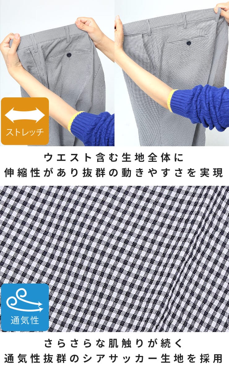 このノータックスラックスは、ストレッチ素材とウエストストレッチ機能を備え、通気性が抜群のシアサッカー生地で作られています。ゴルフからビジネス、カジュアルまで、あらゆる場面に適しています。快適な着心地と動きやすさを提供し、スタイリッシュな外観も兼ね備えた多目的なアイテムです。