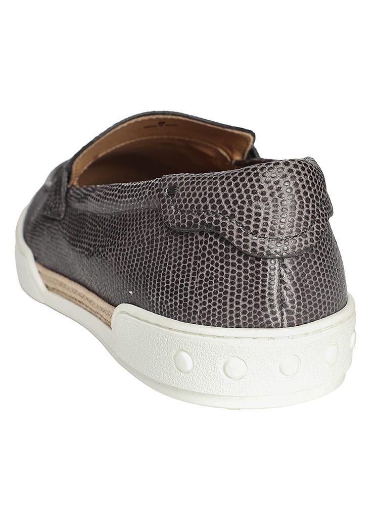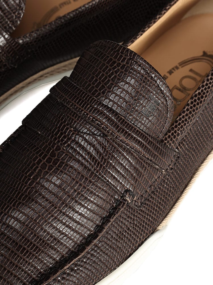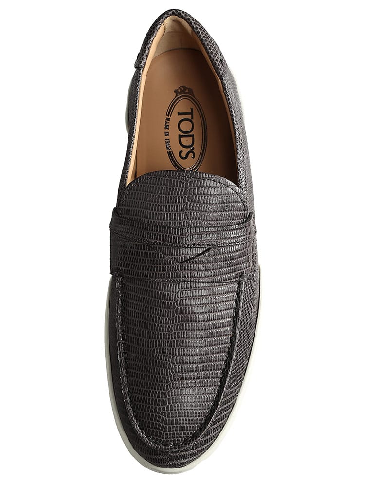 上質なレザーにパイソン柄の型押しを施し、高級感を演出。麻素材のラインがカジュアルなアクセントとなり、足元に奥行きを生み出します。履くほどに足に馴染む、至極の履き心地も魅力。カジュアルからビジネスまで幅広く活躍する一足です。
