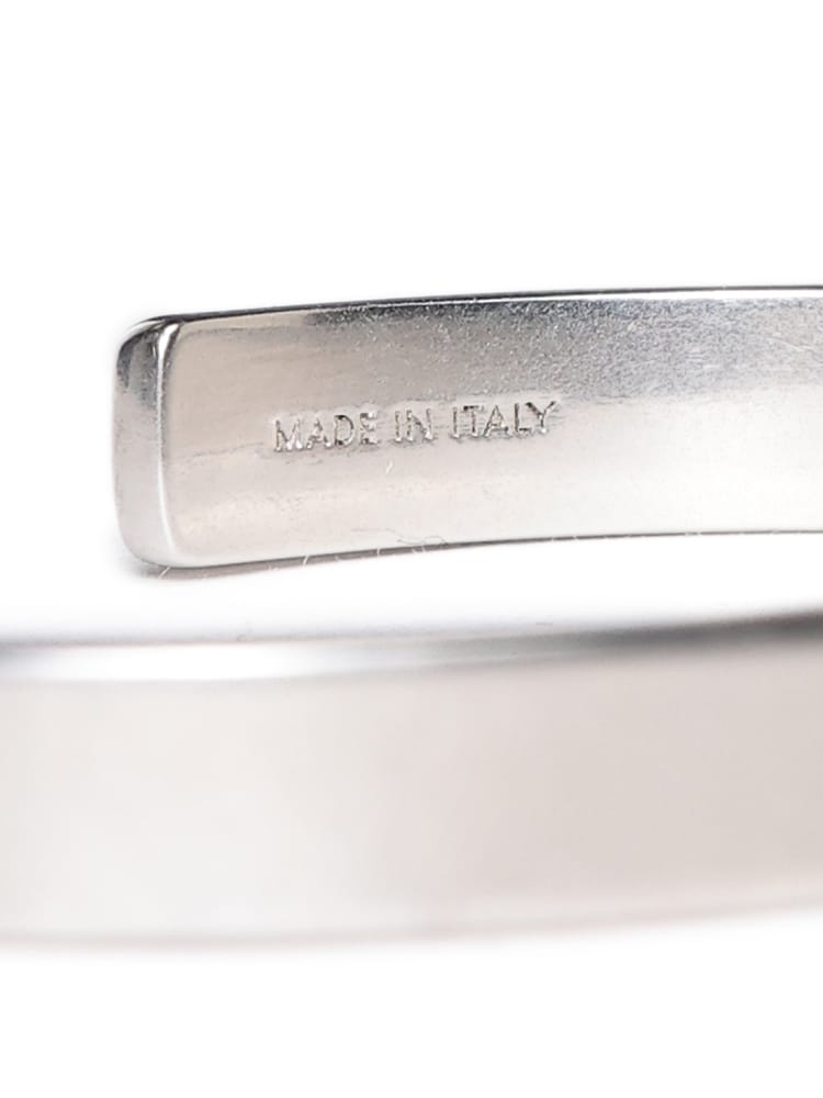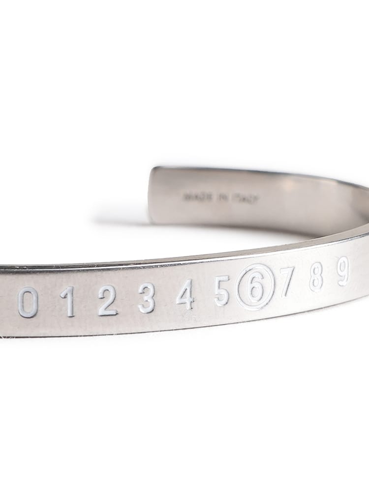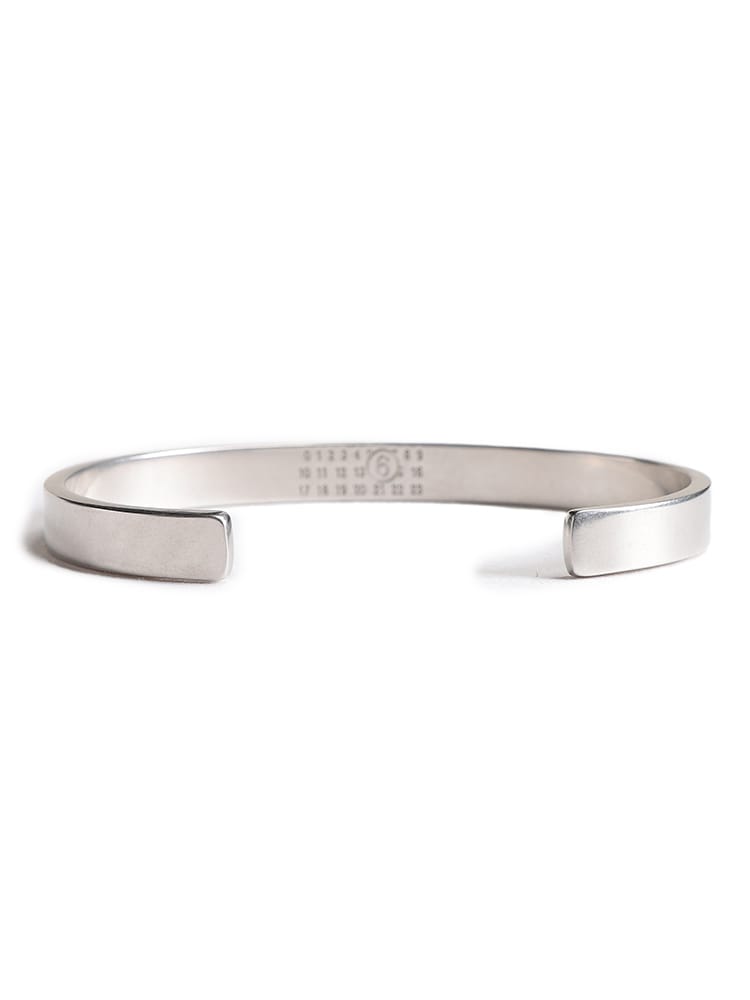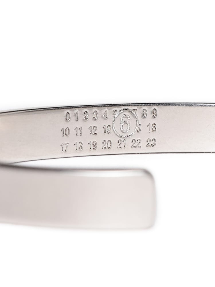 シルバー仕上げの真鍮製ブレスレットカフ。フロントに刻印されたMM6のニューメリックシグネチャーが、ブランドのエッセンスを体現しています。大胆なミニマルデザインは、現代的な洗練さを放つクリーンなラインが特徴。時代を超えた個性と自己表現の象徴です。