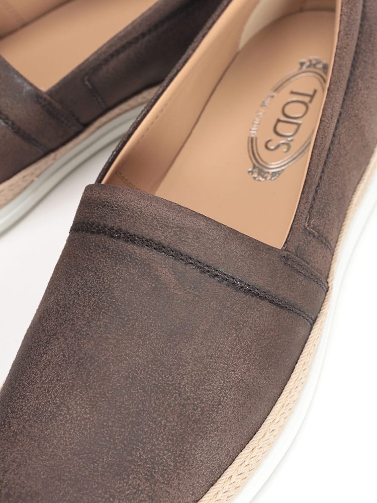 上質なヌバックレザーを使用したスリッポンです。柔らかな素材感が足元に心地よくフィットし、リラックスした履き心地を提供します。シンプルながらも洗練されたデザインで、カジュアルスタイルに上品なアクセントをプラス。デイリーユースはもちろん、ちょっとしたお出かけにも最適です。