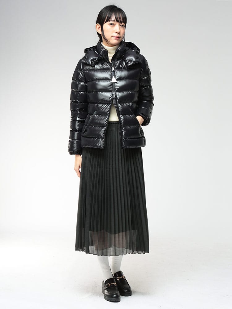 定番人気モデル「BADY」は、女性らしさを引き立てるシェイプされた美しいシルエットが魅力のショートダウンジャケットです。光沢のあるナイロン素材と左肩のアイコニックなロゴパッチが、シンプルながらも洗練された存在感を放ちます。フードは取り外し可能で、カジュアルからエレガントまで幅広く活躍。